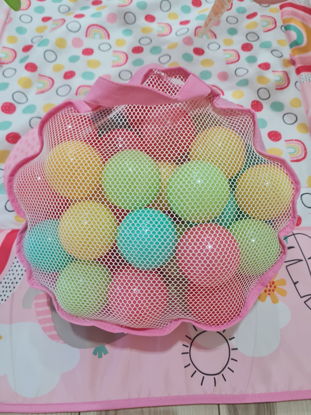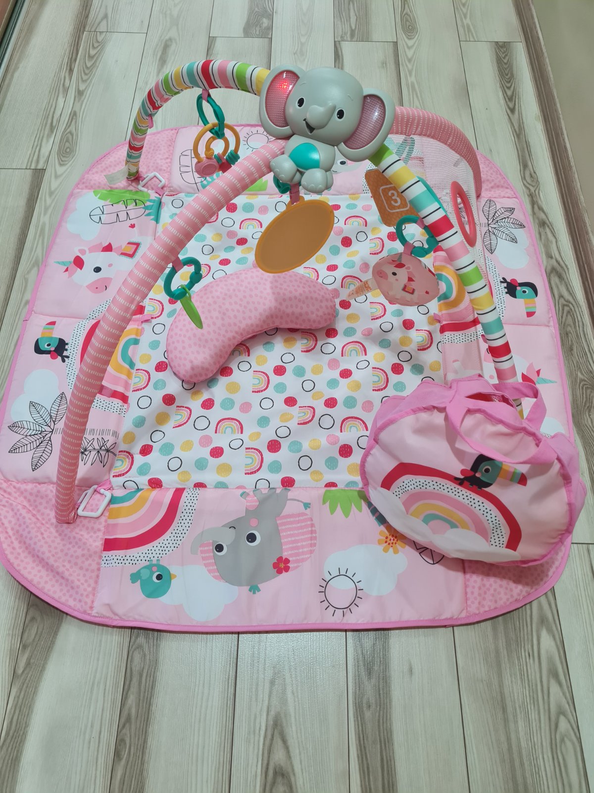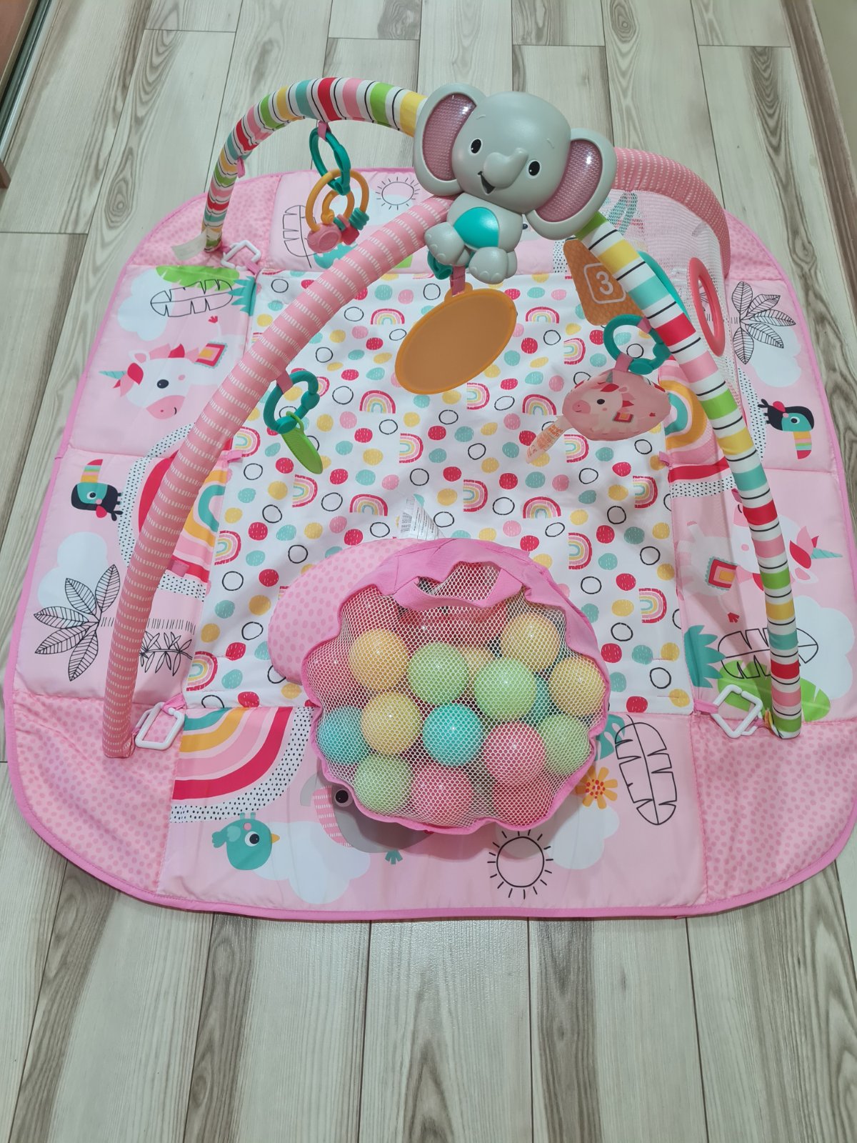 Pestrá podložka na hranie zaujme každé dieťa, dá sa zložiť, aj s oblúkmi, je prateľná, aj so závesnými zvieratkami.