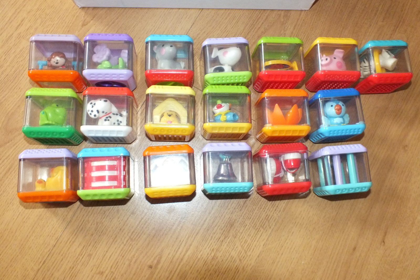 Ponukam na predaj vyborné hracie kocky a gule pre male deti tak od roka do troch. kazda kocka alebo gula obsahuje vnutri nejaku zaujimavost, co sa hybe. Niektore sa dajú stlacat, alebo posuvat, otacat mechanizmom cim sa vnutri postavicky rozhybu. zaroven je mozne sa s nimi hrat ako s klasickymi kockami. Je to kvalitny plast, znacka Fisher Price, kupovane v IE, jedna kocka stala cca 3,5 eura. Nerzbitne, neznicitelne. U nas nebolo predajne. na foto je 11 guli, predava sa len 10 (jedna patri do specialneho auta v ktorom sa pretaca tiez Fisher Price). ponukam spolu za cenu 30 eur, pripadne aj s pretacacim autickom (este odfotim) do ktoreho sa gule daju vkladat za 38 eur.