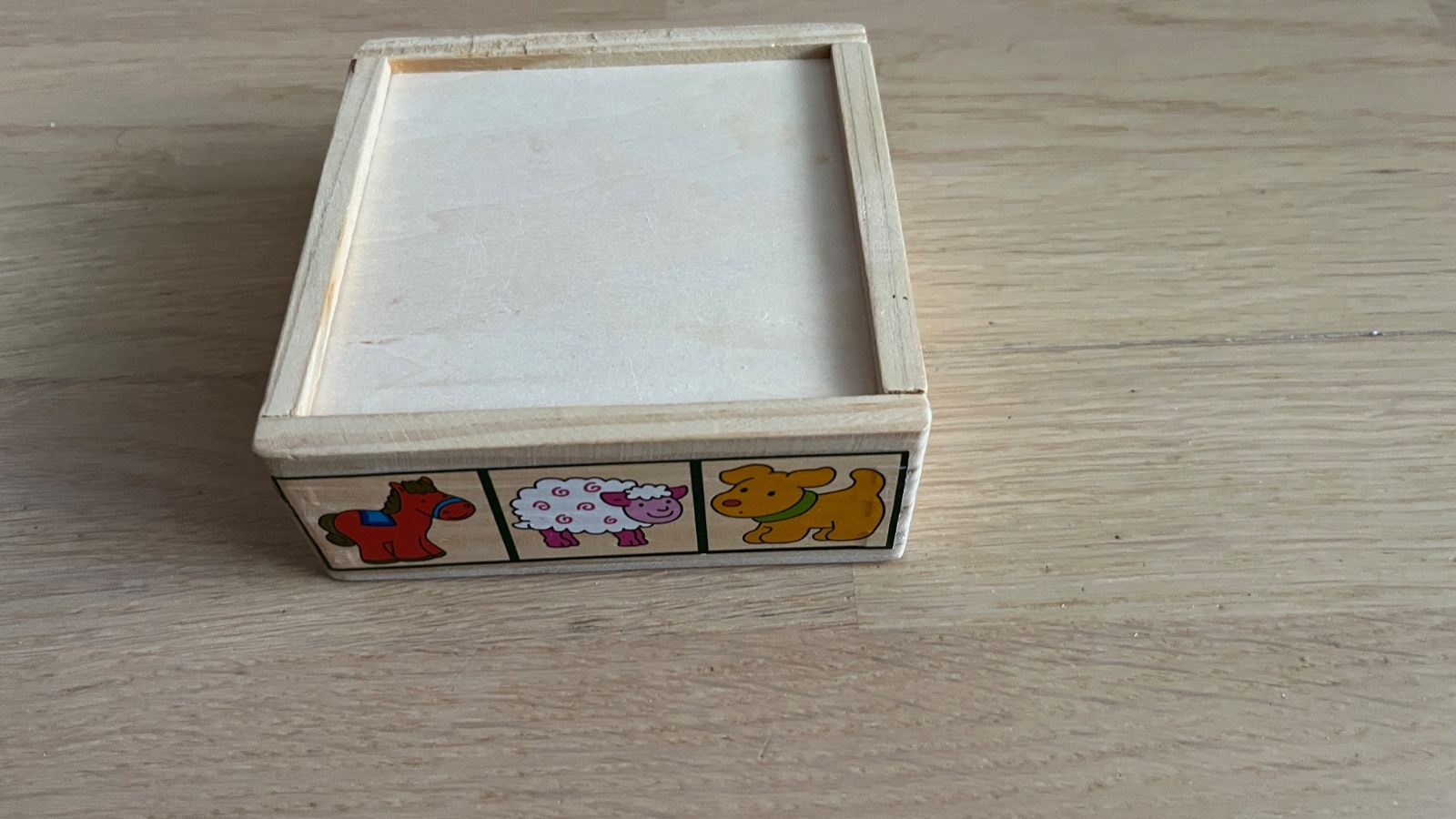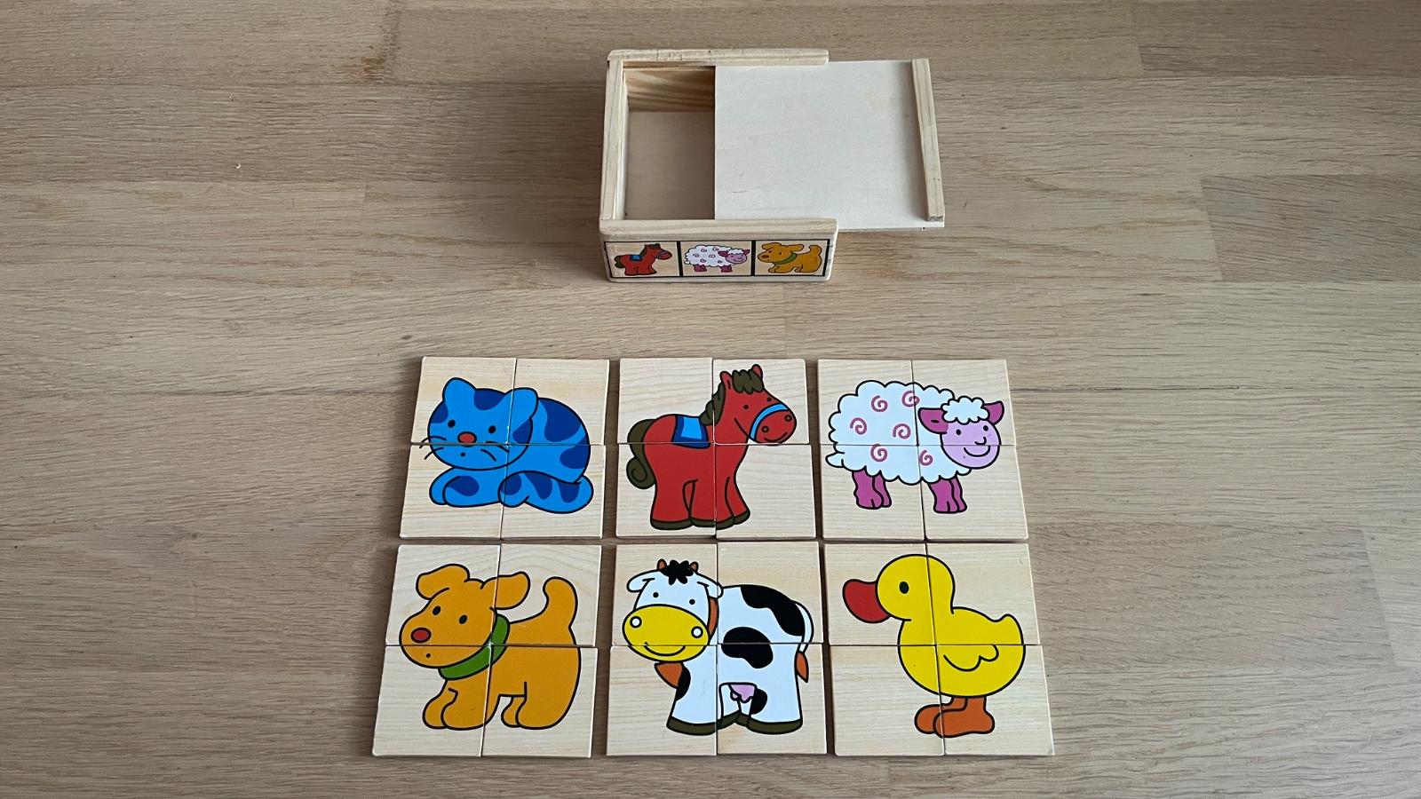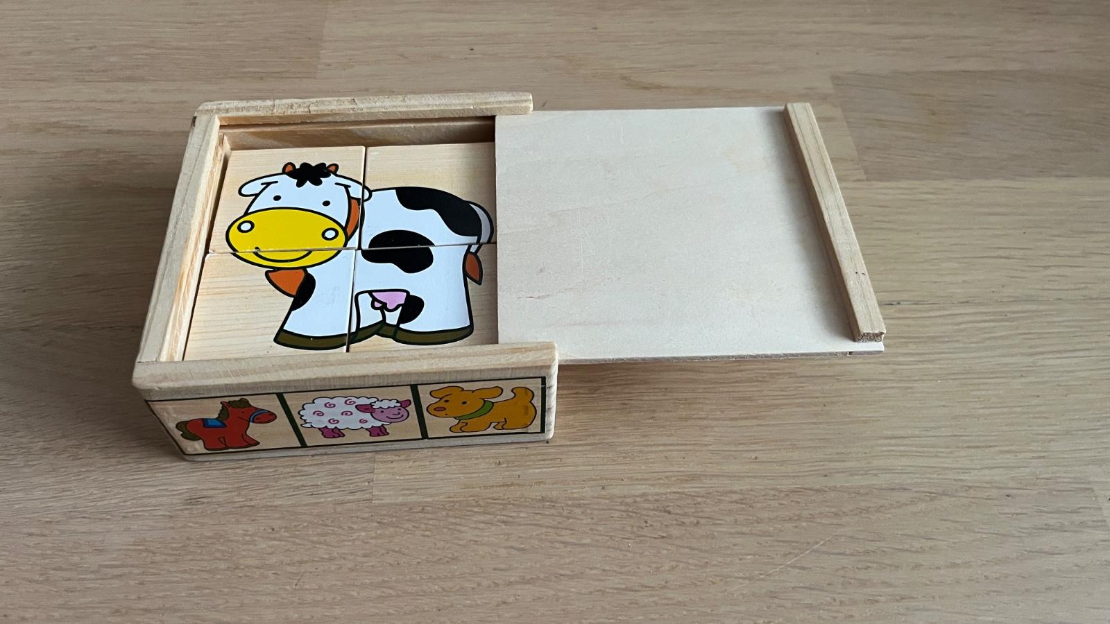 Drevené puzzle pre najmenších uskladnené v praktickej drevenej krabičke. Každý obrázok sa skladá zo štyroch dielikov.