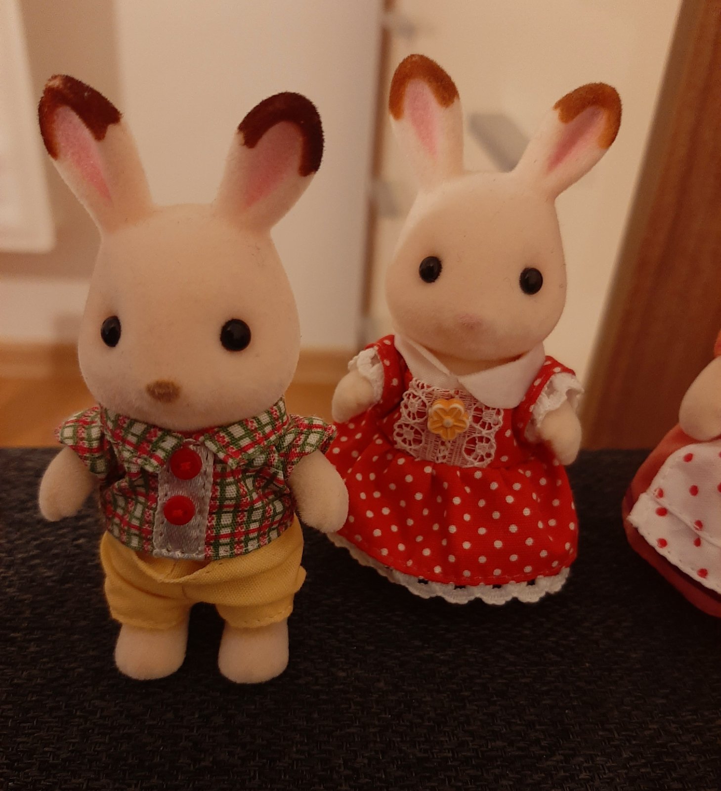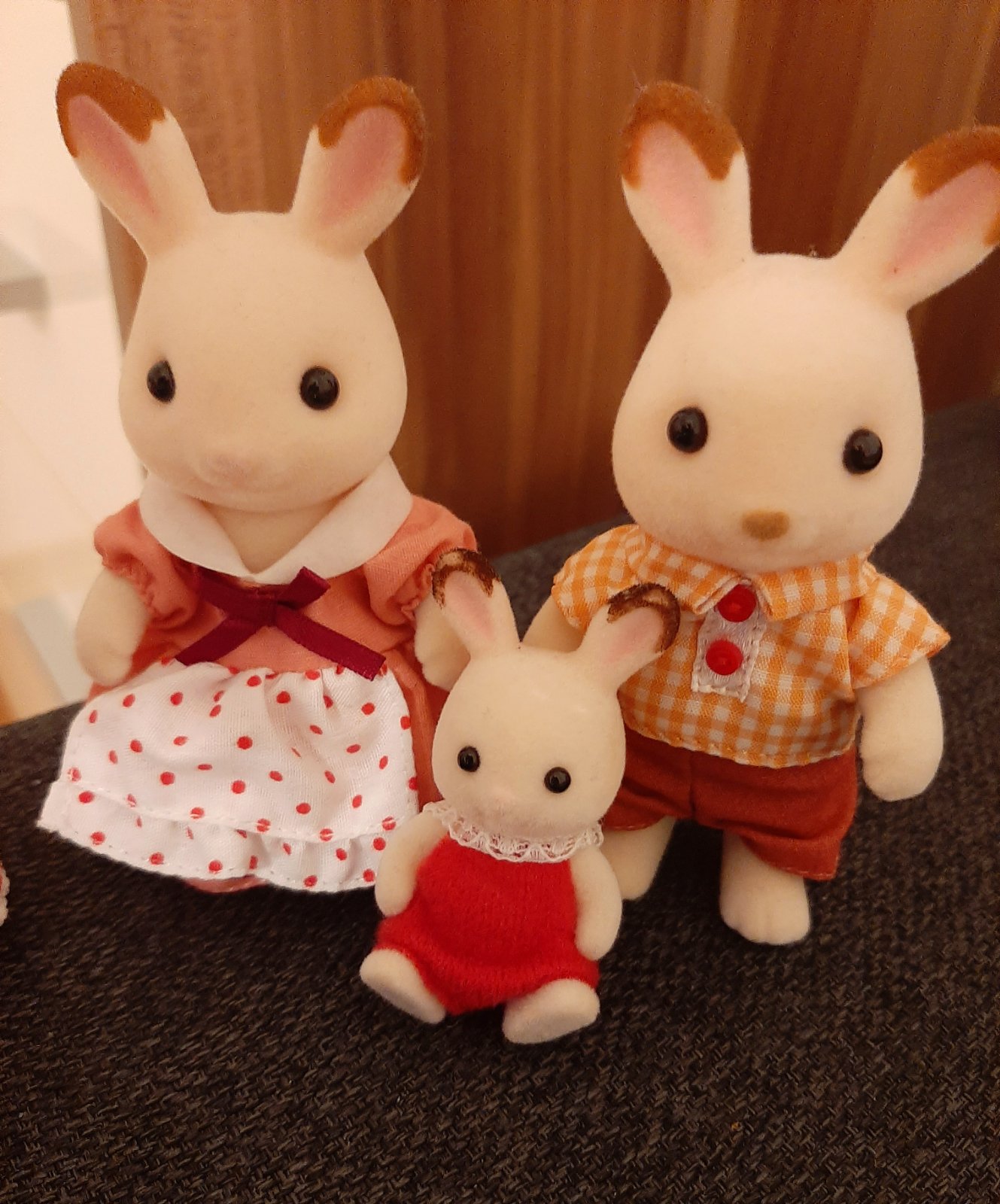 Rodina čokoládových zajačikov, set obsahuje štyri zamatovo hebké figúrky, majú pohyblivé končatiny a hlavu, oblečené sú v detailnom, odnímateľnom textilnom oblečení. Nové,deti nebavilo sa s nimi hrať.