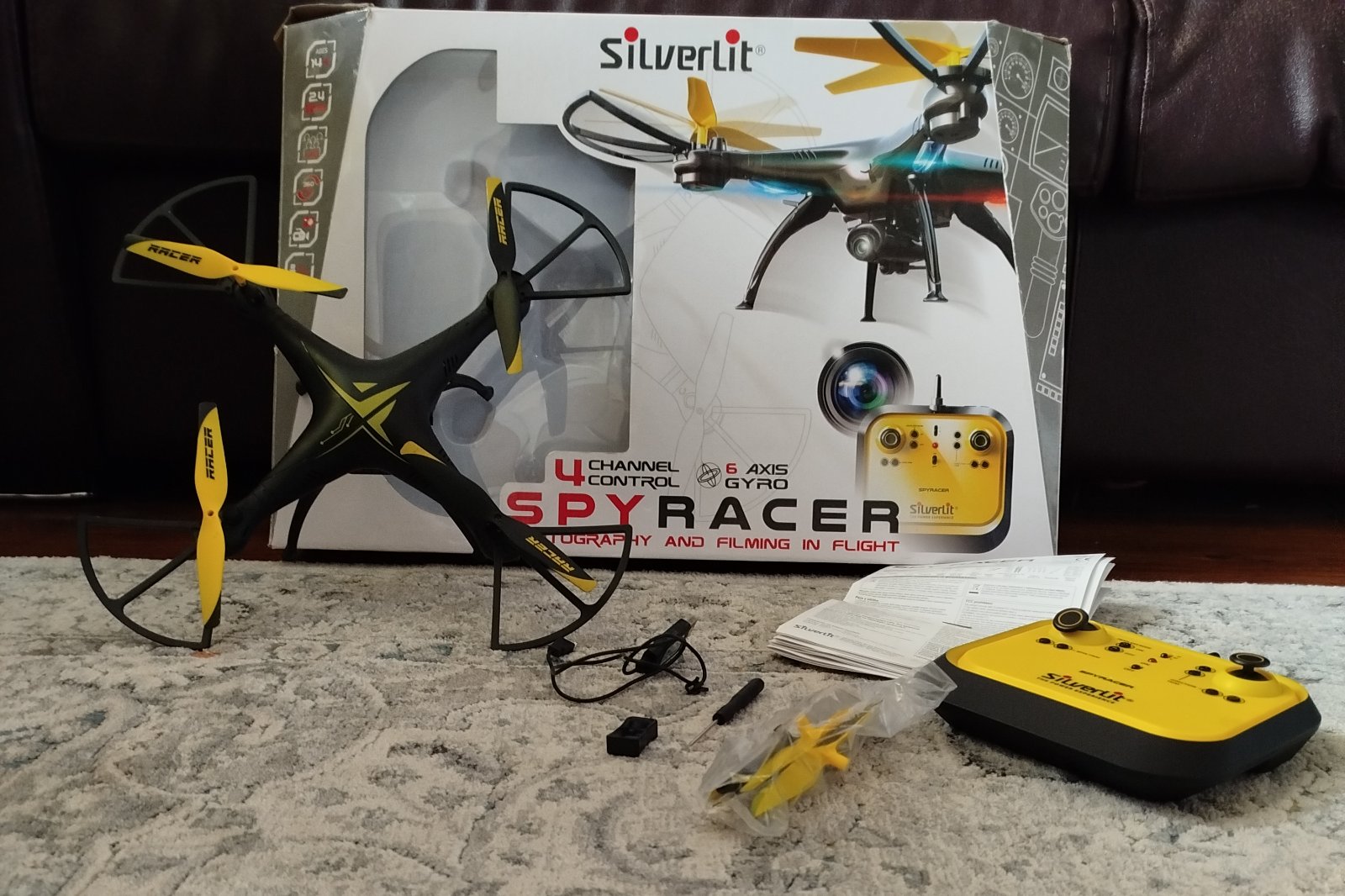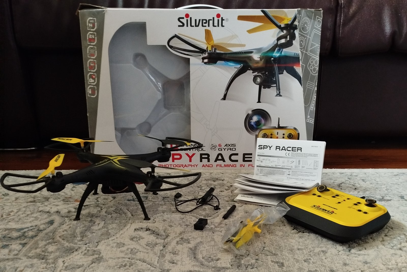 Dron Silverlit Spy Racer, hraný pár krát. Je plne funkčný, okrem červeného svetielka, ktoré nesvieti. Dron lieta a natáča na kameru okolie, pokiaľ túto funkciu zapnete. Cena + pošta.