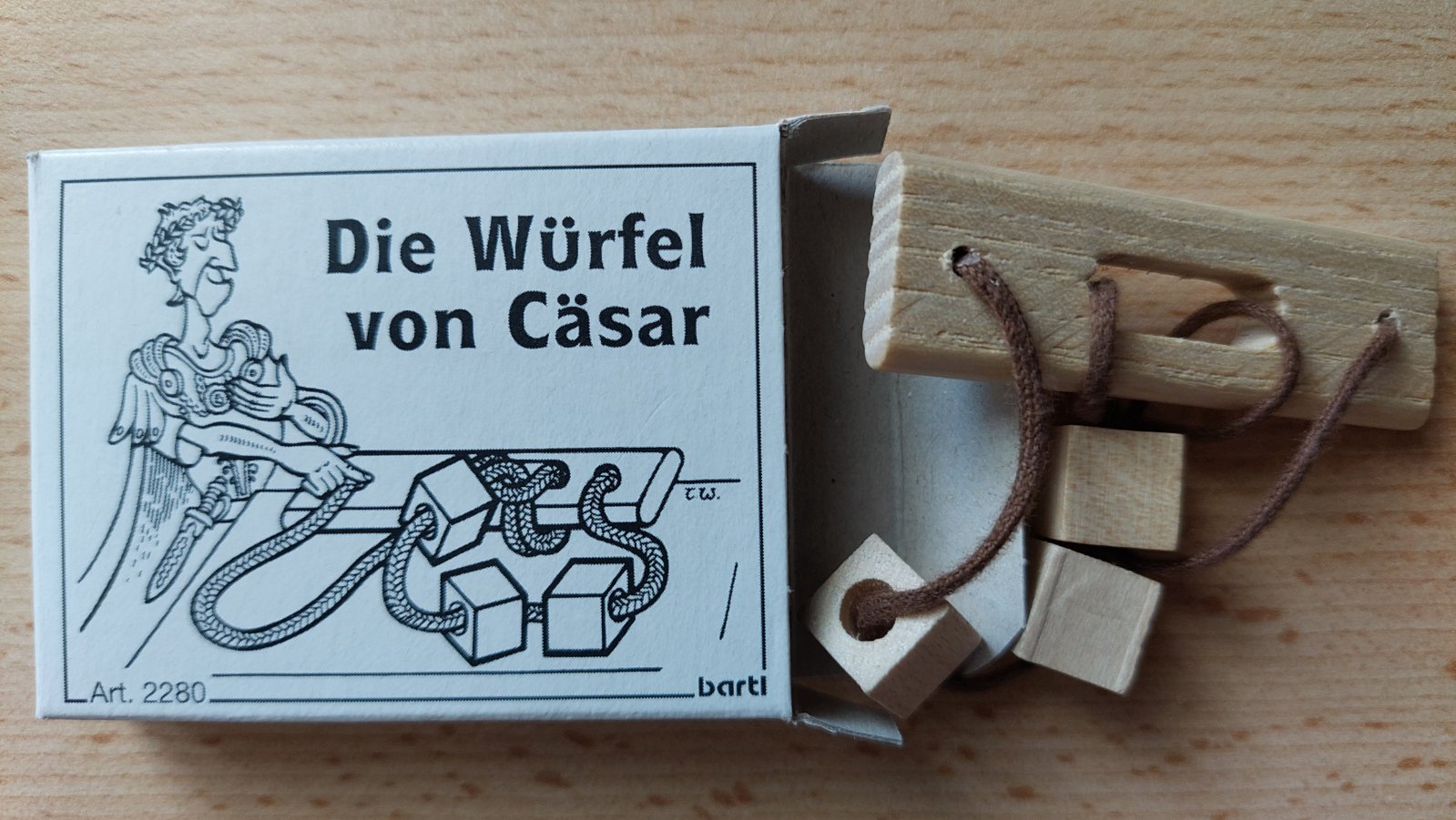 Cezar miloval hry s kockami. Aby svoje tri kocky nestratil, priviazali mu ich na šnúrku. Rozmotajte šnúrku s kockami. Tento malý drevený hlavolam je skutočnou klasikou!