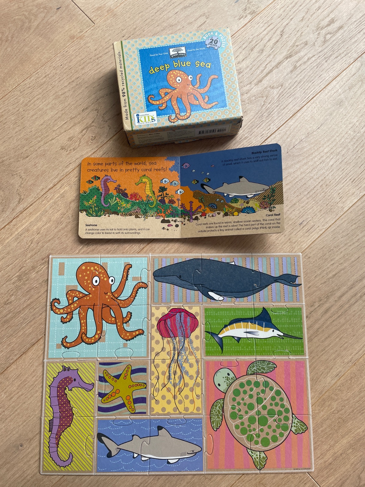 Ponúkam úžasné puzzle pre najmenšie detičky. K tomu je aj kniha v anglickom jazyku. Na chvoste veľryby jr trochu vidno kartón. Je veľmi intersktívne a farebné. Vrelo odporúčam. Cena bez poštovného.