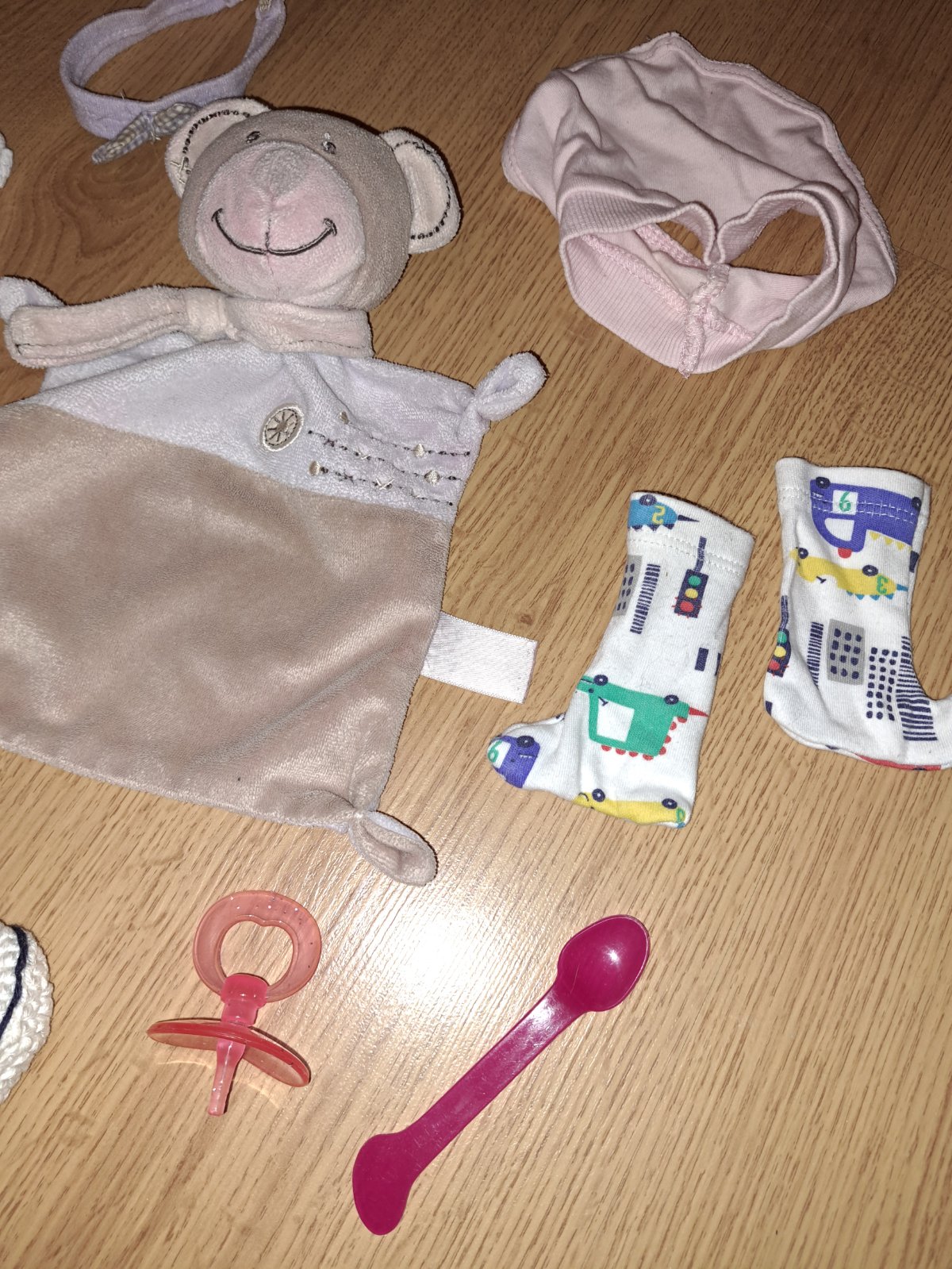 Cena za celý set. Oblečenie (body, pancuchy, topánky, ponožky)a doplnky pre bábiku (cumeľ, lyžička, čelenky) a mojkáčik macko