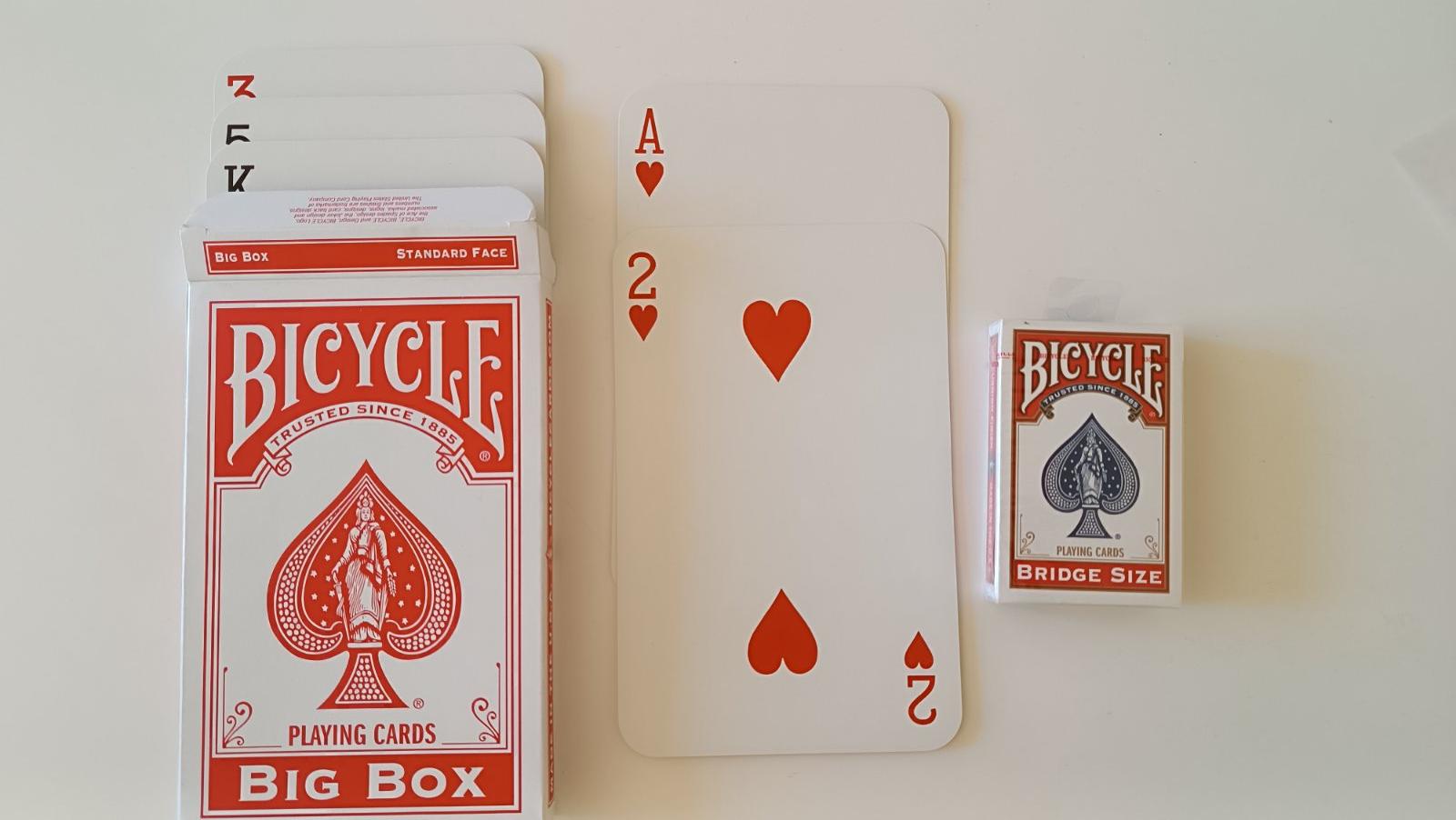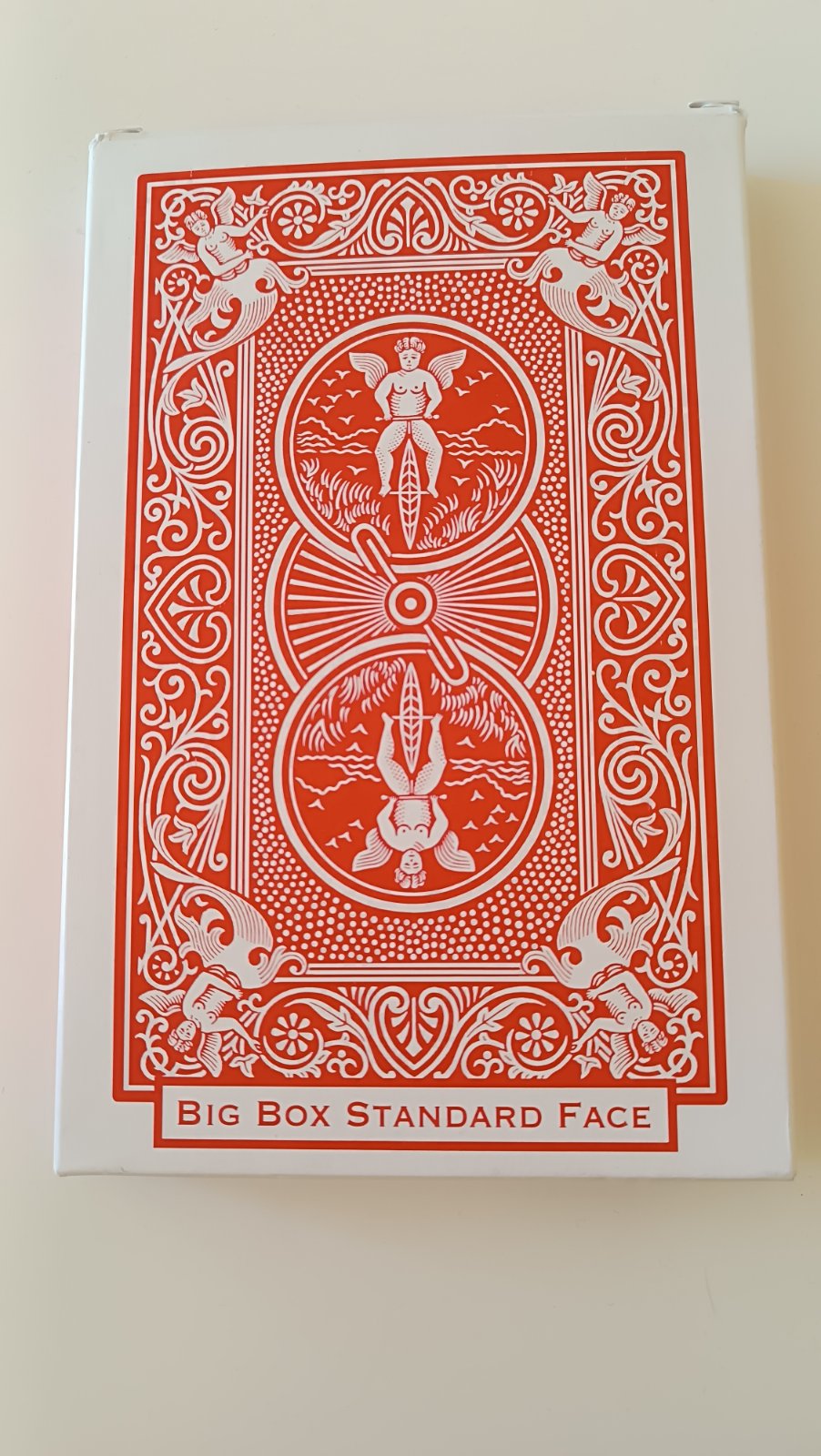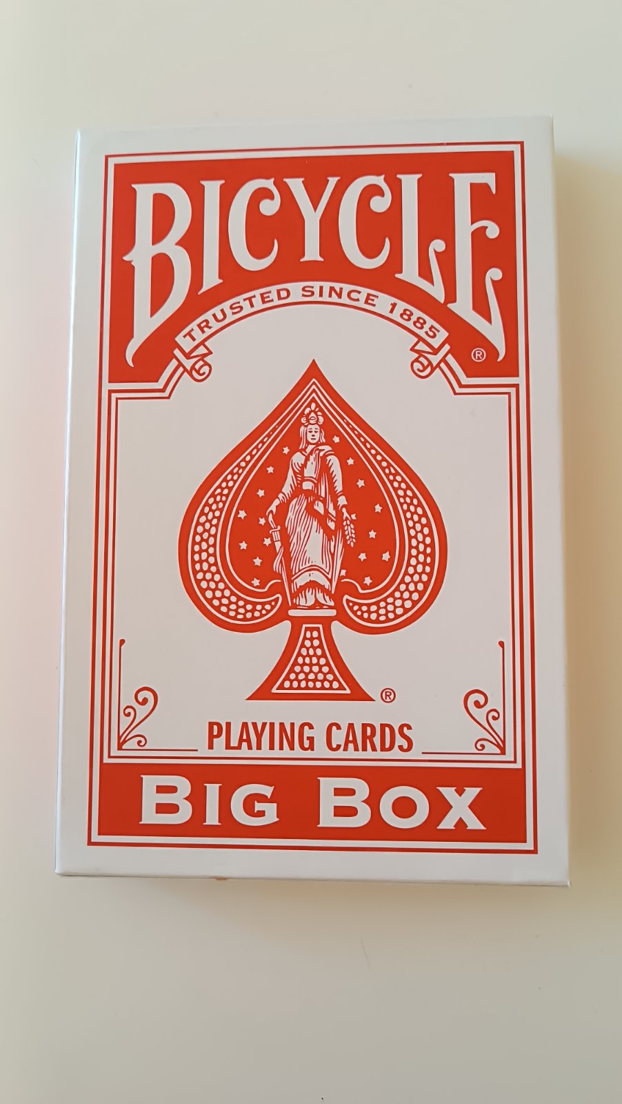 Kúzelnícke karty Big Box, sú veľké, rozmer 18x11 cm, na poslednej fotke sú odfotené s klasickými kartami. Sú určené pre kúzelníkov,, pre tých ktorí sa učia kuzlit s kartami. Dostali sme, pre nás nevhodný dar.