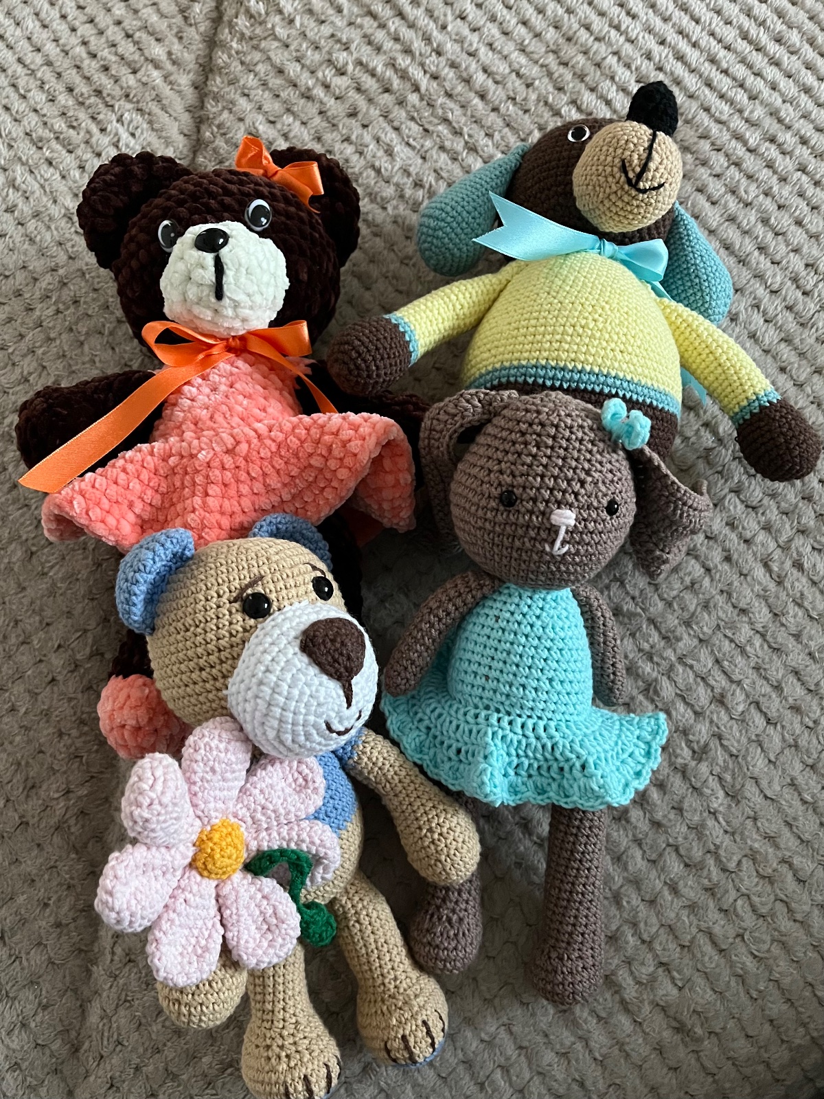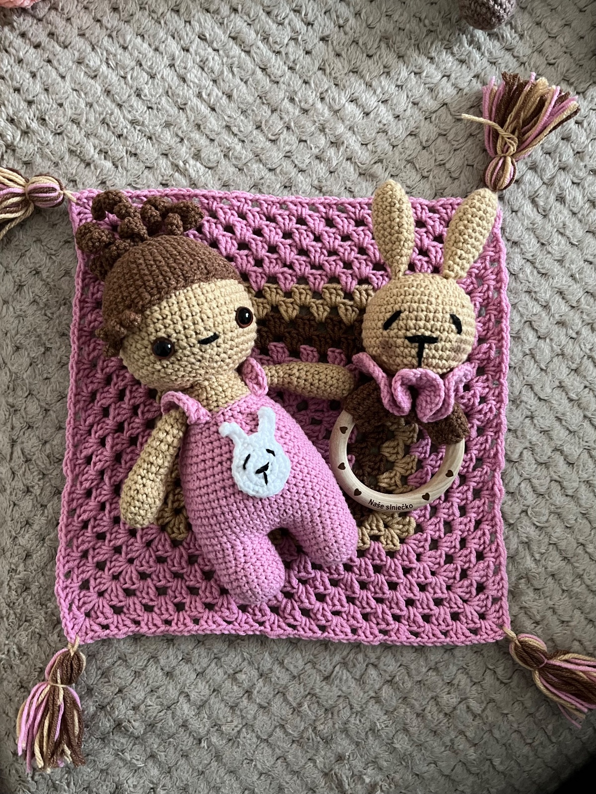 Predám ručne hačkované zvieratká. Sú plnené dutym vláknom. Nové, nepoužívané. Bábika s drdolmi je hrkálka. Cena je za 1 ks.