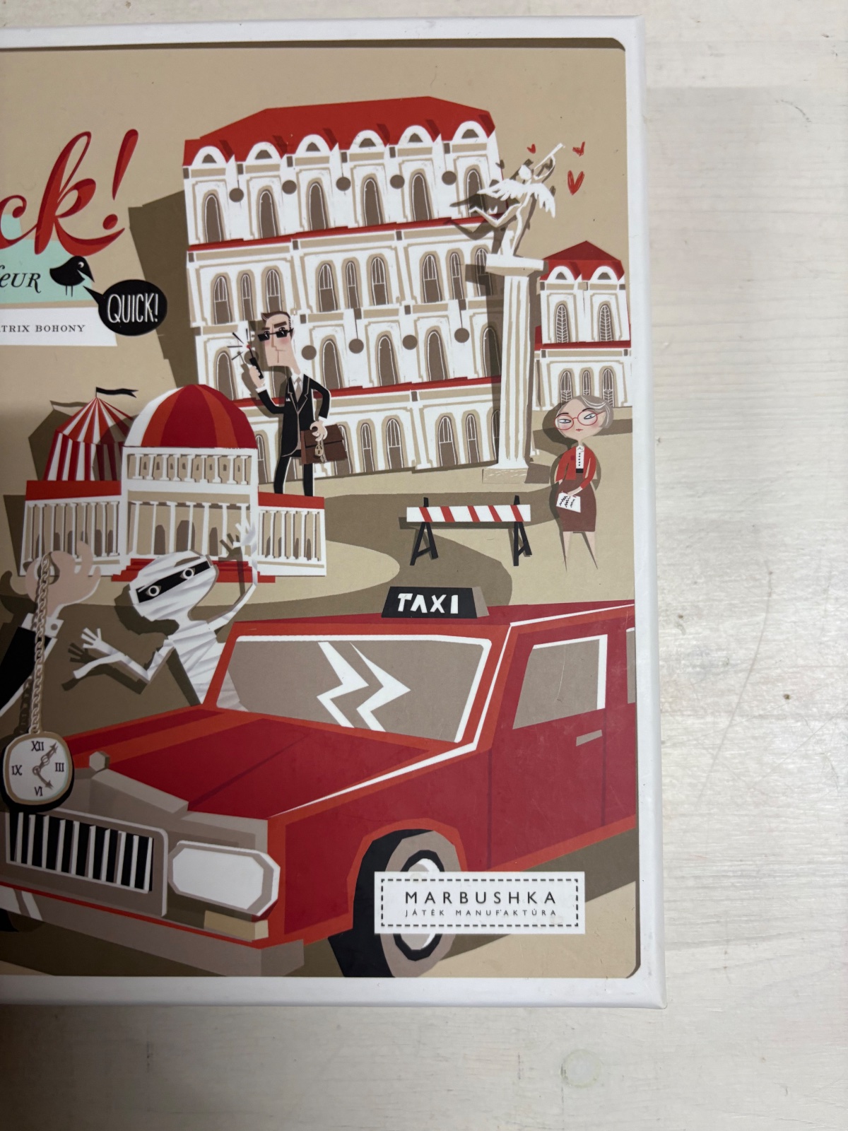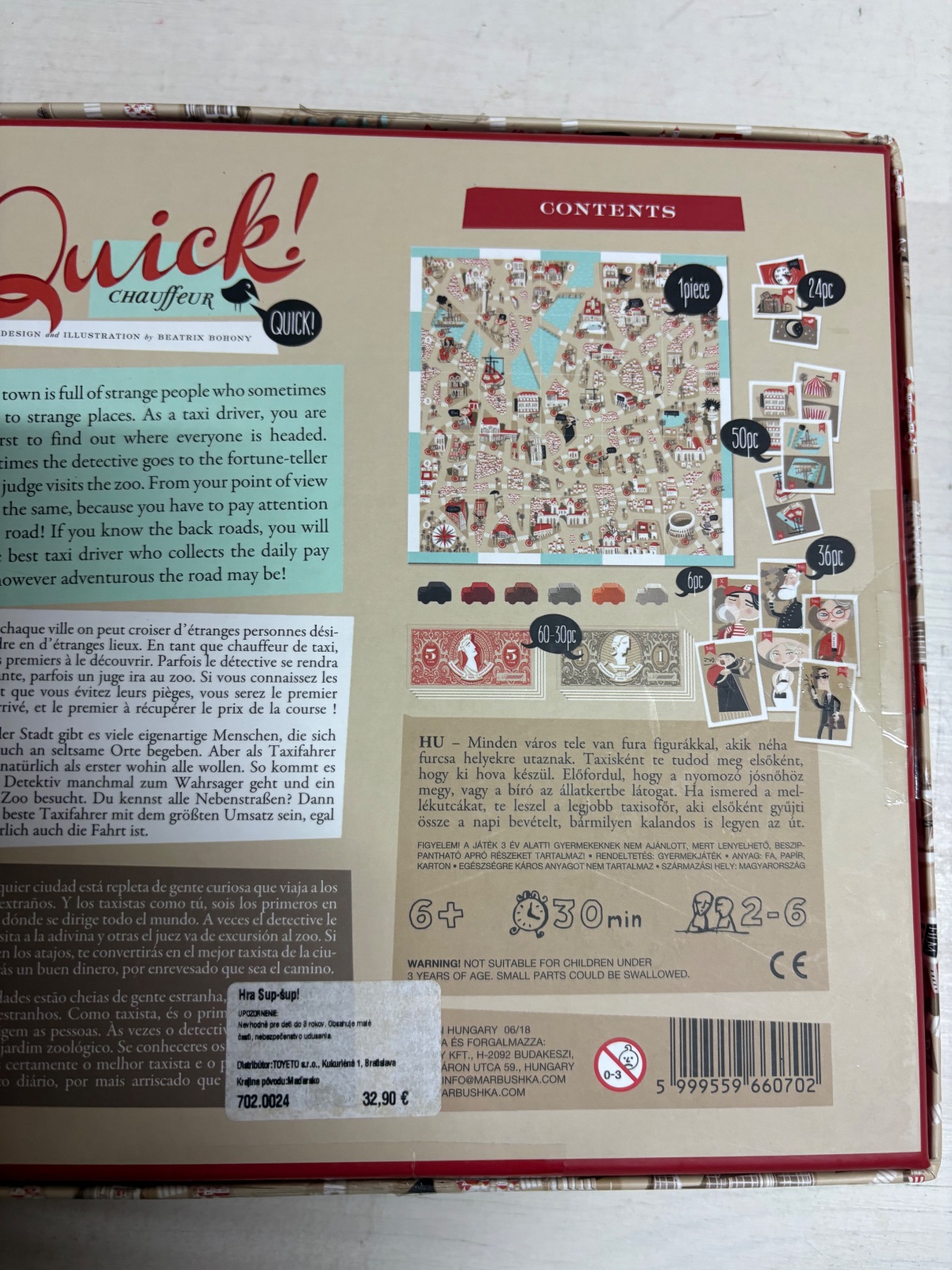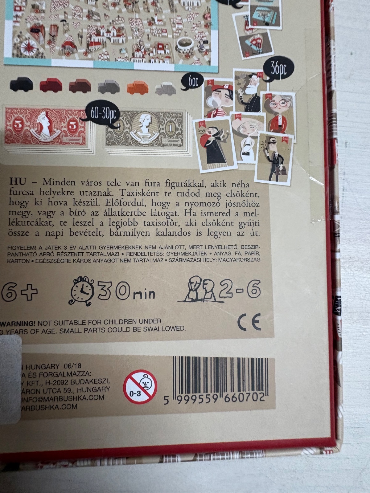 Obsah balenia: 1 hrací plán, 6 taxíkov, 50 kartičiek s lokalitami, 36 kartičiek s pasažiermi, 24 kartičiek šťastia, 90 bankoviek