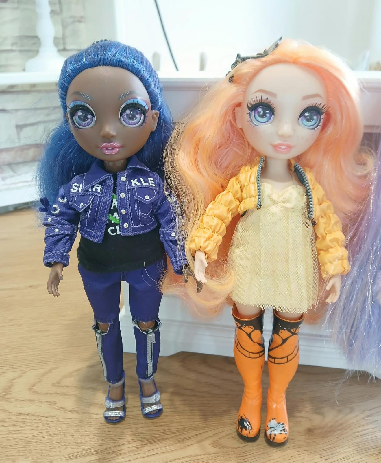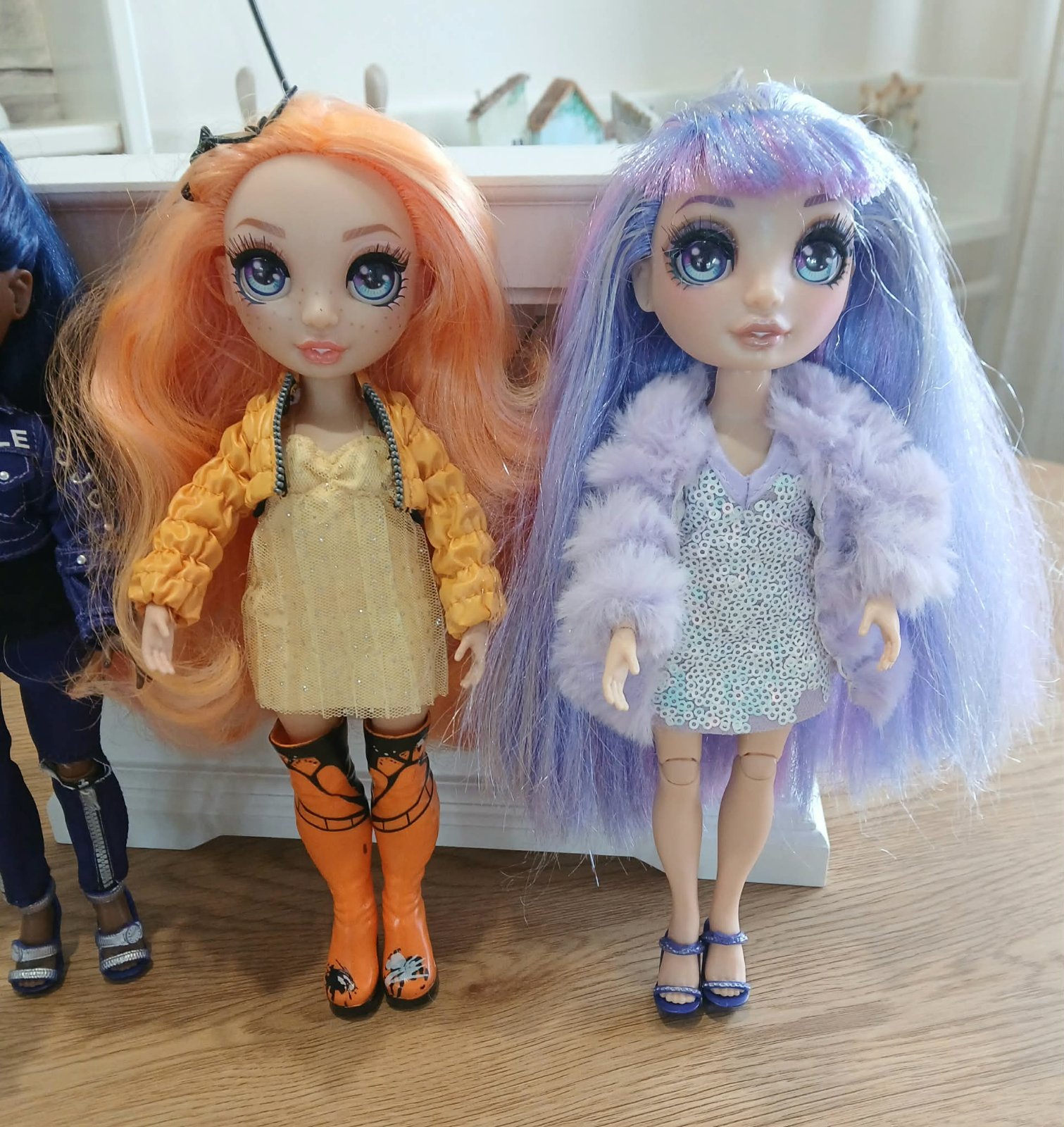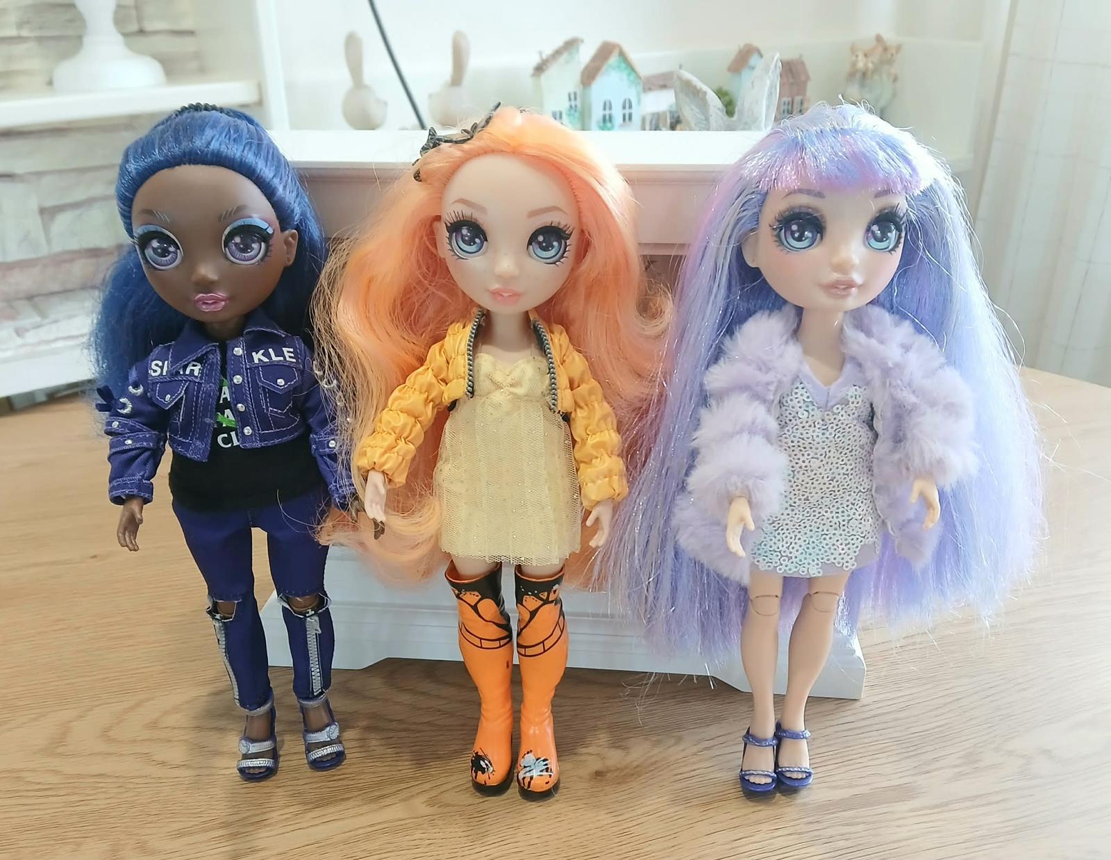 Krásne bábiky z kolekcie Rainbow High - Krystal Bailey s dlhými, hustými, fialovými vlasmi, Poppy Rowan s dlhými oranžovými vlasmi a Violet Willow jemnej fialovej farby. Bábiky sú vysoké 27cm a sú plne pohyblivé - majú ohybné ruky aj nohy. Krásny, čistý stav. Cena spolu 24Eur.