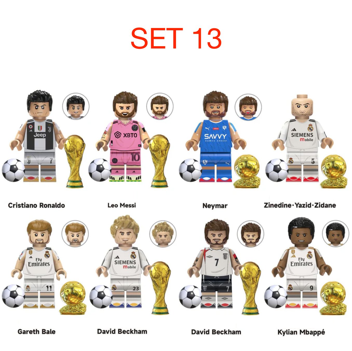 Predám obľúbené figúrky (postavičky, panáčikovia) futbalistov typ lego. Jedná sa o sadu 8 figúrok na obrázku a uvedená cena je za celú sadu. Sú nové a zabalené, pasujú k legu - typ lego. Veľkosť figúrok je štandardná, teda 45 - 55 mm.