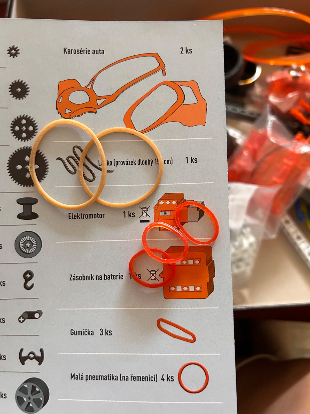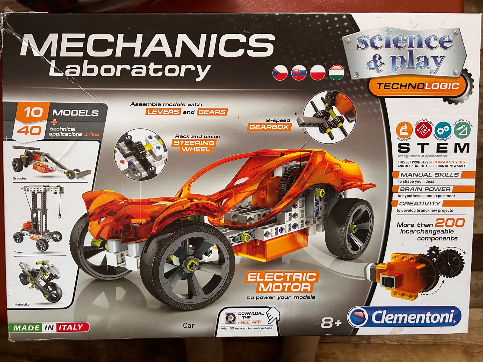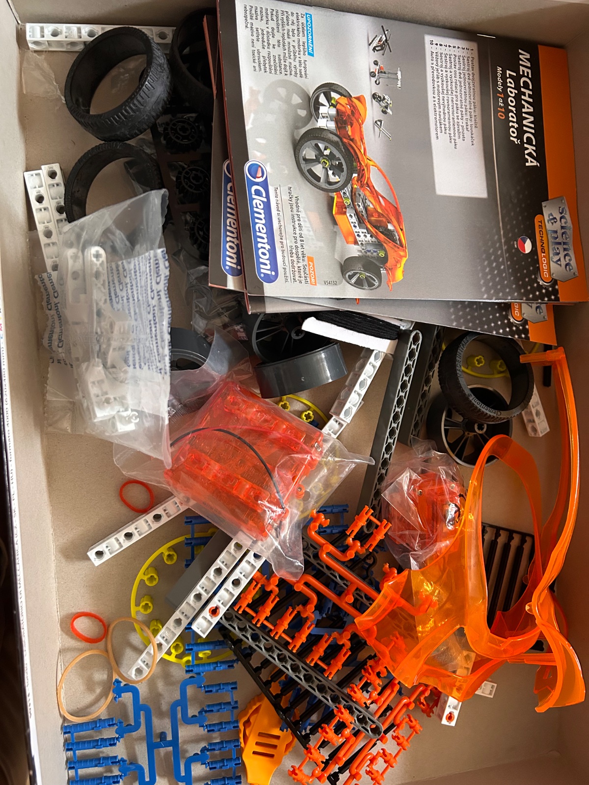 Clementoni Science & Play – Mechanics Laboratory Technologic (starší model z rady STEM/Technologic, Made in Italy). Ide o stavebnicu s elektrickým motorom, prevodovkou, ozubenými kolesami, pákami a riadením (rack and pinion). Umožňuje zostaviť 10 modelov (auto, dragster, žeriav, motorka atď.) + ďalšie technické aplikácie online. Obsahuje viac ako 200 dielov (podľa podobných setov) a je určená pre deti od 8+ rokov. Ako je vidieť na obr. č. 3 chýbajú len dve gumičky, ktoré si myslím, že sa dajú nahradiť aj inými. Stavebnica sa začala stavať, no je postavené iba to čo vidno na poslednom obrázku. Pôvodná cena stavenice bola 40€.