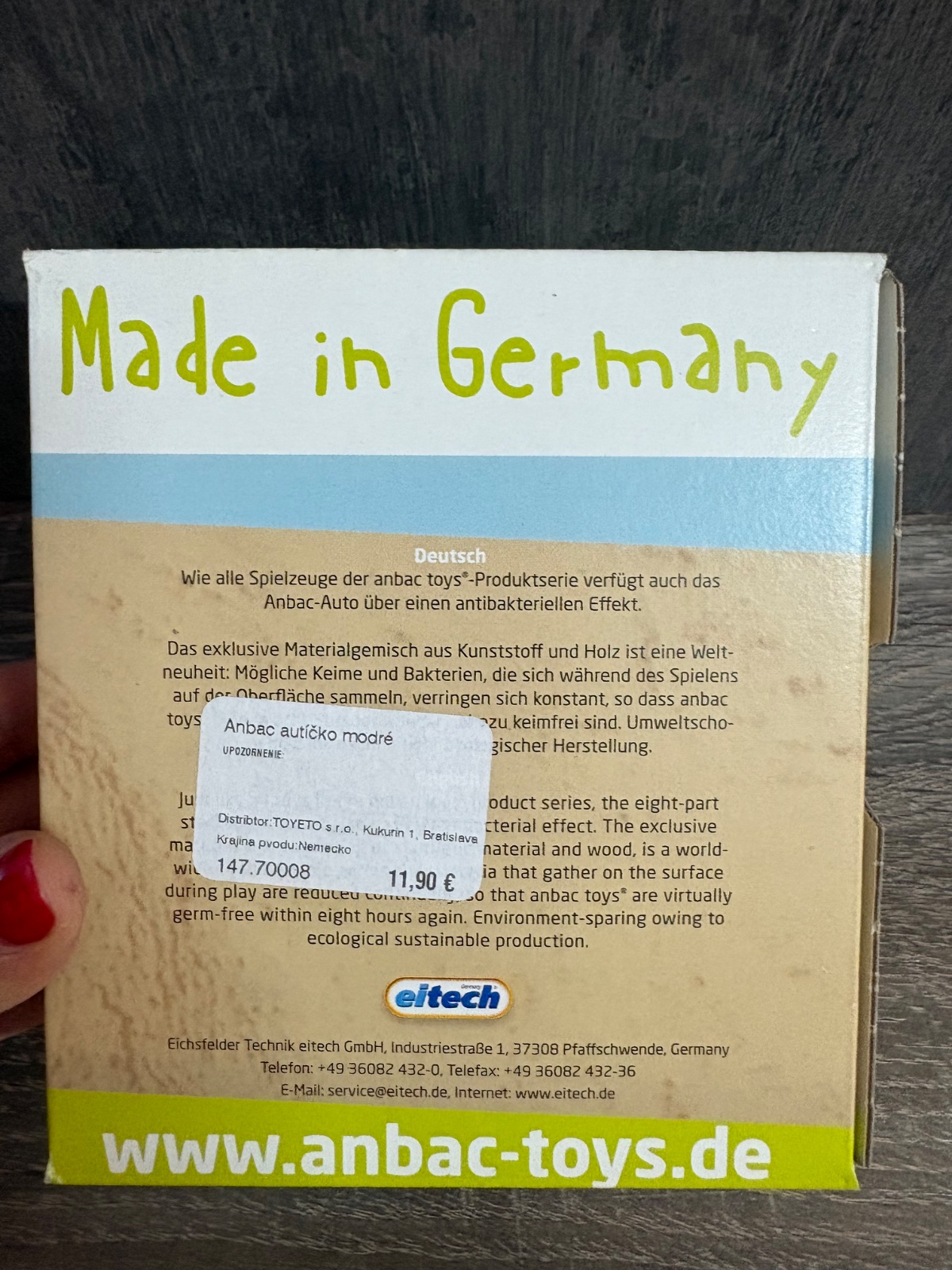 24p5k.Rovnako ako ostatné hračky z produktovej rady Anbac toys, aj toto autíčko má antibakteriálny efekt. Unikatna materliálová zmes, ktorá sa skladá zo syntetického materiálu a dreva zabespečí, že po ôsmich hodinách je hračka opäť zbavená baktérii. Made in Germany