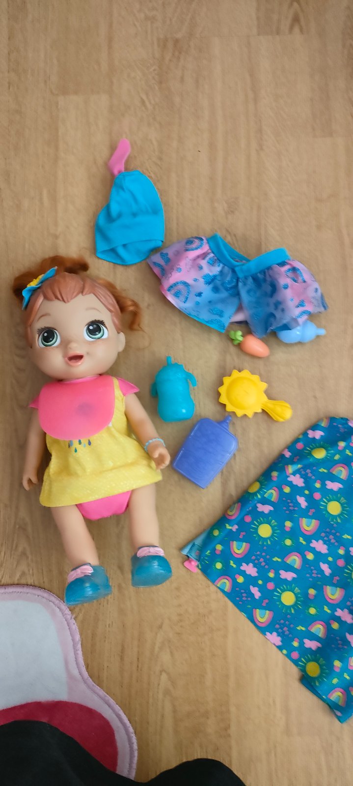 Veľmi málo hraná vo veľmi dobrom stave bez poškodení. Bábika je ako bábätko potom jej vyskočia vlásky ,rozbalila nôžky a je veľká. Rastúca bábika.
