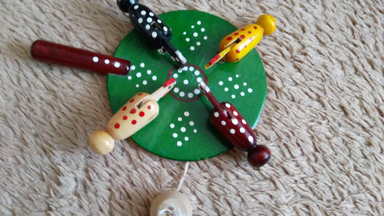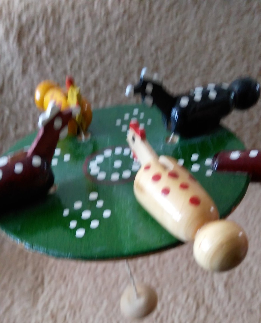 Kuriatka z dreva na šnúrke ďobajú zobákom.