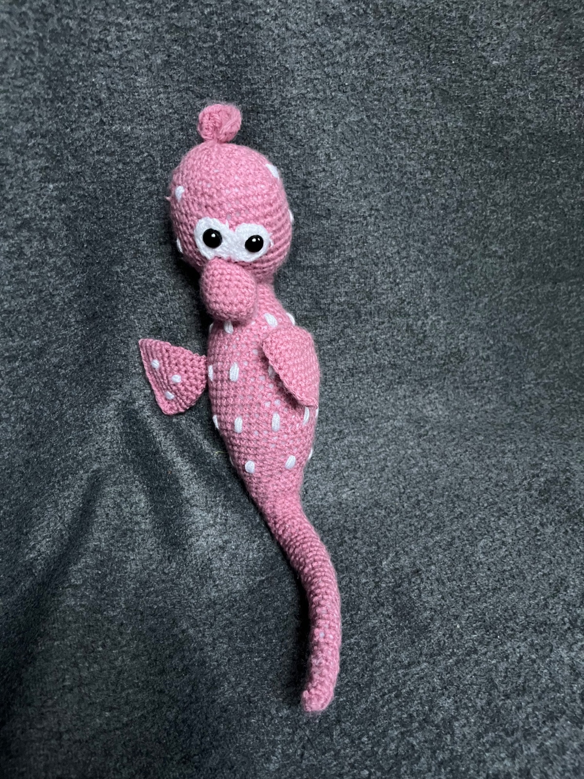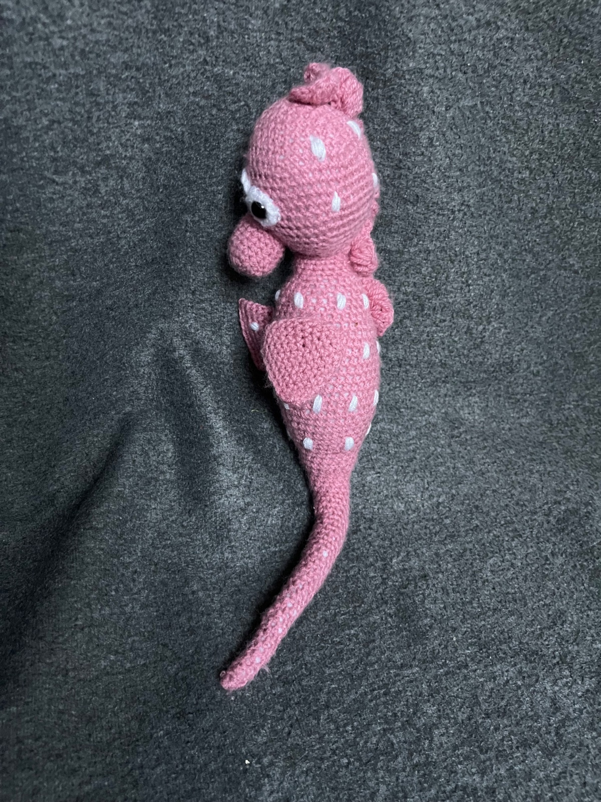 Len vystavený háčkovaný morský koník. Výška cca 43cm