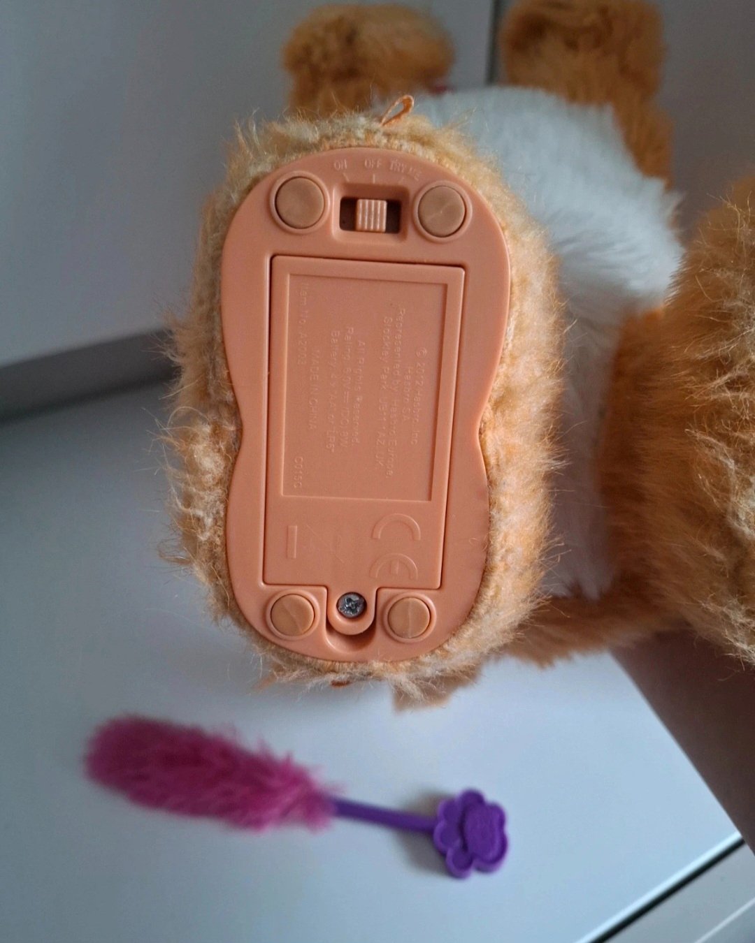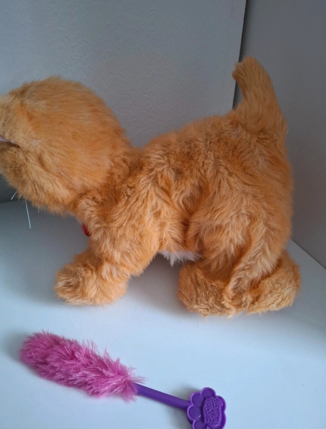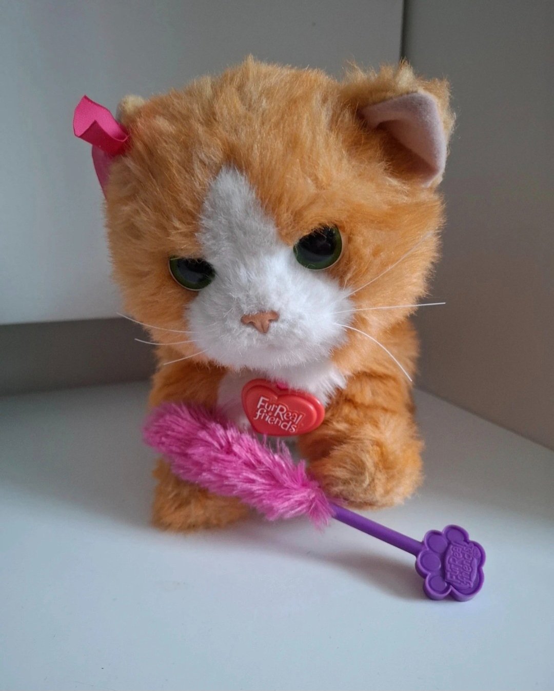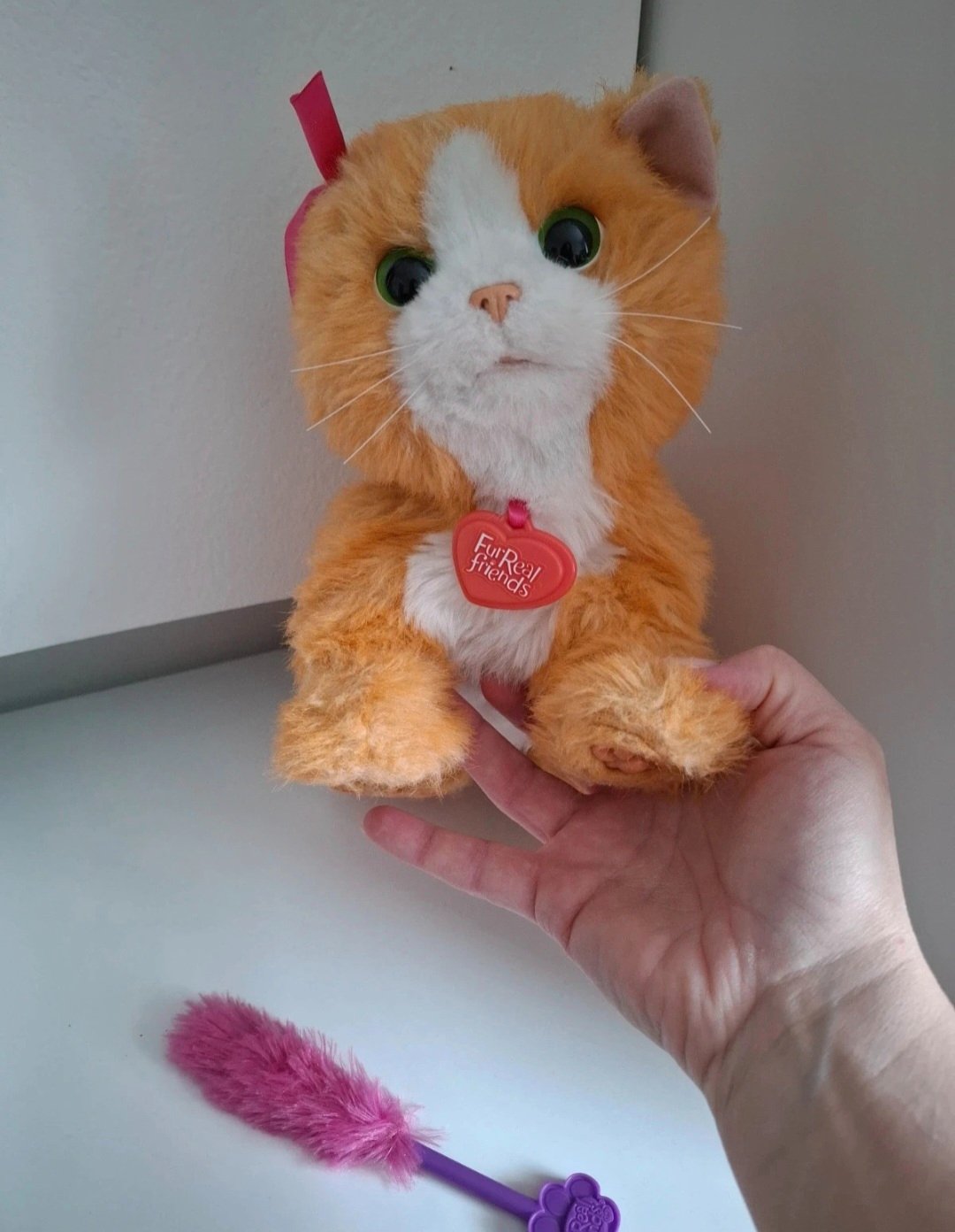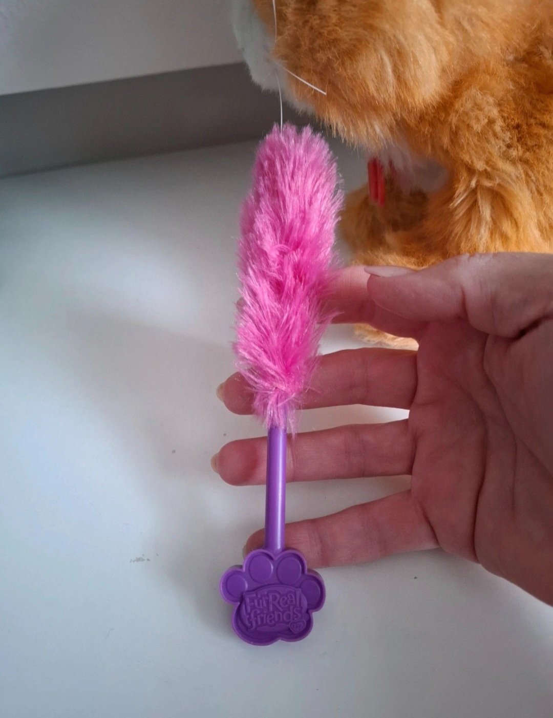 Súčasťou balenia je ružová hračka (kefka/prútik), ktorou sa mačička rada hrá.