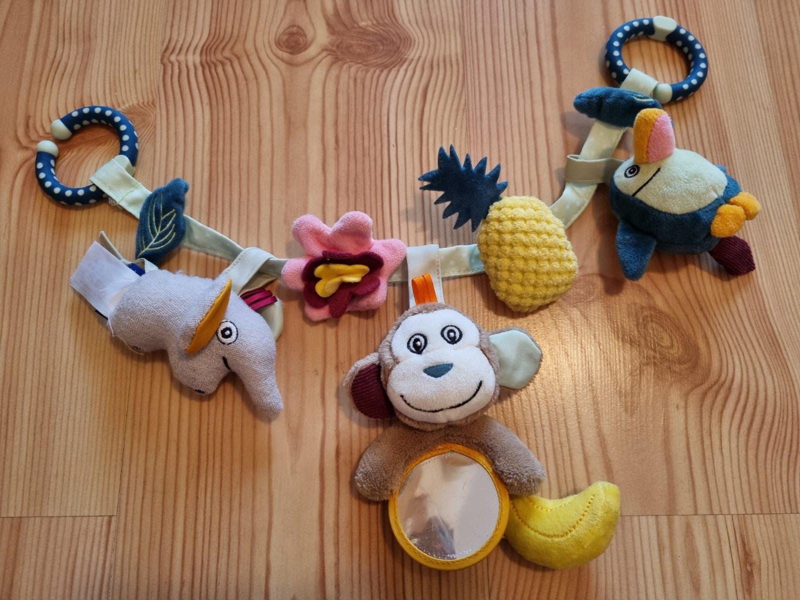 Ako nová, hračka na kočík alebo do vajíčka pre bábätko. Sú na nej zvieratká a zrkadielko, a v dvoch zvieratkách sú hrkálky.