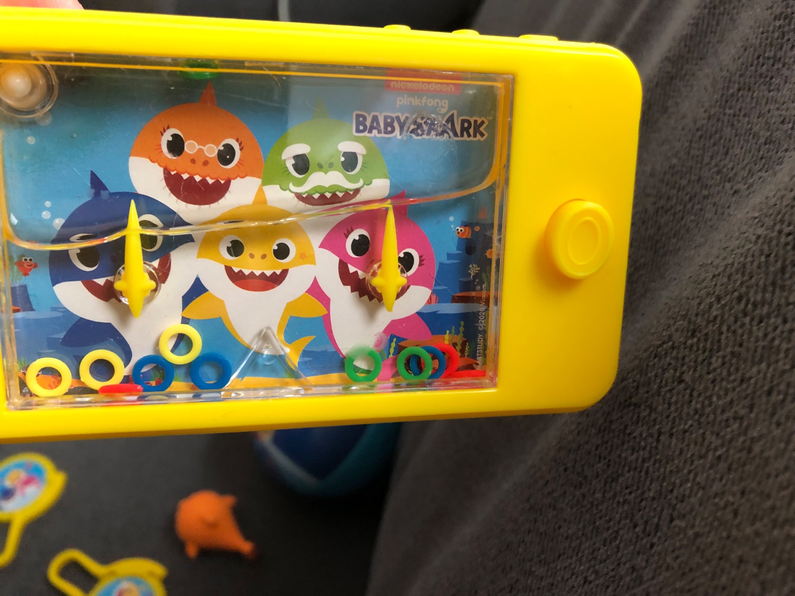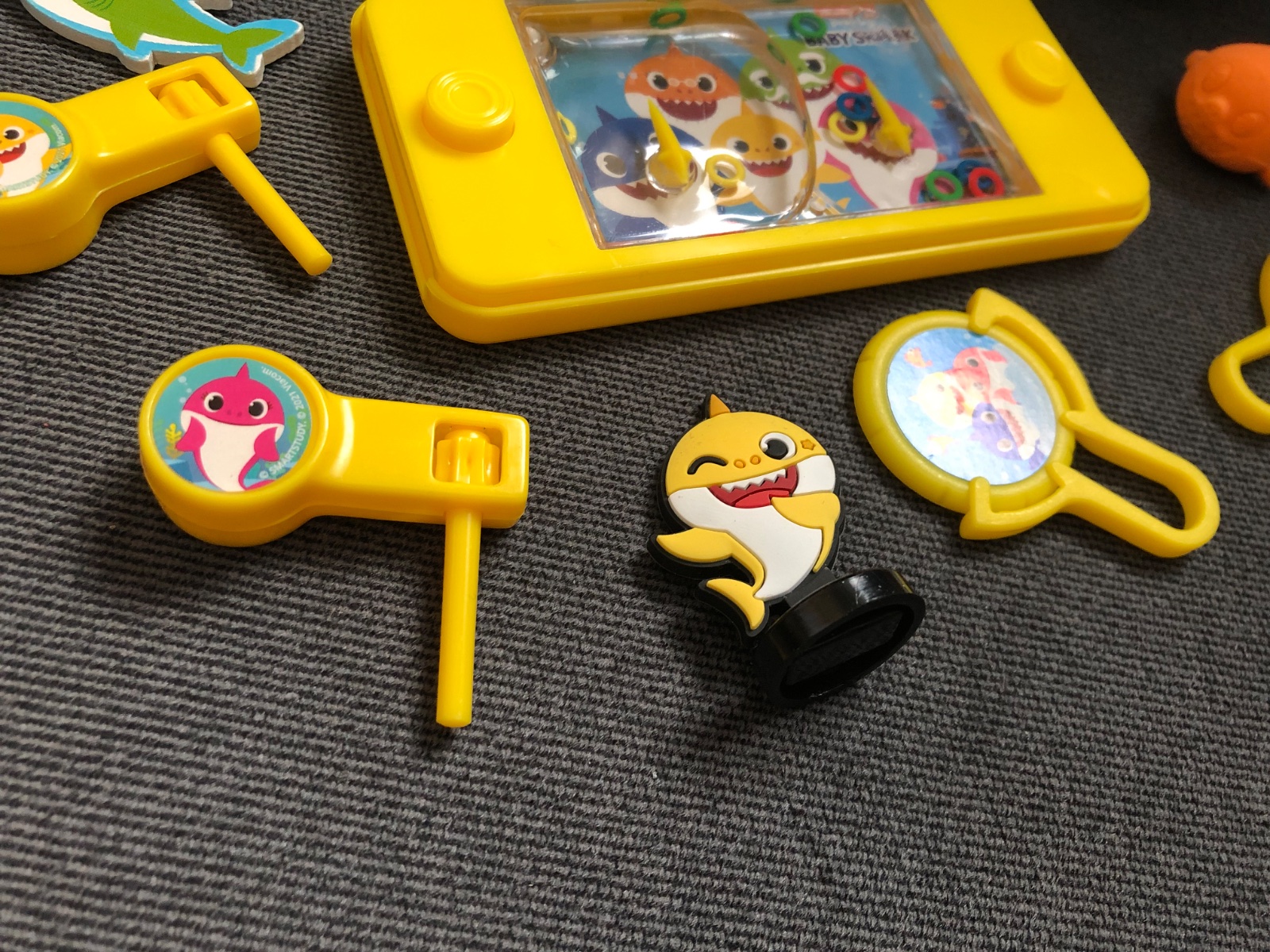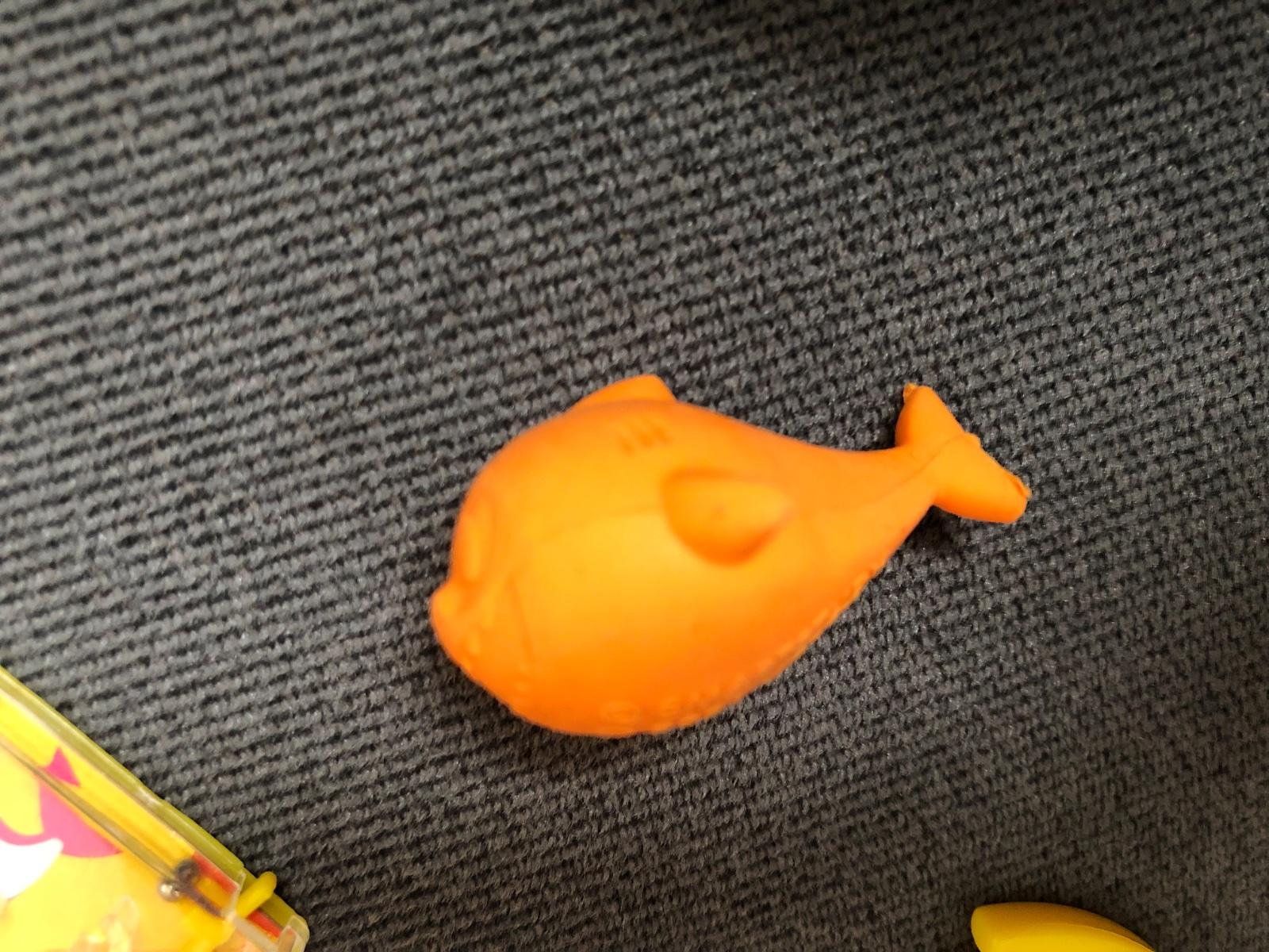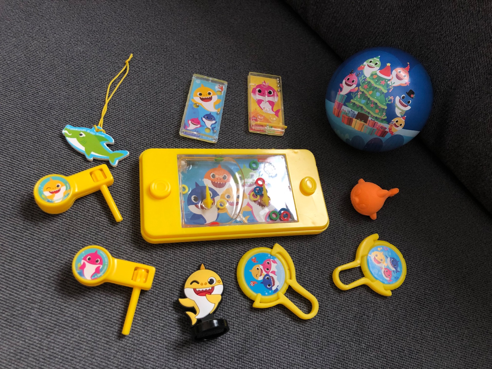 Hry, prívesok, gumená ryba, rapkáčiky, kolieska (dajú sa vystreliť), gumená postavička na podstavci, plechová vianočná guľa