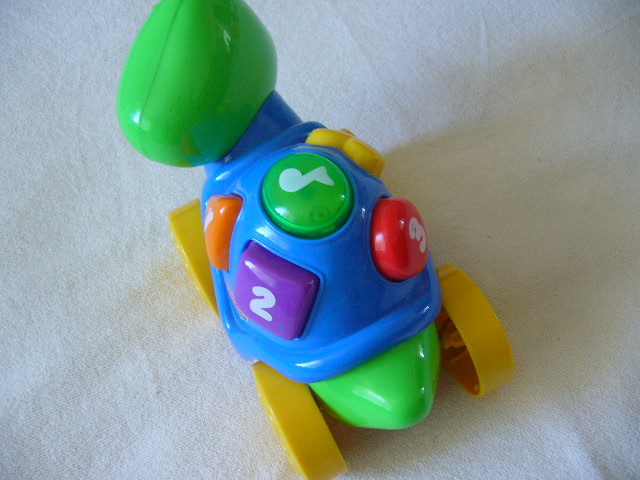 Hovoriaca korytnačka FISHER PRICE . Korytnačka naučí Vaše dieťa rozoznávať čísla a tvary a rozšíri mu slovnú zásobu. Stačí stisnúť tlačidlo na jej pancieri a budete počuť čísla, názvy tvarov a zábavné zvuky. Pokiaľ bude dieťa stisne vrchne tlačidlo na jej pancieri, ozve sa pesnička a tlacidlo blika na zeleno. Ak stisne čislicu,tak je hovorena čislica.Keď dieťa bude počuť slová a hudbu, bude sa snažiť opakovať. Dlzka cca 22cm, vyska cca 17cm.