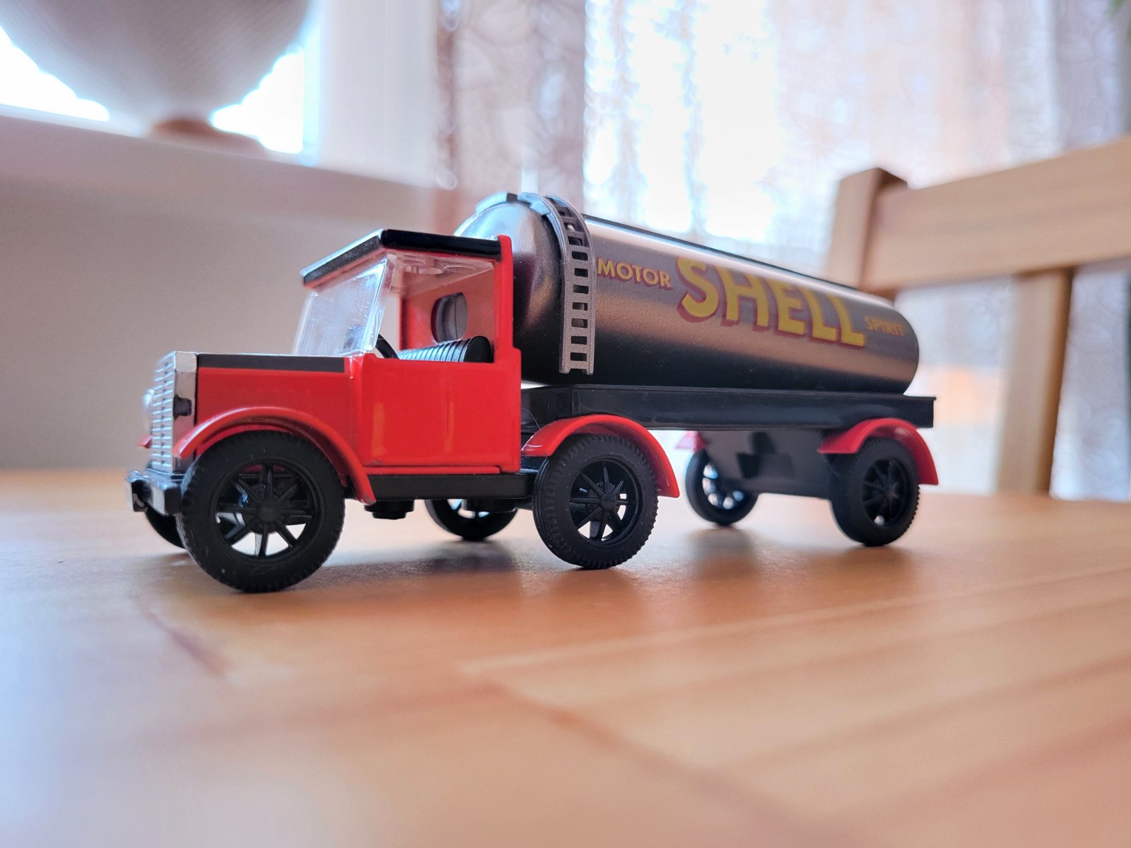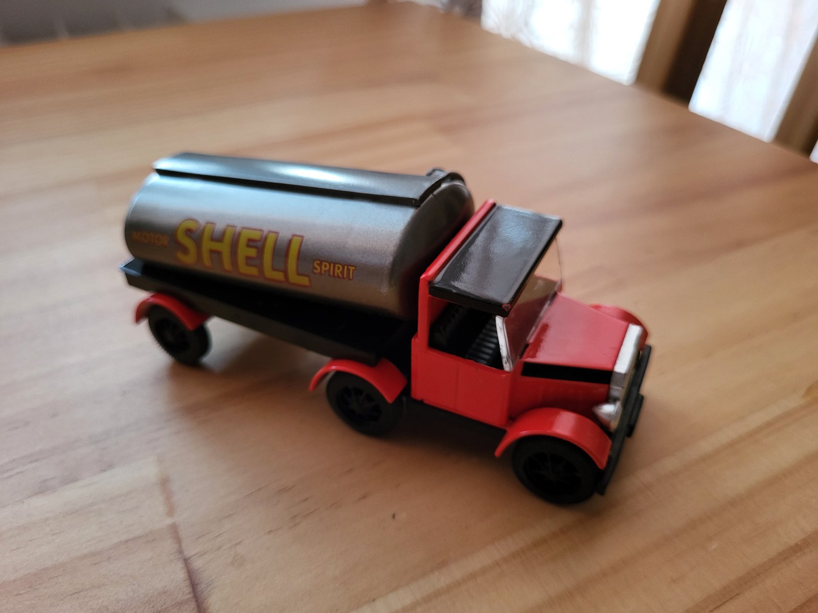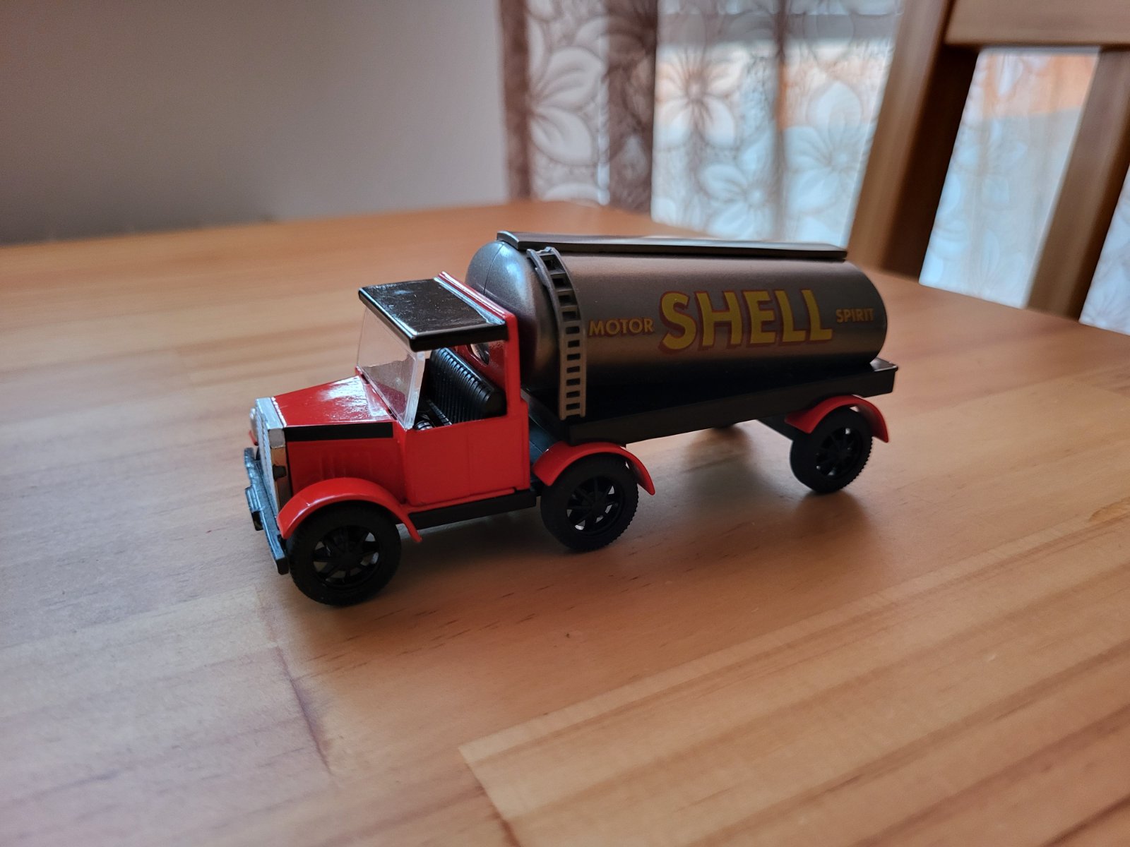 veľmi dobrý stav, chýba jej jedno predné svetlo, inak je bez ďalších poškodení, je to zberateľská replika palivového cisternového vozidla Shell, konkrétne ide o model vychádzajúci z roku 1920, ide o historický nákladný automobil Hawkeye v úprave cisterny pre spoločnosť Shell. Model bol súčasťou limitovanej zberateľskej edície s názvom Shell Fuel Tanker Collection (vydávanej napríklad v roku 2018 v Singapure), ktorá mapovala históriu ich vozidiel od 20.rokov minulého storočia až po súčasnosť. Je to kvalitný kovový odliatok (die - cast) s plastickými prvkami, pošlem buď poštou alebo packetou