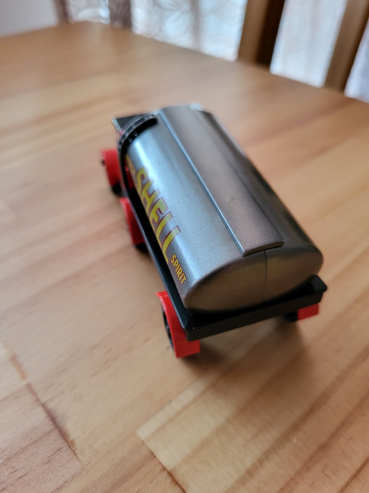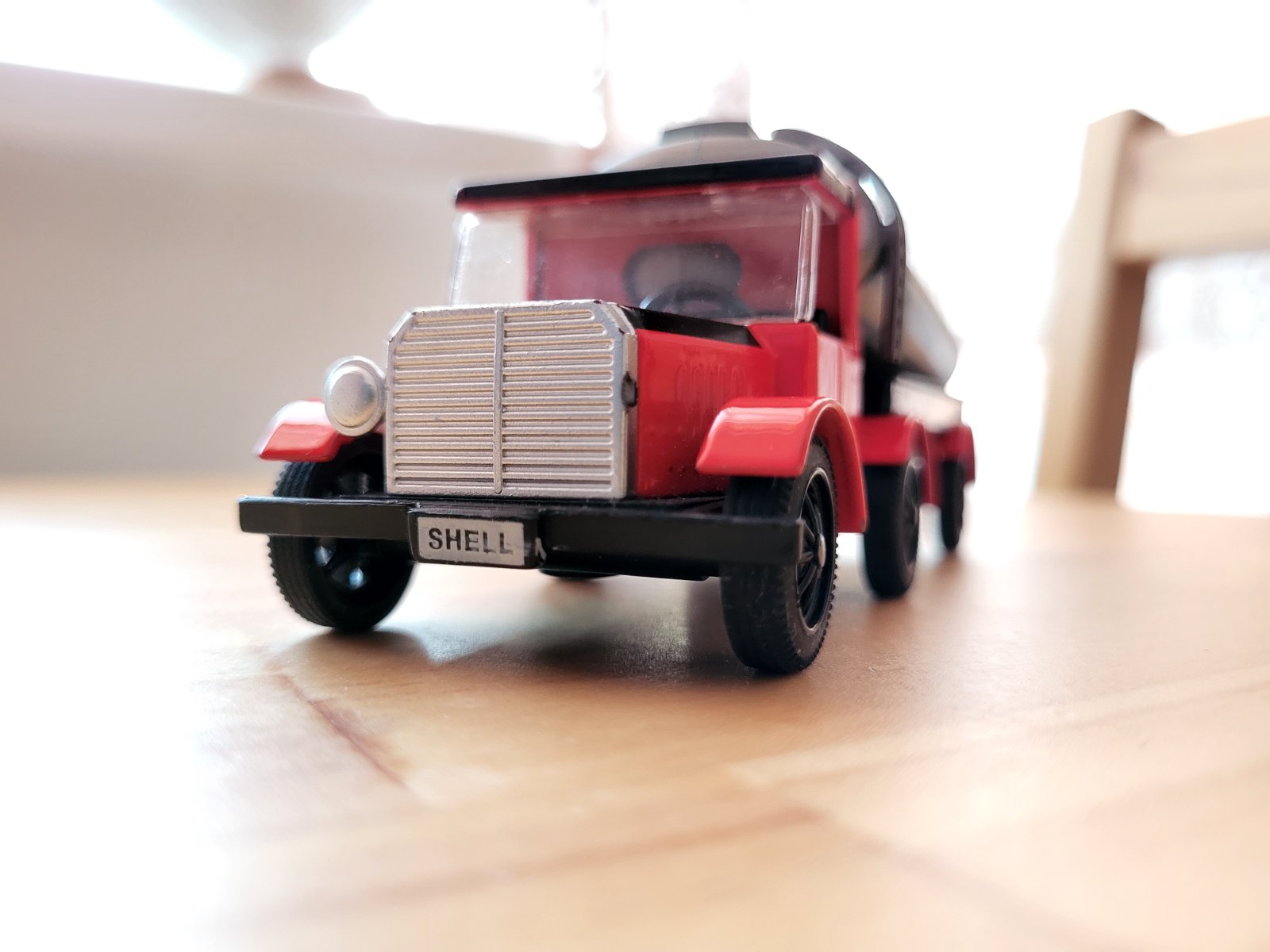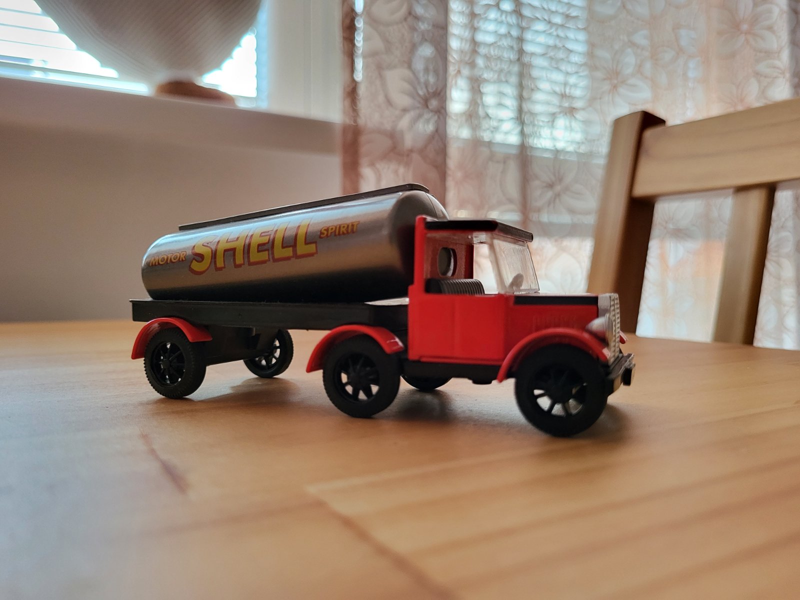 veľmi dobrý stav, chýba jej jedno predné svetlo, inak je bez ďalších poškodení, je to zberateľská replika palivového cisternového vozidla Shell, konkrétne ide o model vychádzajúci z roku 1920, ide o historický nákladný automobil Hawkeye v úprave cisterny pre spoločnosť Shell. Model bol súčasťou limitovanej zberateľskej edície s názvom Shell Fuel Tanker Collection (vydávanej napríklad v roku 2018 v Singapure), ktorá mapovala históriu ich vozidiel od 20.rokov minulého storočia až po súčasnosť. Je to kvalitný kovový odliatok (die - cast) s plastickými prvkami, pošlem buď poštou alebo packetou