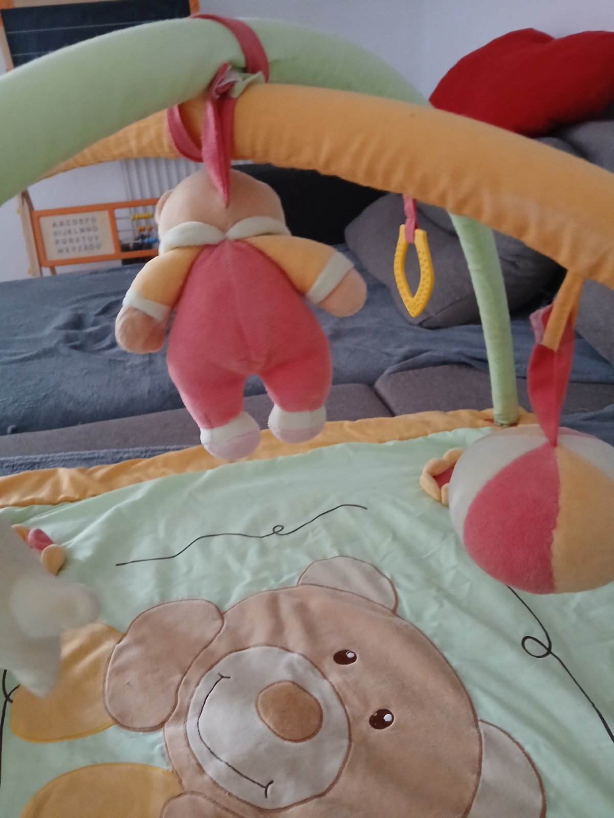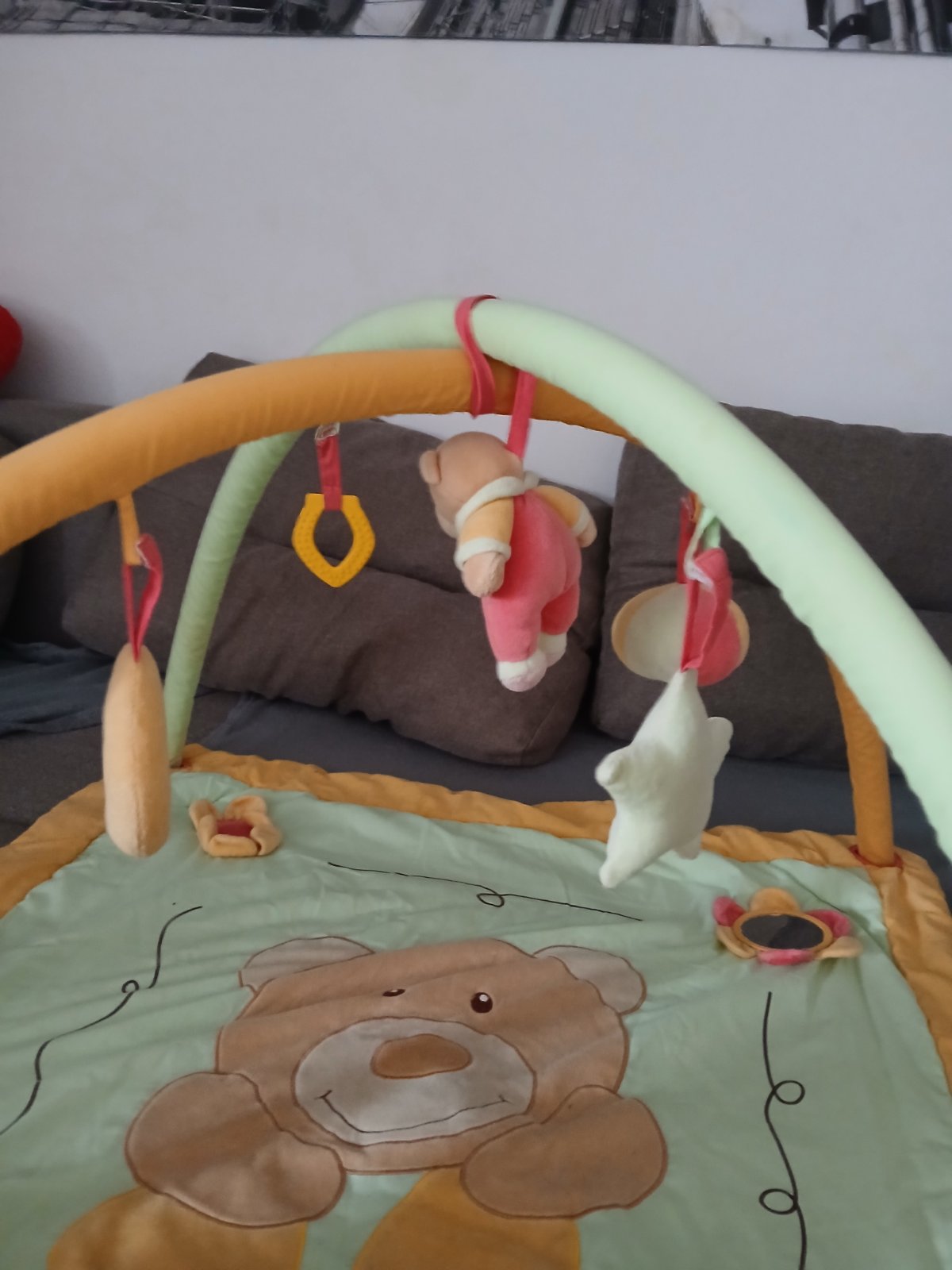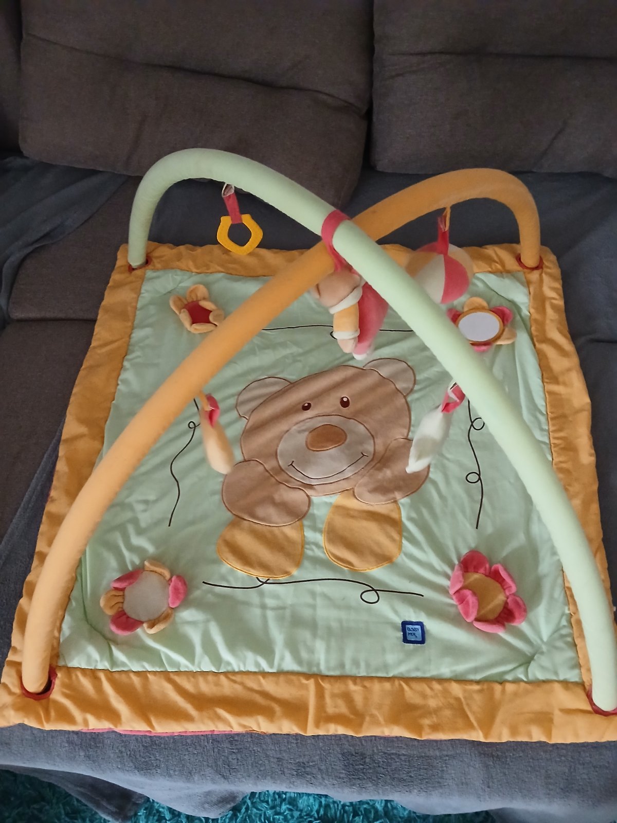 Hracia podložka na hranie v strede macko píska, hračky na zavesenie sa dajú odopnúť. Podložka ma sem tam žmolky ale k používaniu to nebráni. Značka BAby Mix