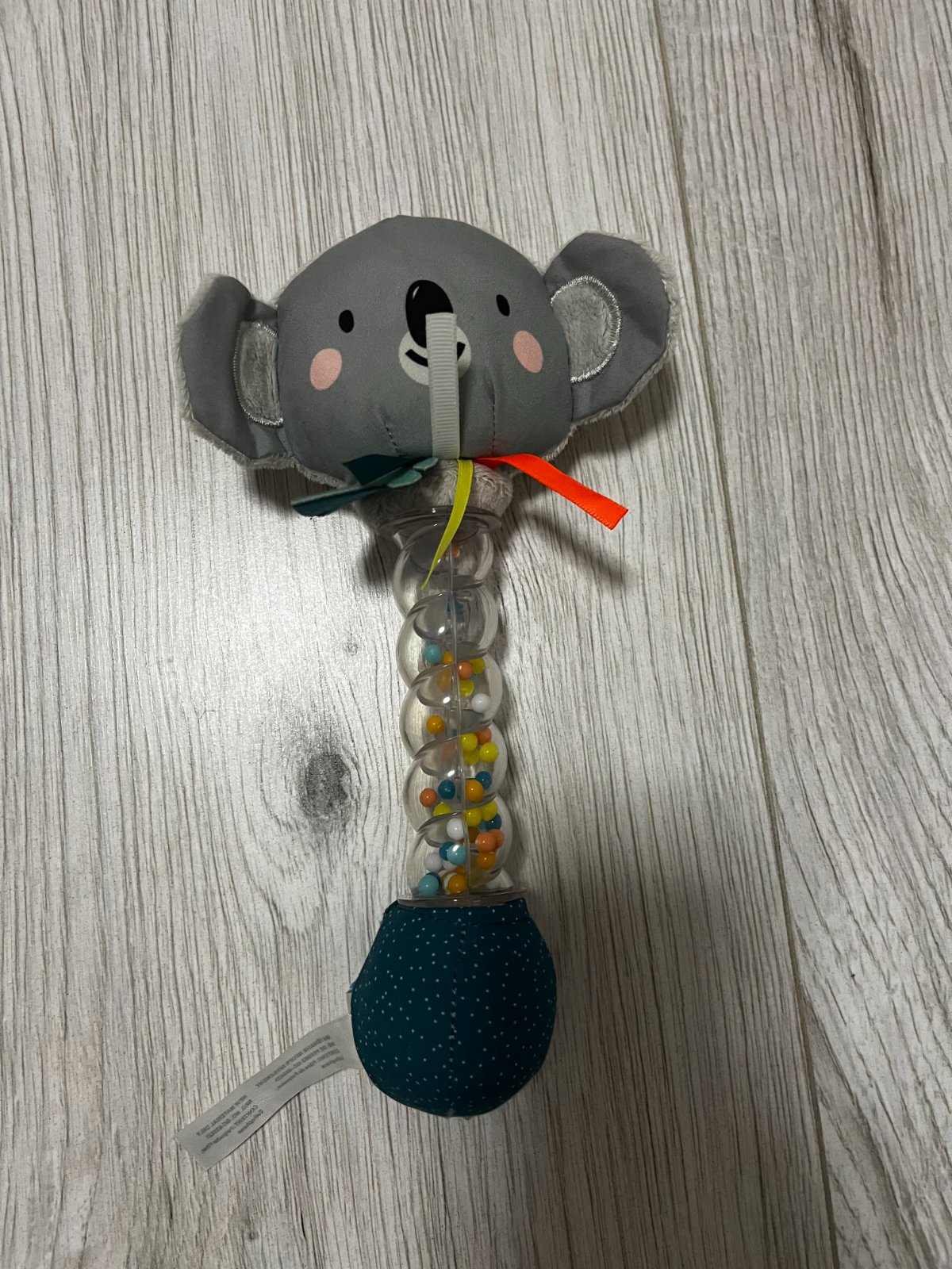 Hrkálku tvorí mäkká plyšová hračka v tvare usmievavého medvedíka koaly a priehľadné plastové držadlo naplnené farebnými korálkami. Upokojujúci zvuk presýpajúcich sa korálikov pripomína zvuk padajúcich kvapiek dažďa.