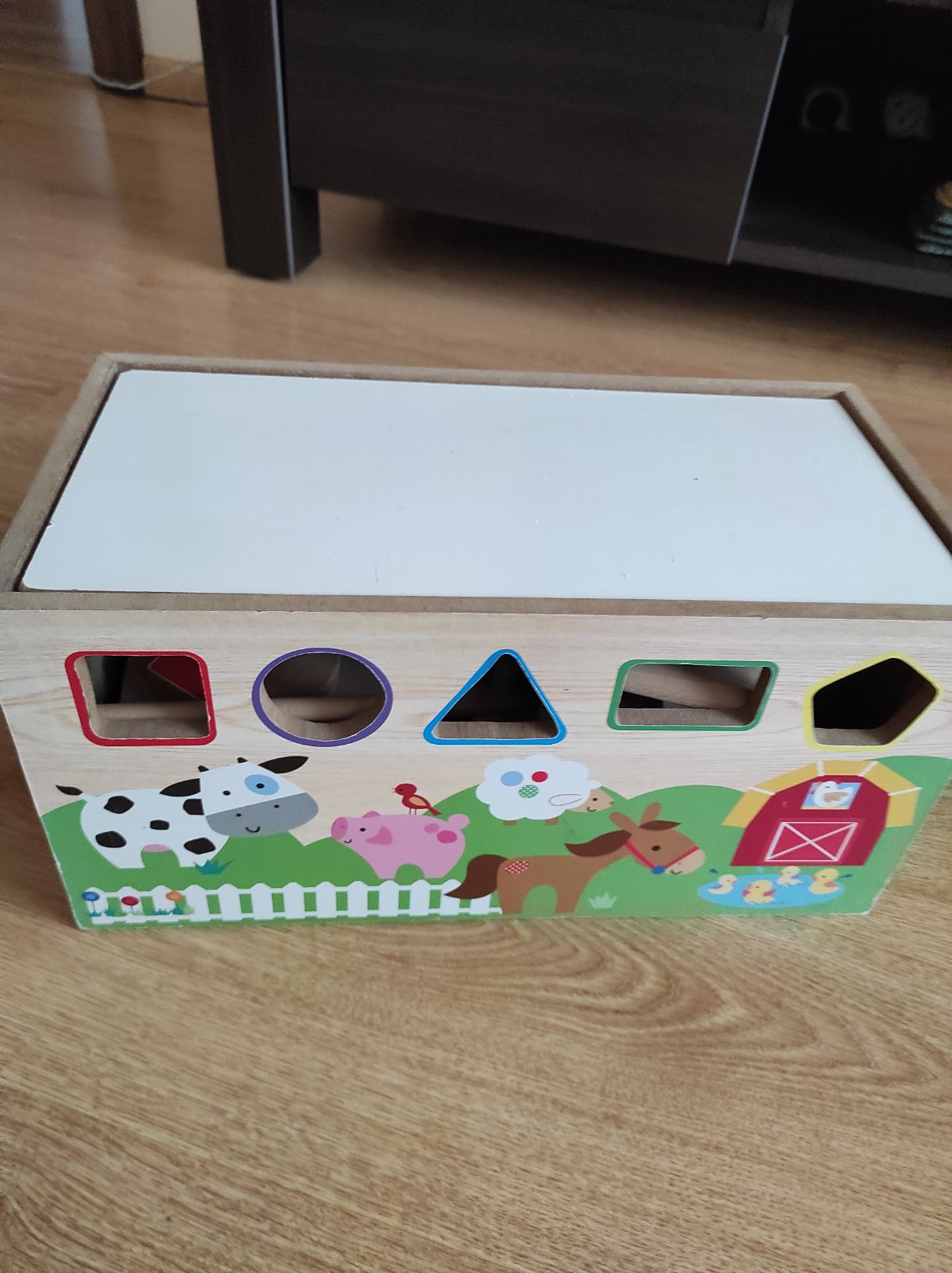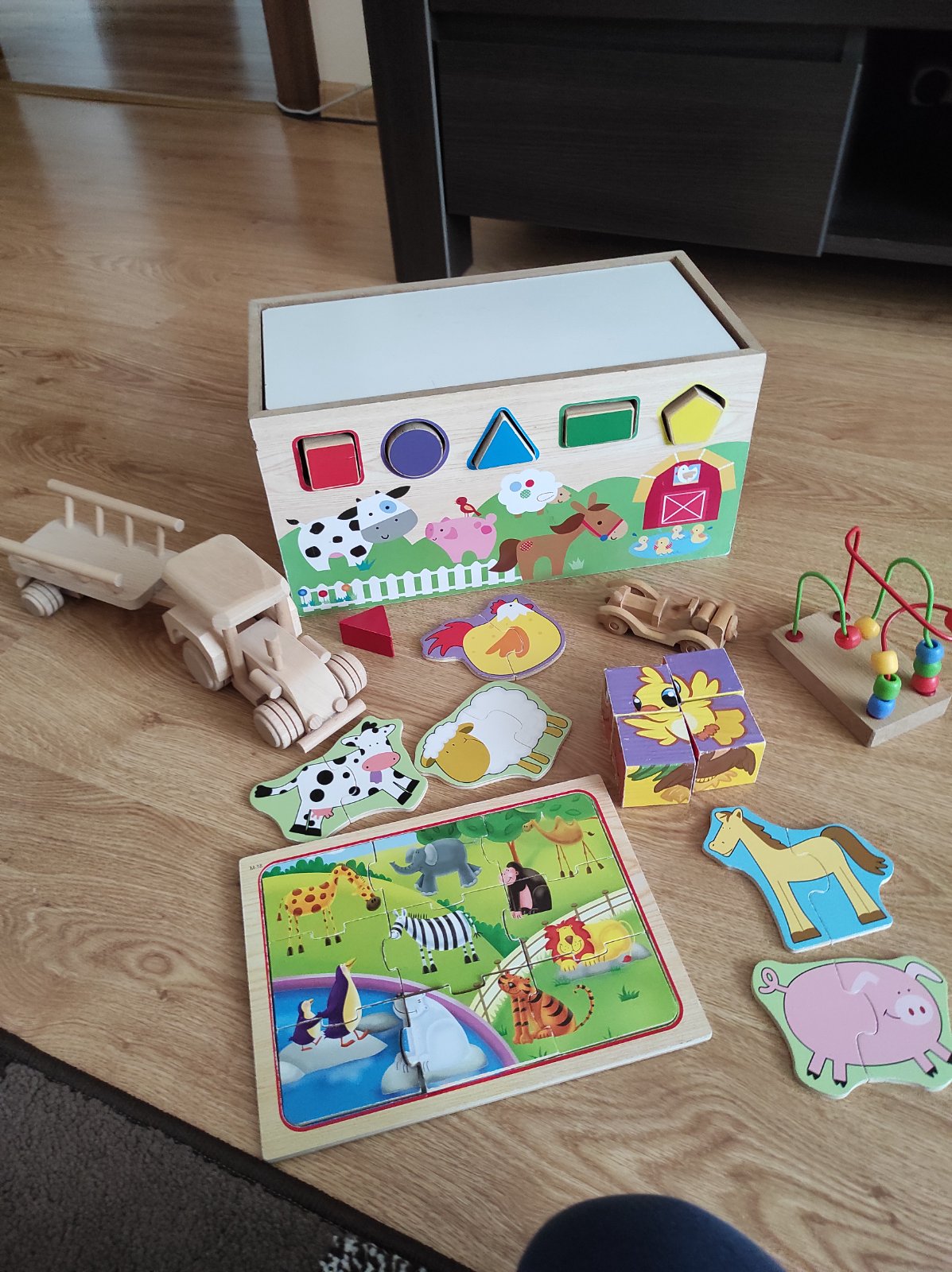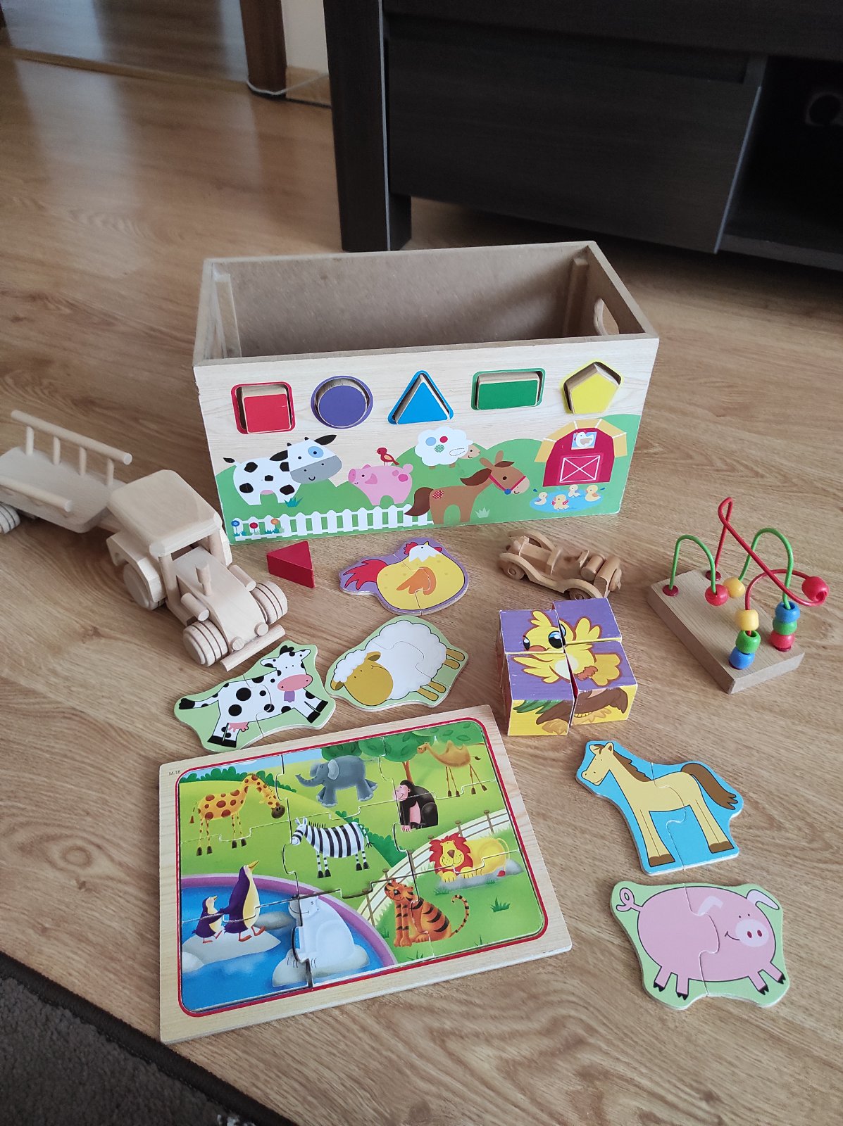 Predám drevenú krabicu s rôznymi kockami, dreveným traktorom, puzzle a iné. Cena 15€ + poštovné, alebo osobný odber.