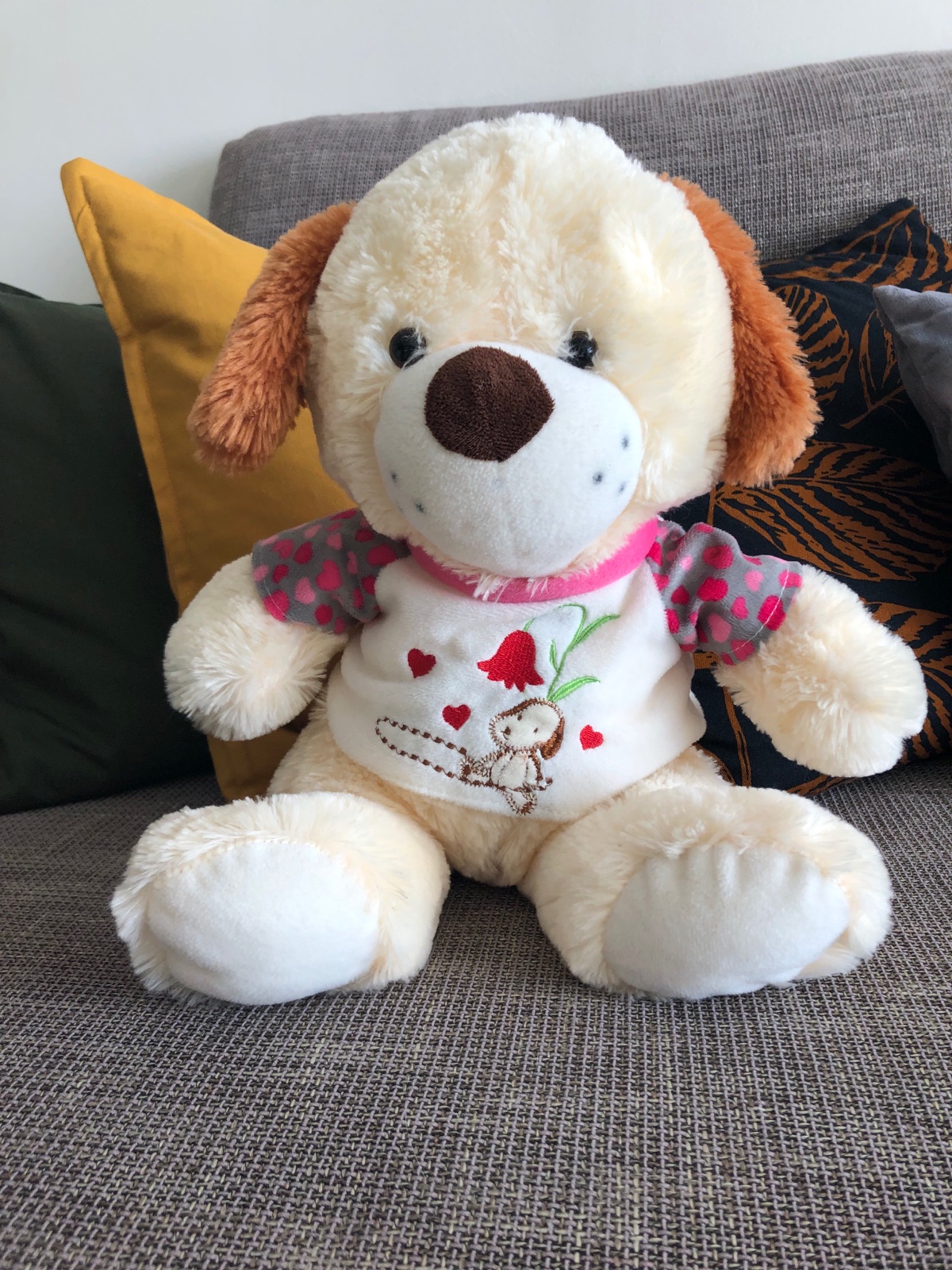 Veľký plyšový psik, oblečeny vo svetriku