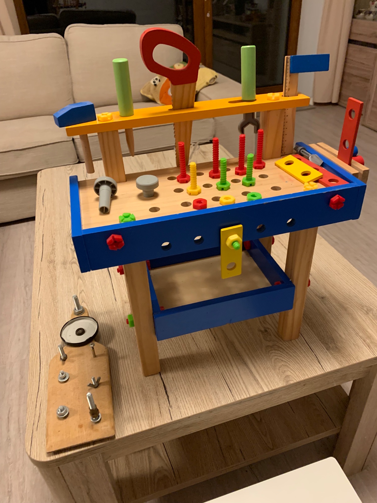 Predany detsky dreveny stolik kupovany v lidli, podporuje kreativitu,jemnu motoriku,koordinaciu,na zatlkanie,srobovanie,meranie,obsahuje rozne naradie, aj zverak :) da sa v ramci hry rozlozit. Pridam k tomu doma vyrobenu supravu na srobovanie.