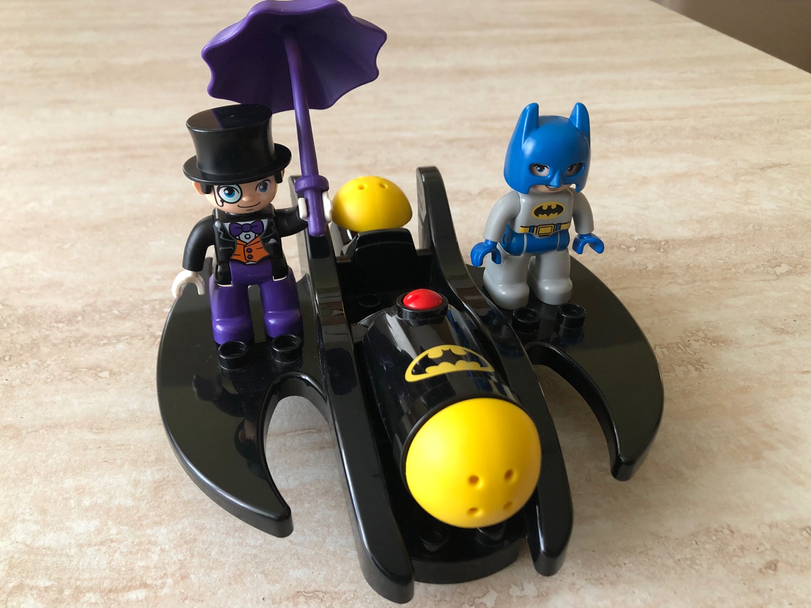 Predám Lego Duplo Batman so stíhačkou a Penguin s dáždnikom, v top stave, po stlačení červeného tlačidla stíhačka vystrelí žltý náboj/šipku.