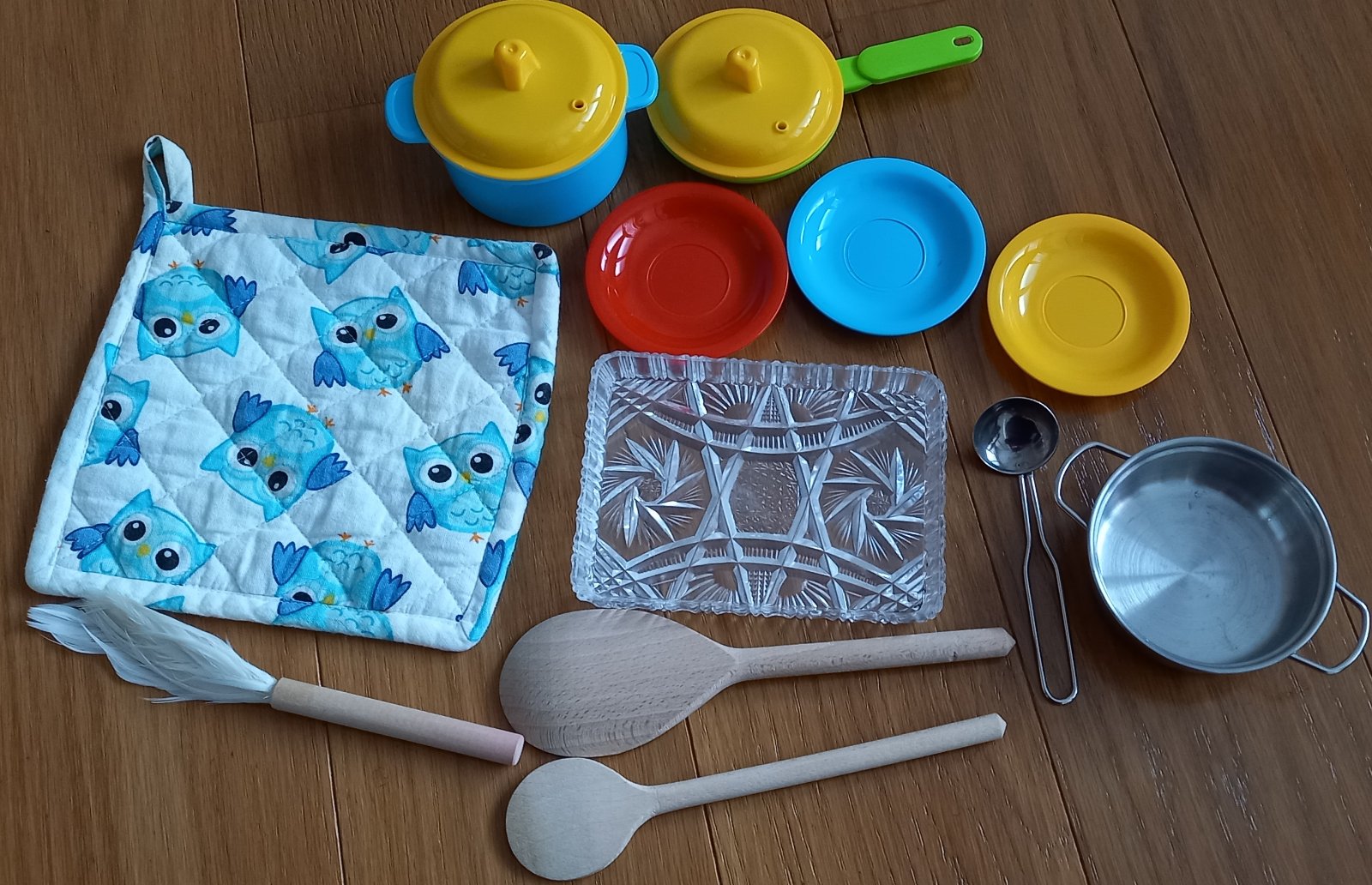 Doplnky k detskej kuchynke: chňapka, varešky, plastové hrnce, tanieriky, kovová naberačka a hrniec, cena spolu 3 €
