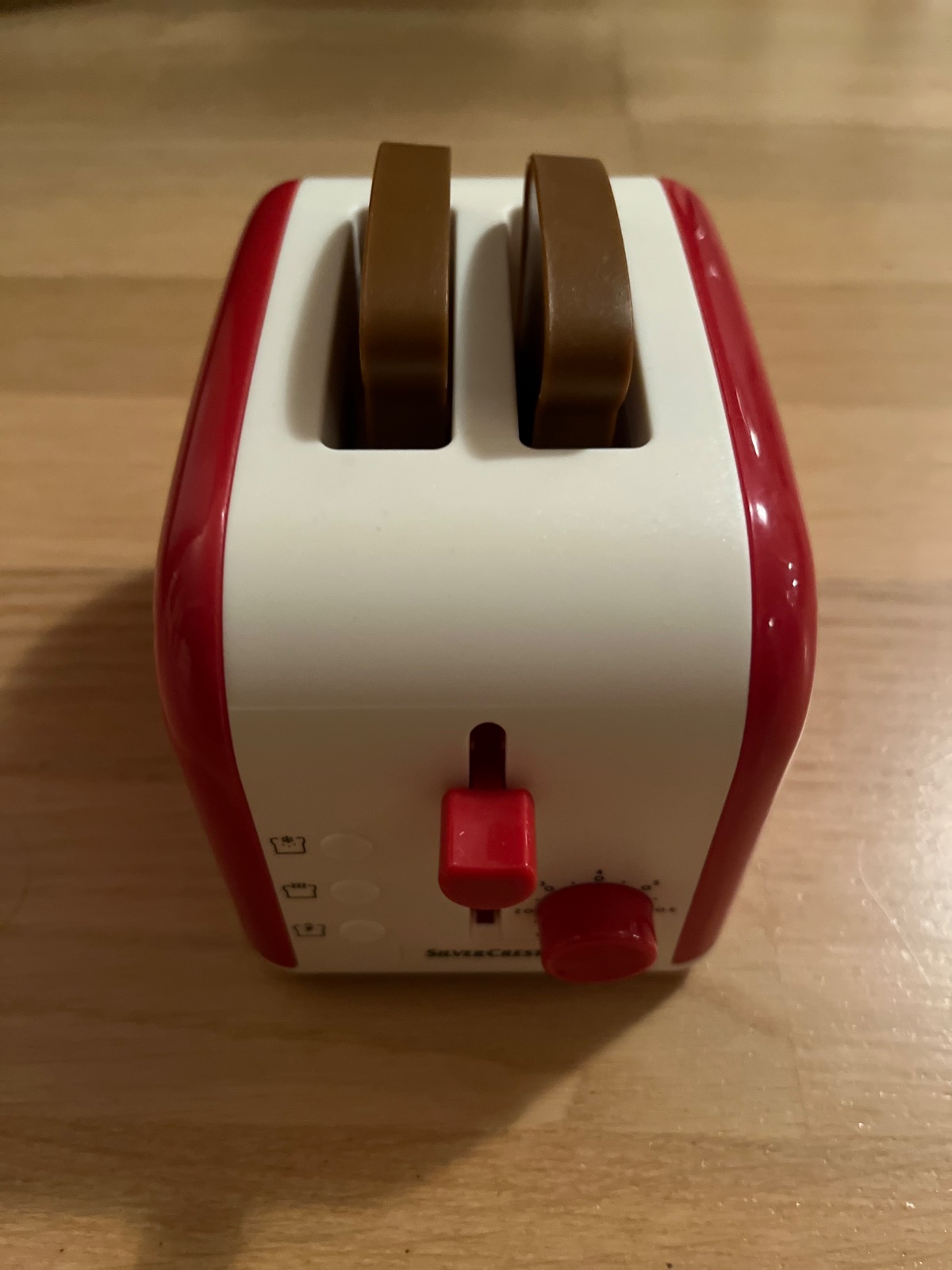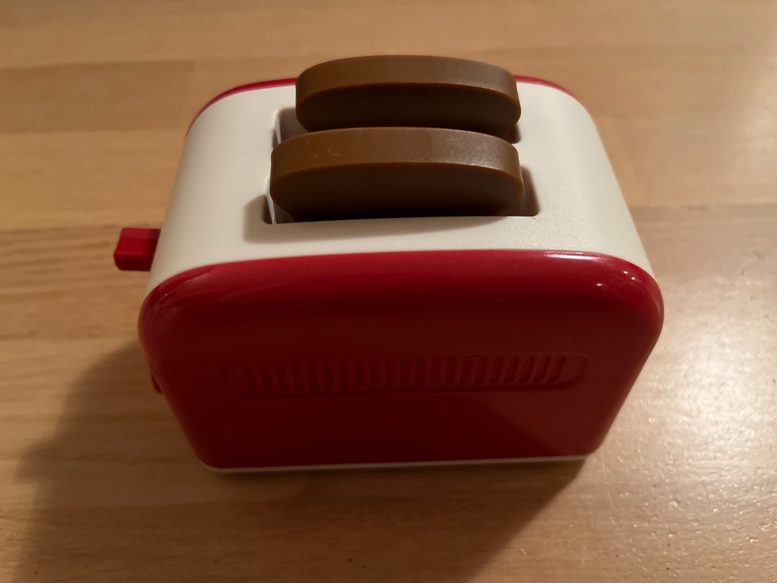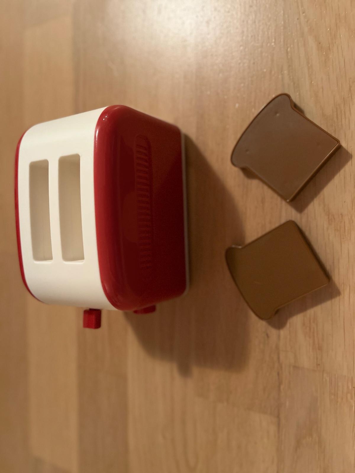Detský toastovač bez poškodení. Po stiahnutí gombíku nadol cinkne.
