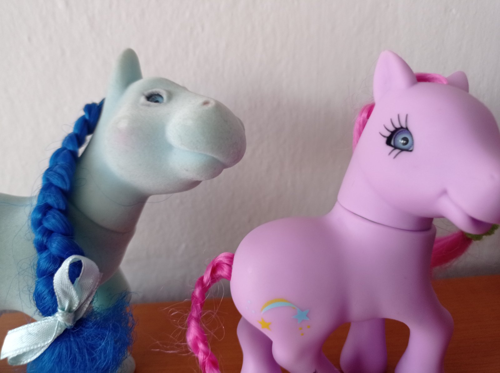 Modrý latkovy poťah vyska 13 cm,ružový plast výška 11,5cm, dajú sa točiť hlavy, +kefka, cena spolu, pekný hrany stav, potesia