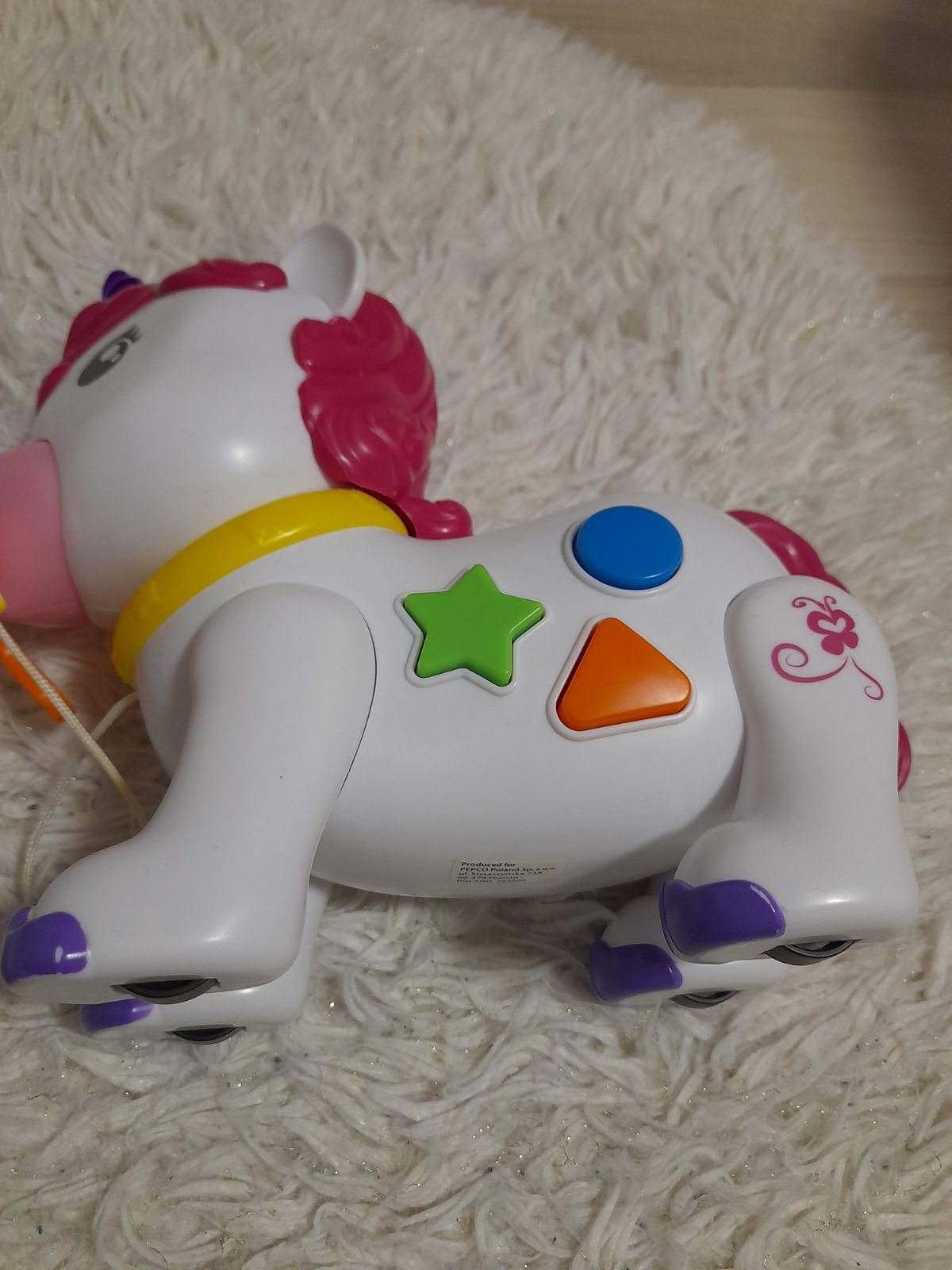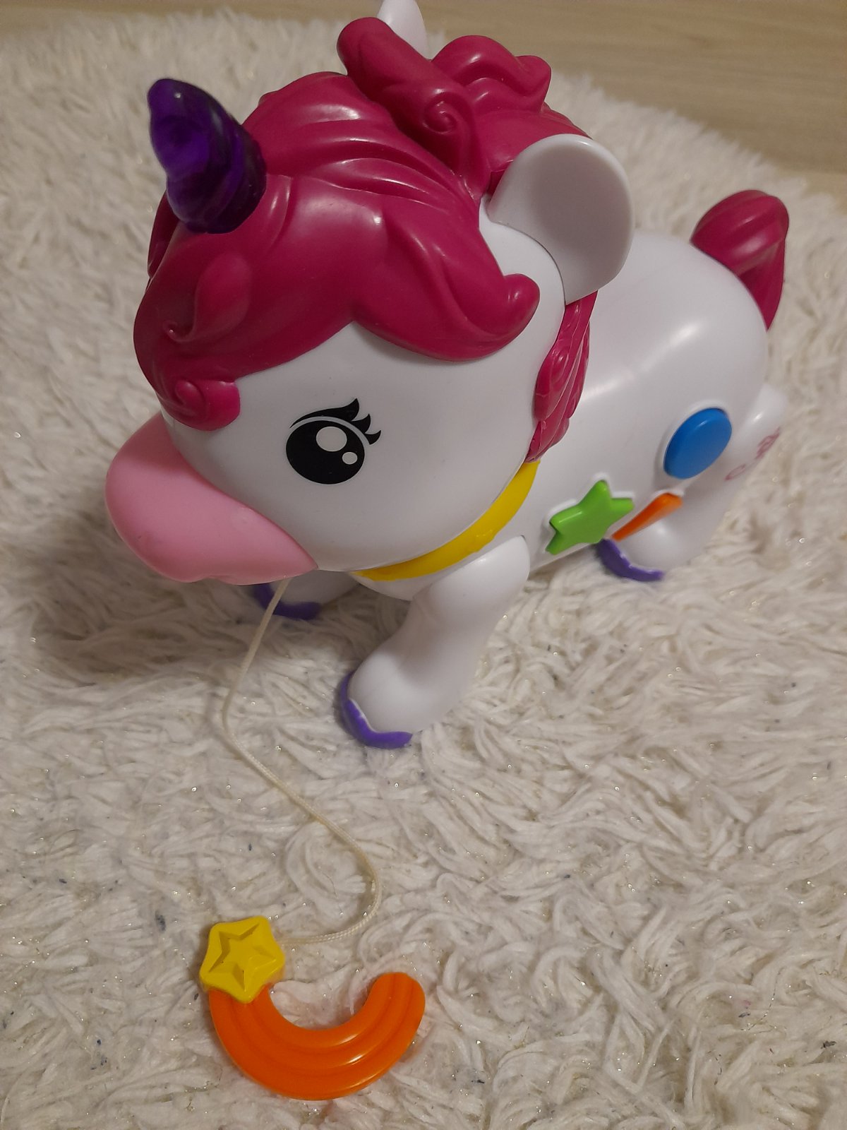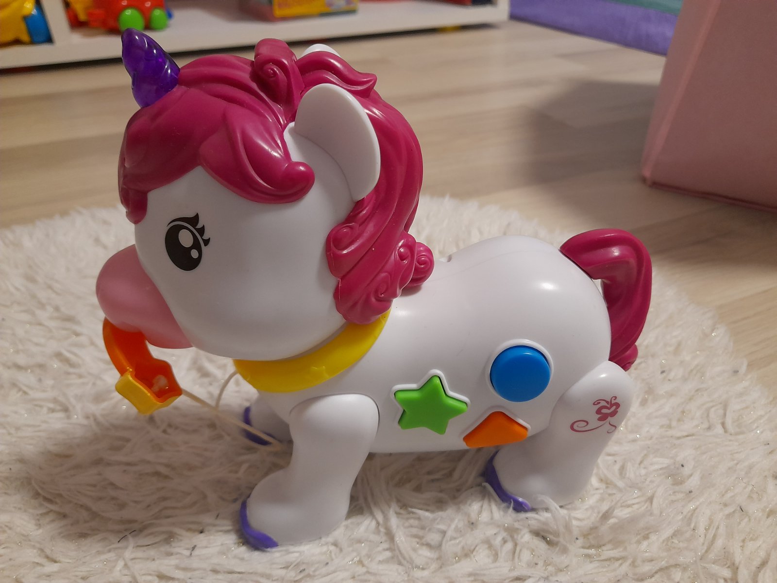 Interaktívny jednorožec na kolieskach. Hrá aj svieti. Dúha sa mu dá z pusy vyberať (ako cumlík :-) ) Bez poškodení.