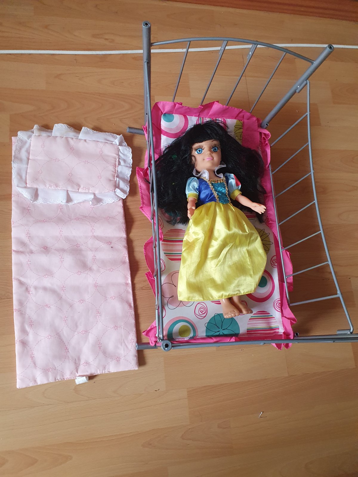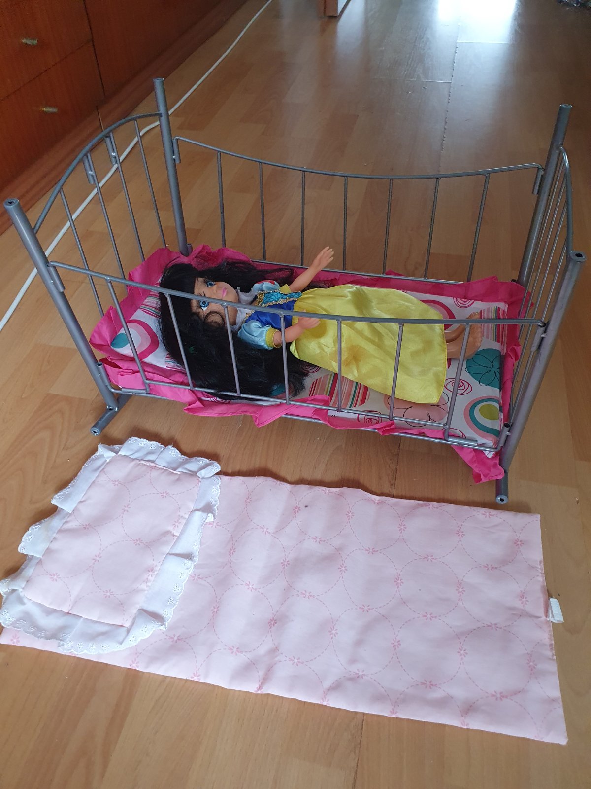 Predám postieľku-kolísku s poduškou a náhradnou poduškou a prikrývkou + bábika. Dĺžka postielky 46,5 cm a šírka 36 cm. Bez poškodenia.