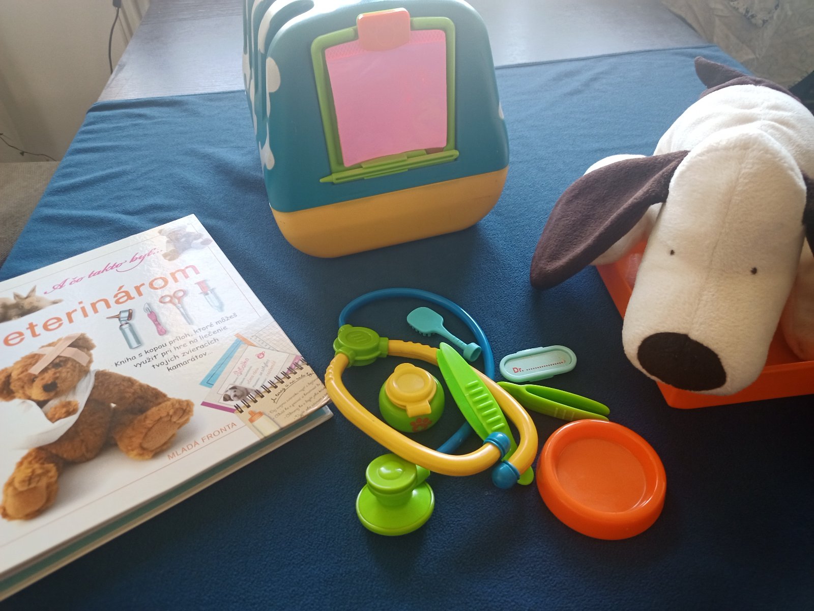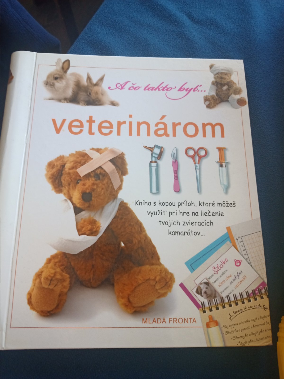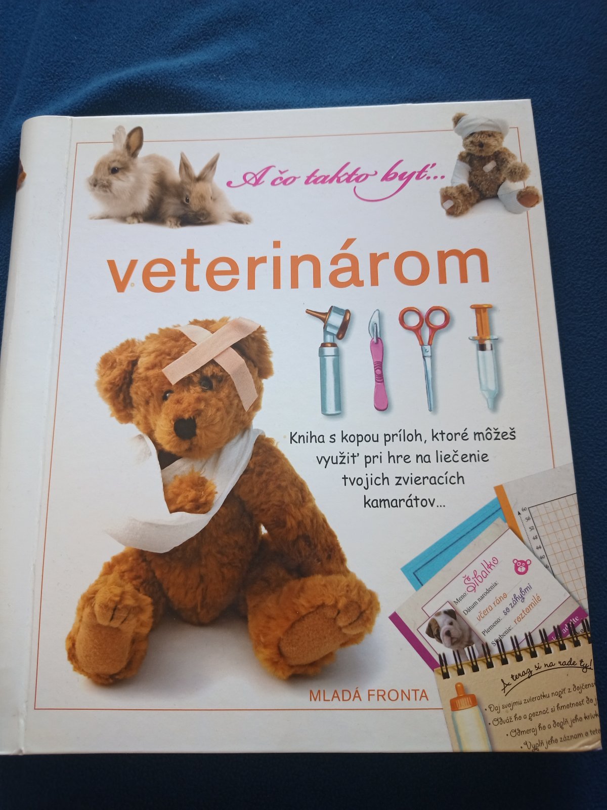 Set: veterinárna ambulancia. Kniha, psík, box na prenášanie, fonendoskop a iné nástroje zverolekára. Kniha je beznádejne vypredaná (100 % stav), Obsahuje popis práce veterinára, otváracie obálky, v ktorých sú napr. rentgenové snímky, zdravotná dokumentácia zvieratka, postupy liečenia... vrátane nálepiek a skladacích pomôcok (krabičky na lieky, krmivo, náplaste, ošetrujúci materiál). Psík (zn. Marks and Spencer), a box na prenášanie zvieratiek zn. ELC Mothercare (hranný). Náradie: fonendoskop, miska na krmivo, boxík na lieky, hrebienok na vyčesávanie srsti...