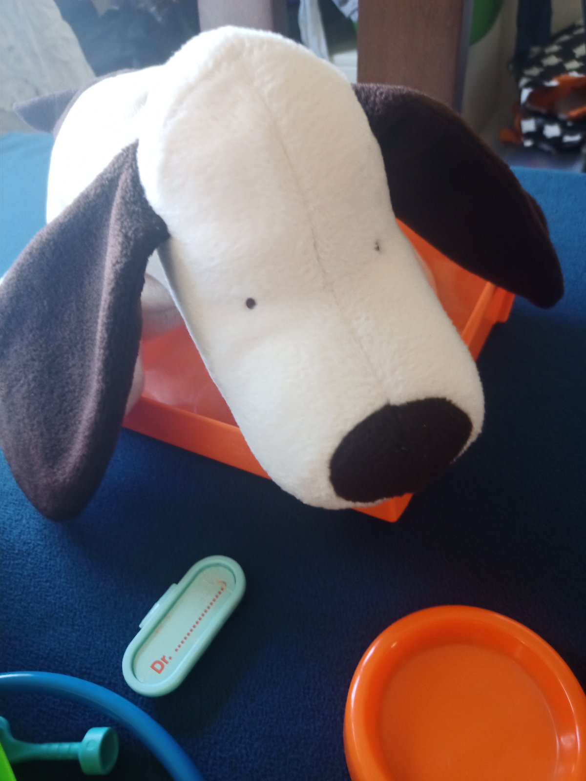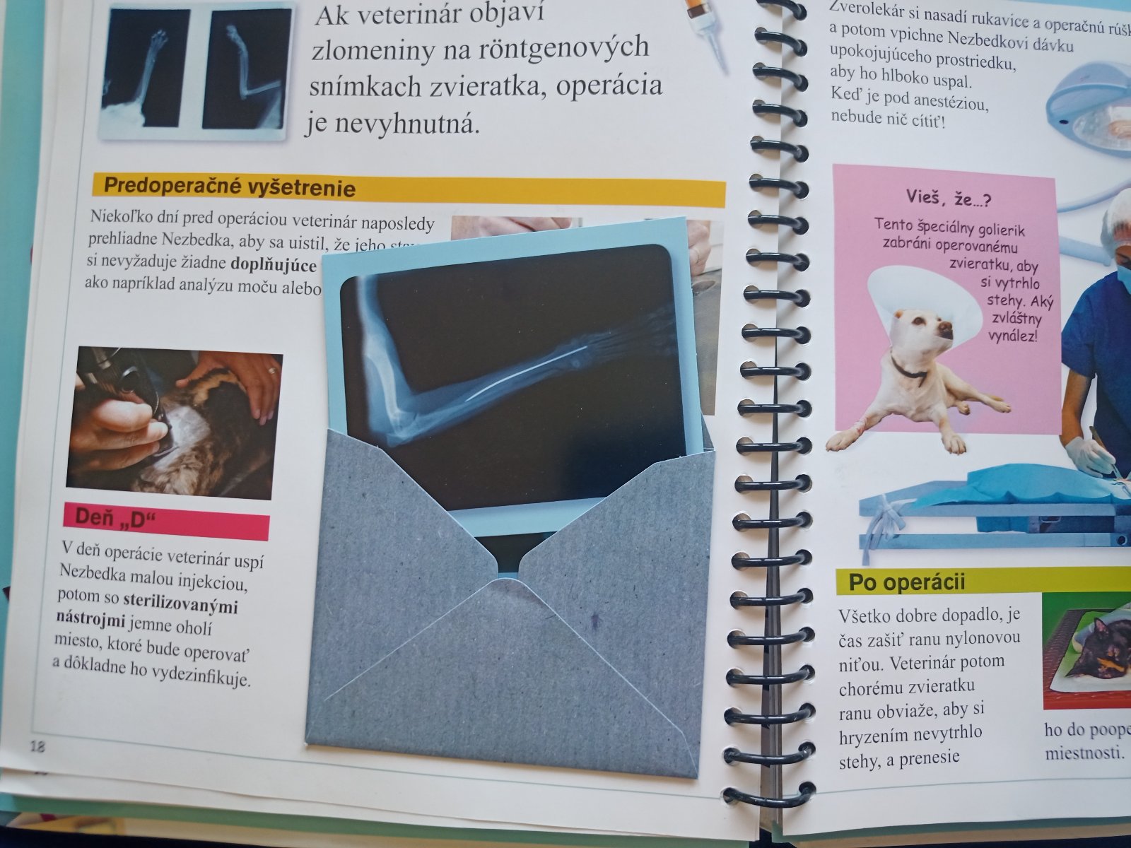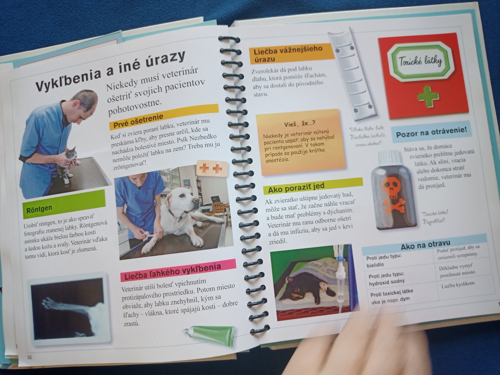 Set: veterinárna ambulancia. Kniha, psík, box na prenášanie, fonendoskop a iné nástroje zverolekára. Kniha je beznádejne vypredaná (100 % stav), Obsahuje popis práce veterinára, otváracie obálky, v ktorých sú napr. rentgenové snímky, zdravotná dokumentácia zvieratka, postupy liečenia... vrátane nálepiek a skladacích pomôcok (krabičky na lieky, krmivo, náplaste, ošetrujúci materiál). Psík (zn. Marks and Spencer), a box na prenášanie zvieratiek zn. ELC Mothercare (hranný). Náradie: fonendoskop, miska na krmivo, boxík na lieky, hrebienok na vyčesávanie srsti...