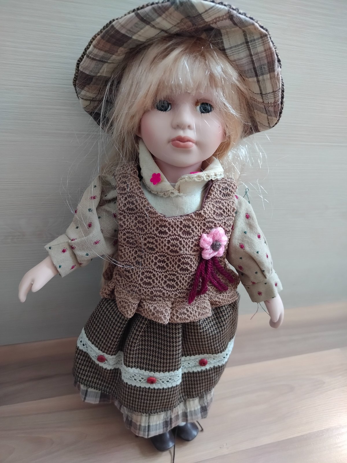 Popis: Blond vlasy s ofinou, veľký károvaný klobúk (hnedo-béžový). Detailný outfit: béžová blúzka s ružovými kvietkami, hnedá zamatová vesta s háčkovanou ružičkou, károvaná sukňa s čipkou a gombíkmi, čierne topánočky. Porcelánová hlava, ruky a nohy, telo textilné. Výška cca 40 cm.