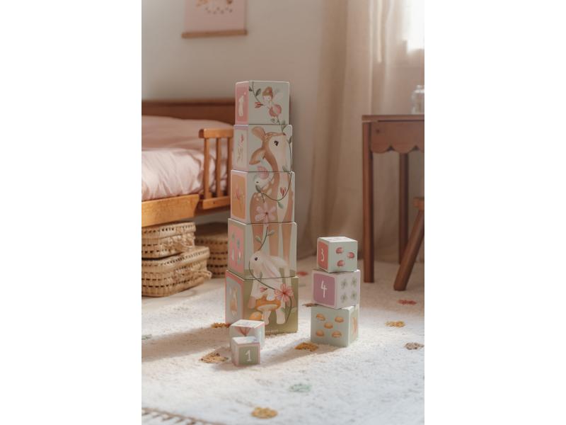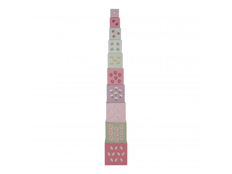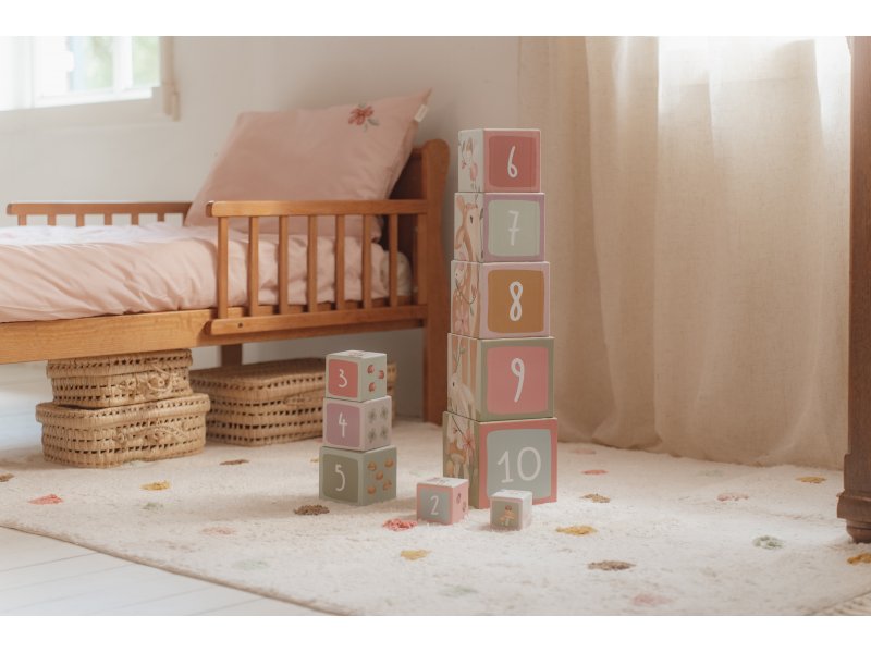 Farebné kartónové kocky s krásnymi ilustráciami motivov zo života na záhrade. Nechajte vaše dieťa kocky skladať na seba do vysokej veže alebo vedľa seba podľa veľkosti. V staršom veku sa dieťa s pomocou očíslovaných kociek môže hravým spôsobom učiť počítať aj rozpoznávať číslice.