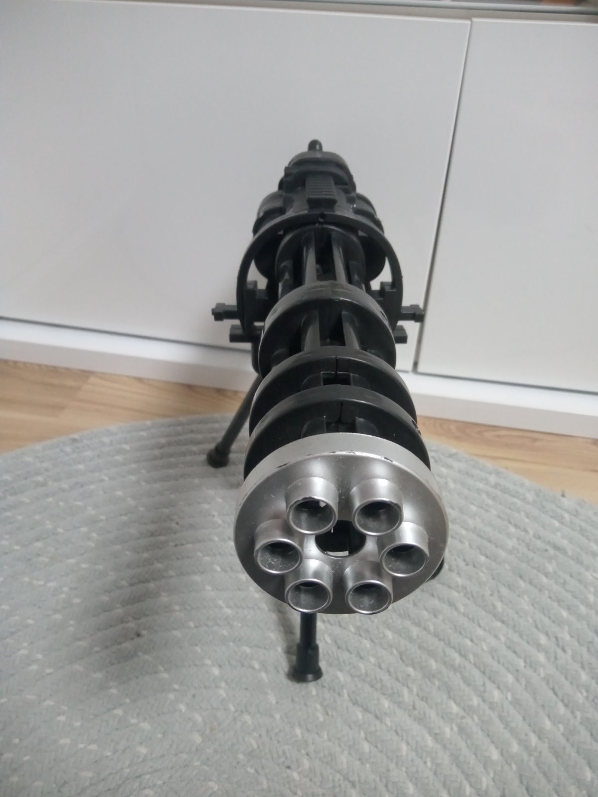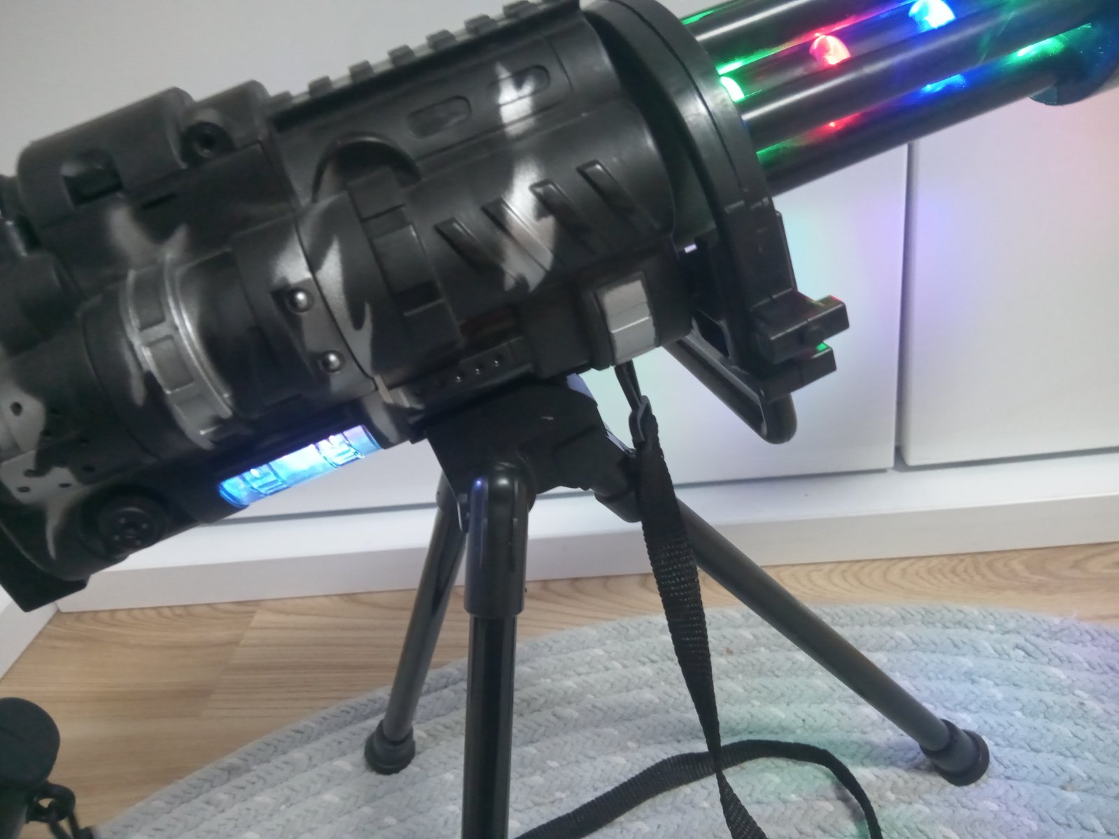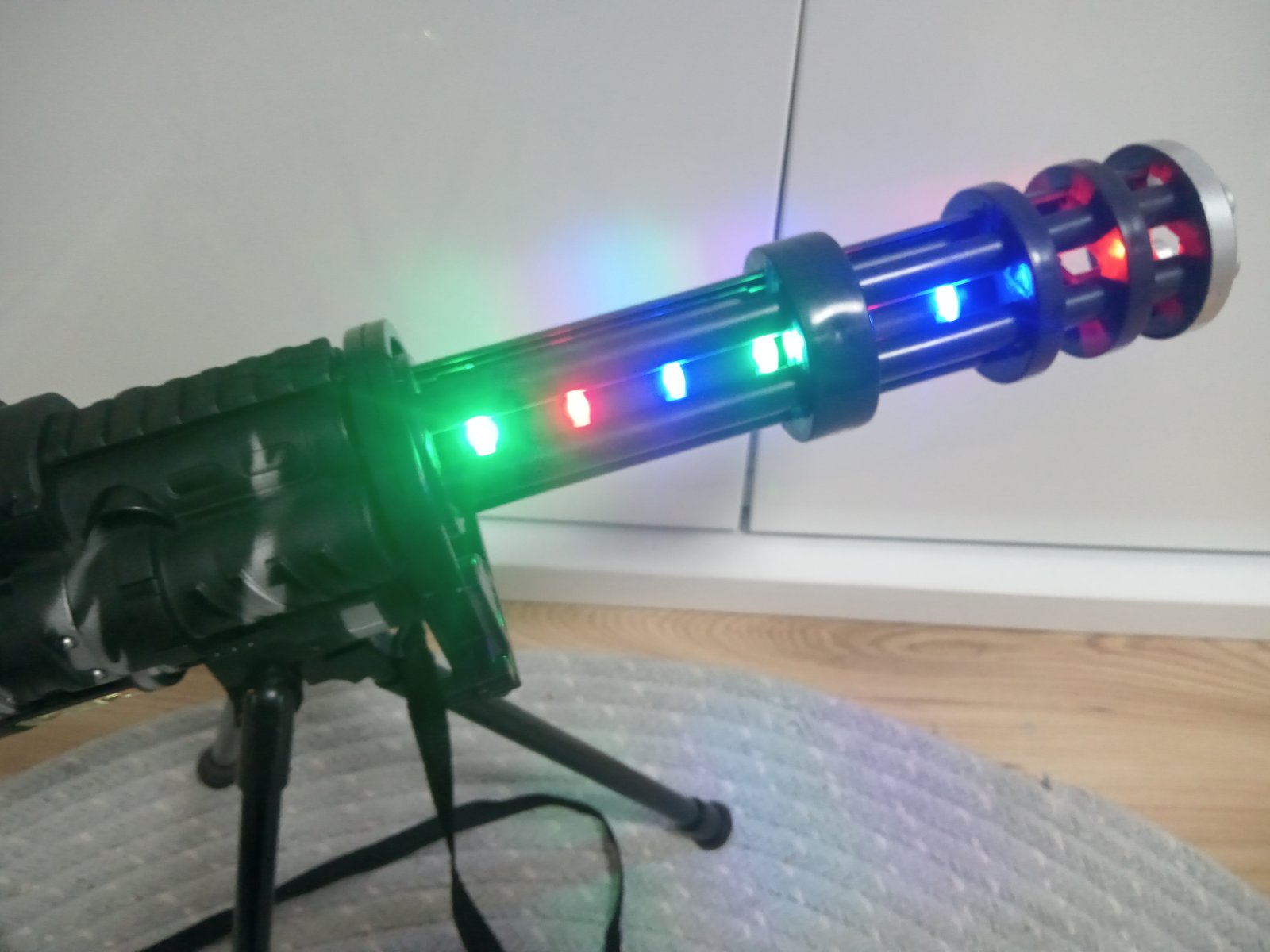 Guľomet svieti pri strielani , vydáva zvuk, na baterky, tie vnútorné svetlá rotuju pri strieľani sa sa dať dole z tej podpery,málo hraný