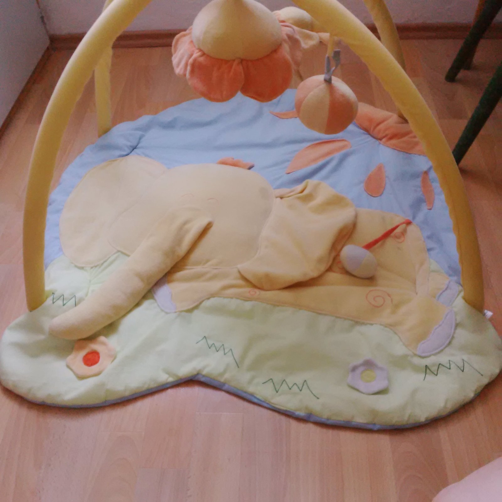 Predam hraciu deku s hrazdickou, je vidno pouzivanie. Zavesne hracky slon, kvietok (zrkadlo)je osuchane, gulicka (hrkalka). Na deke je tiez sustava kvetinka, hrkalkovy chvost a piskajuci chobot. Inak velmi pekna z prijemného materiálu