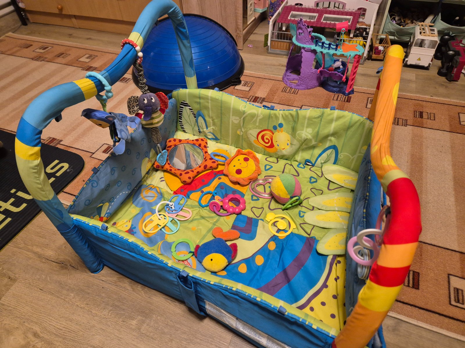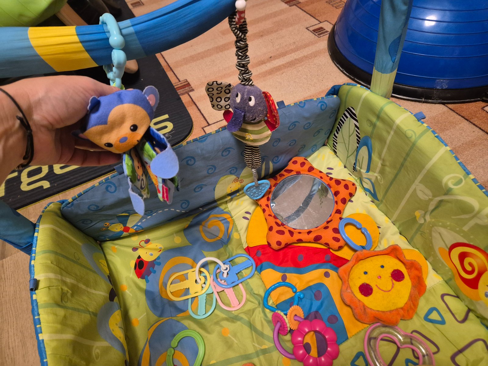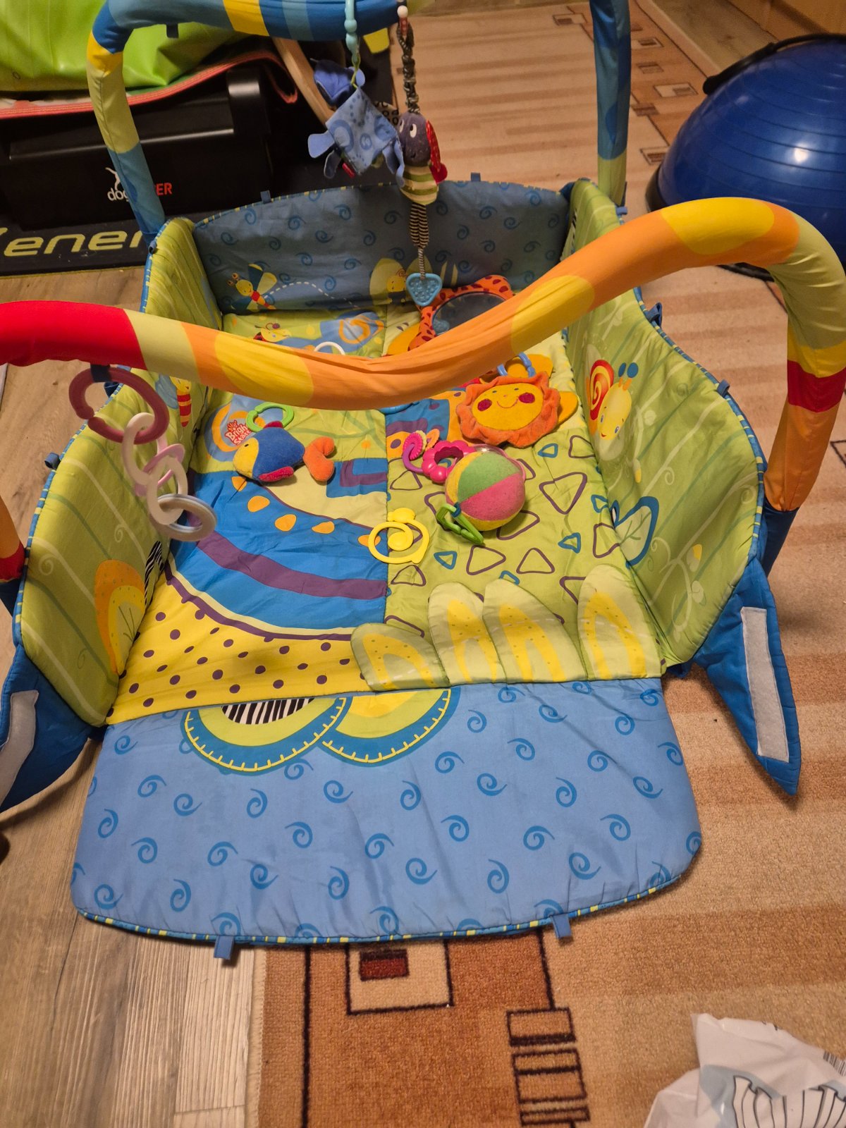 Hracia deka sa dá premeniť na bazénik,vystužená dvoma odnímateľnými hrazdičkami so závesnými hračkami.