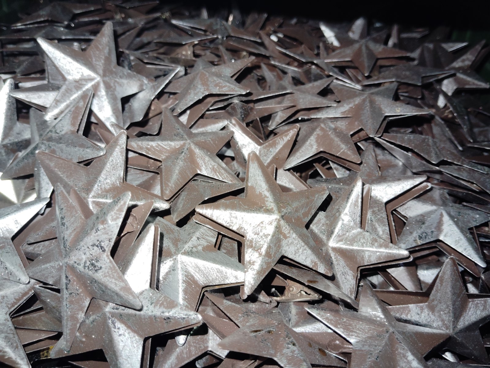 Kovové hviezdičky v striebornej farbe potiahnuté patinou sú obojstranné v strede je malý štipček na prichytenie