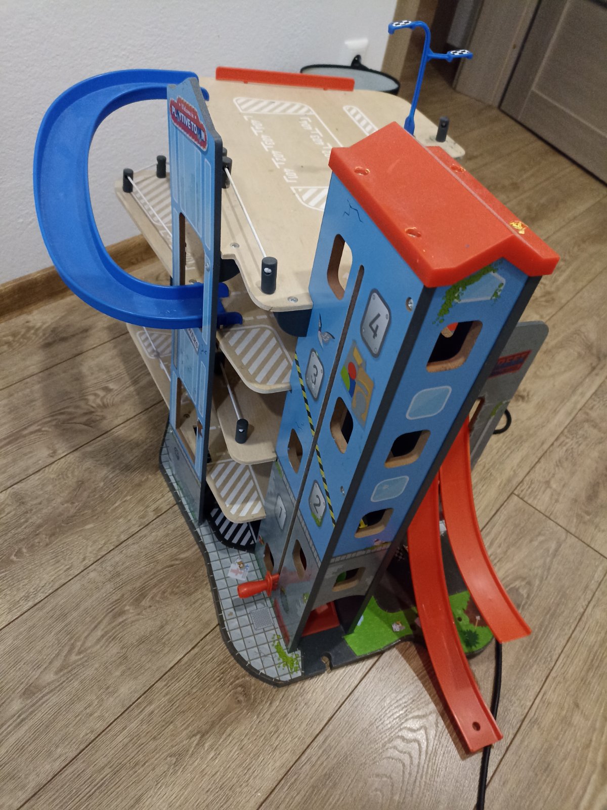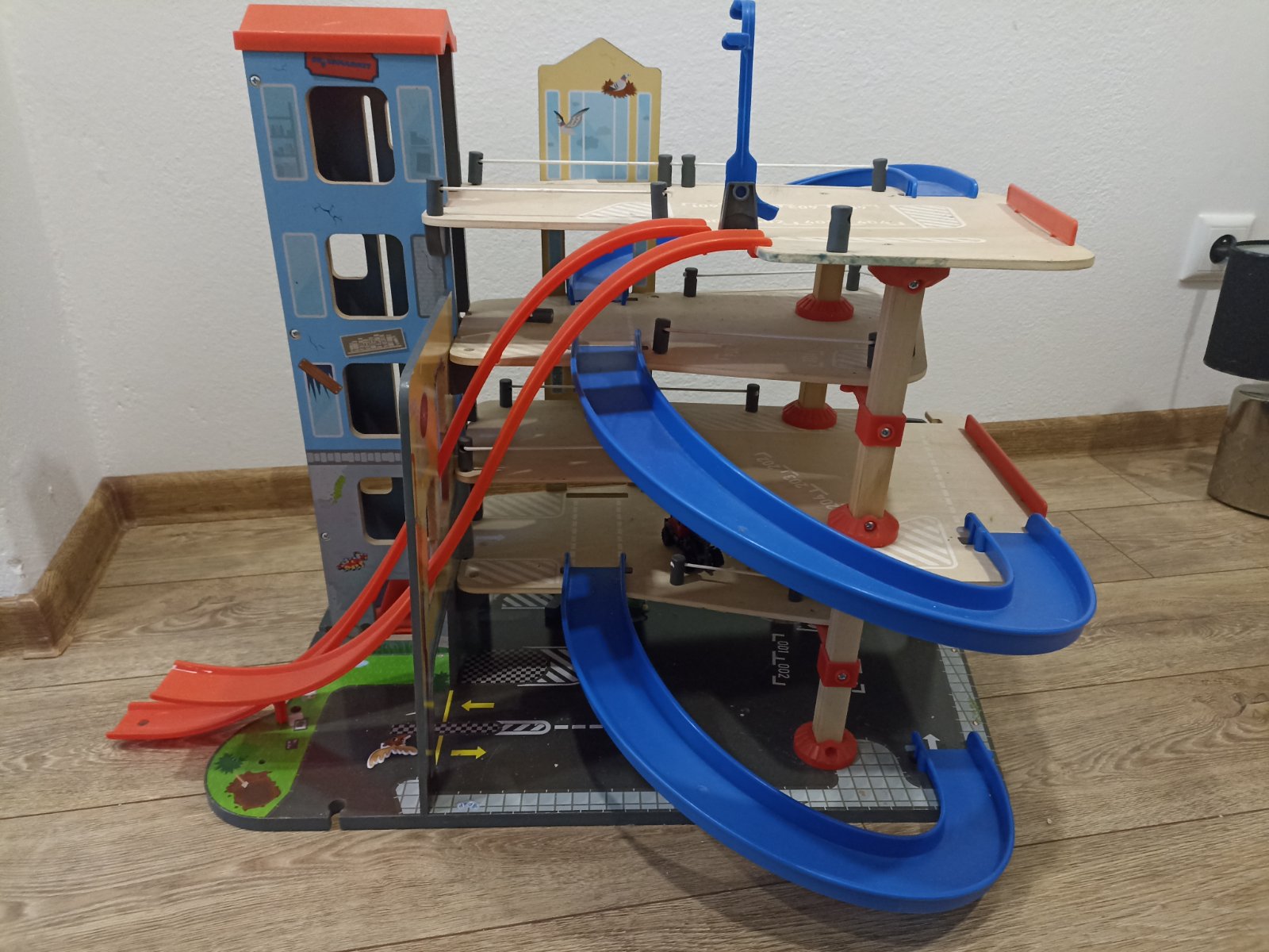 Garáž s autodráhou. Funkčná, vrch je trošku zašpinené z plastelíny a odlomená jedna cesta. Inak sa s ňou deti vedia dobre vyhrať.