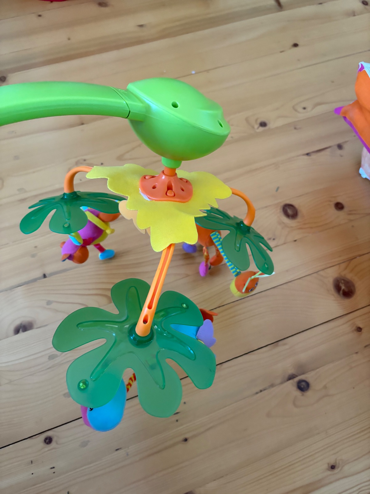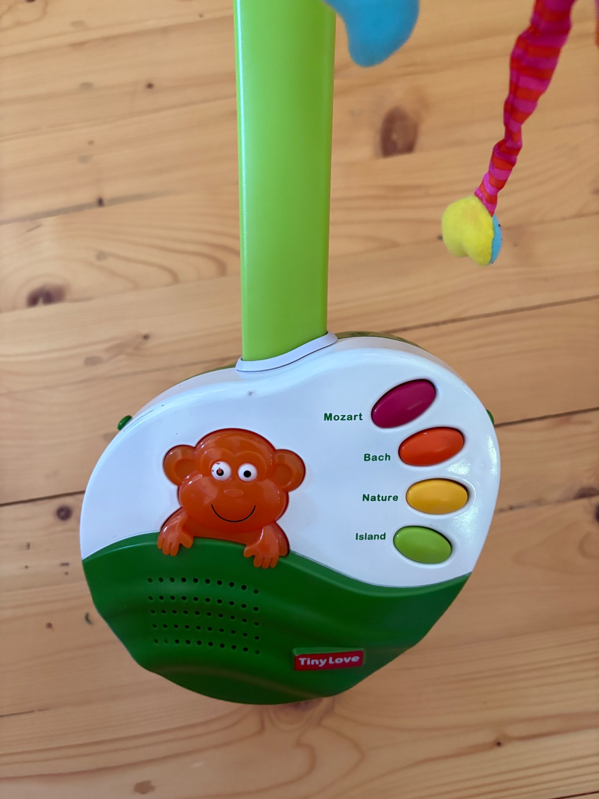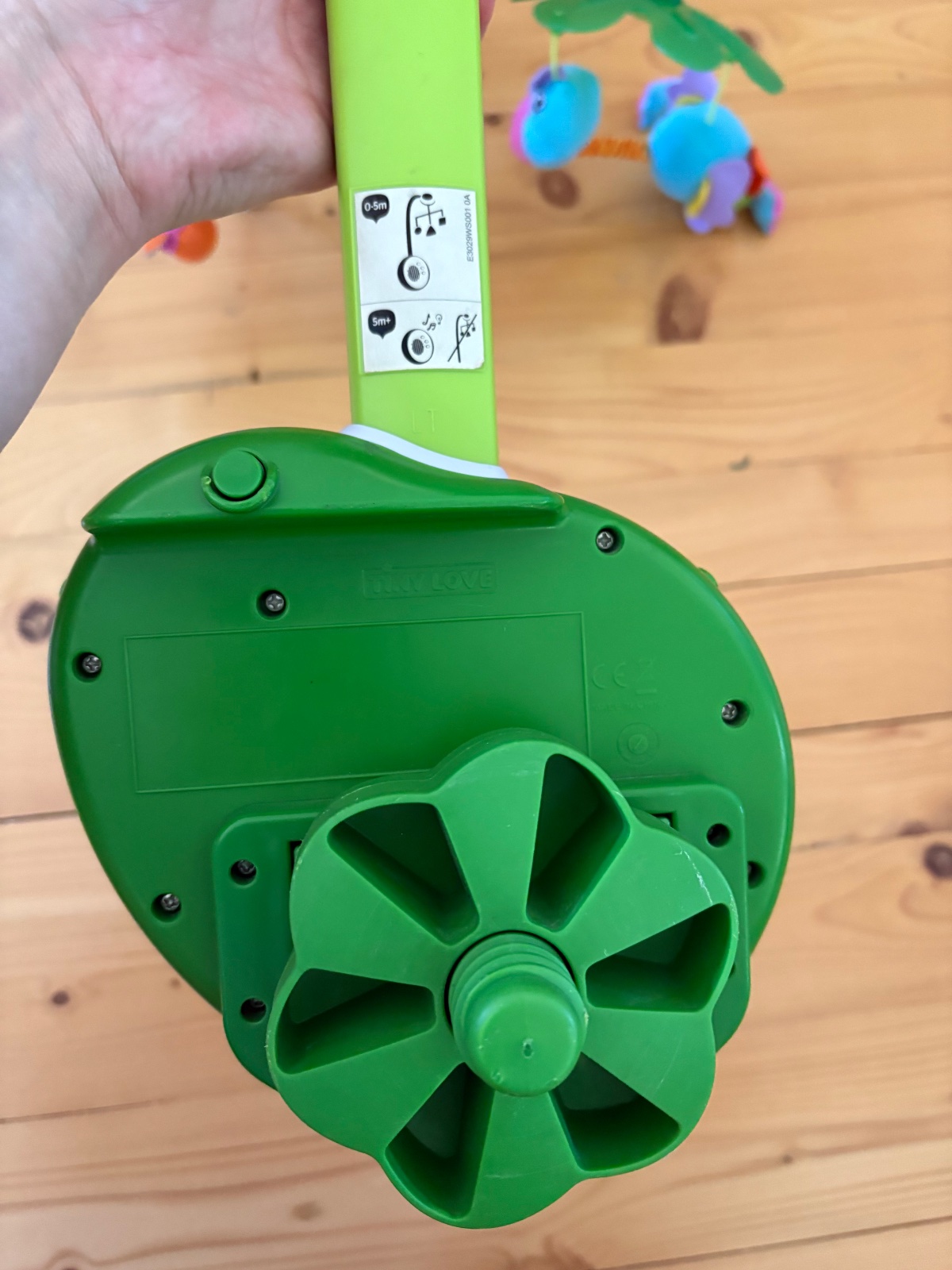Kolotoč Tiny Love sa otáča a hrá 4 melódie s možnosťou nastavenia hlasitosti, 2 klasické a 2 zvuky prírody, každá hrá 20 min