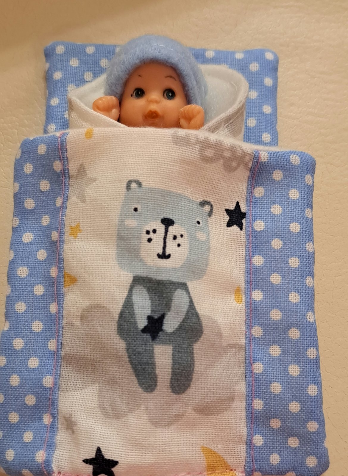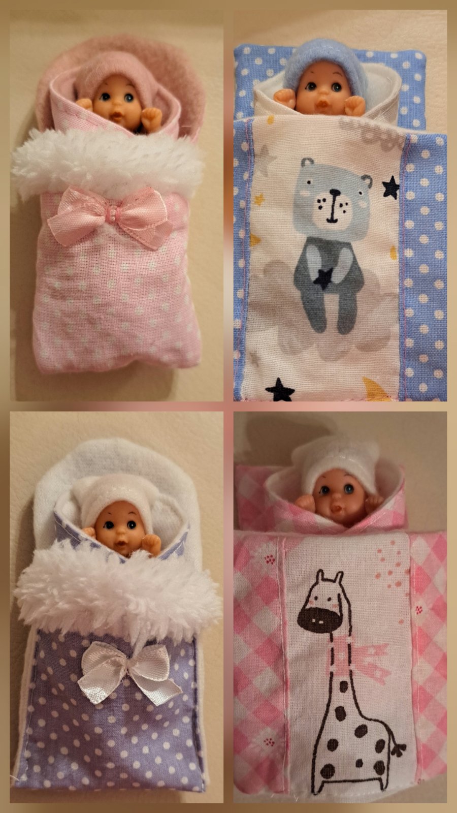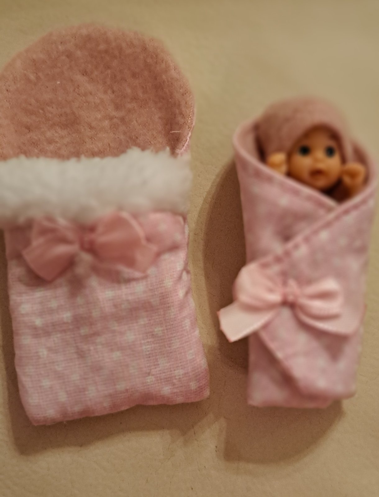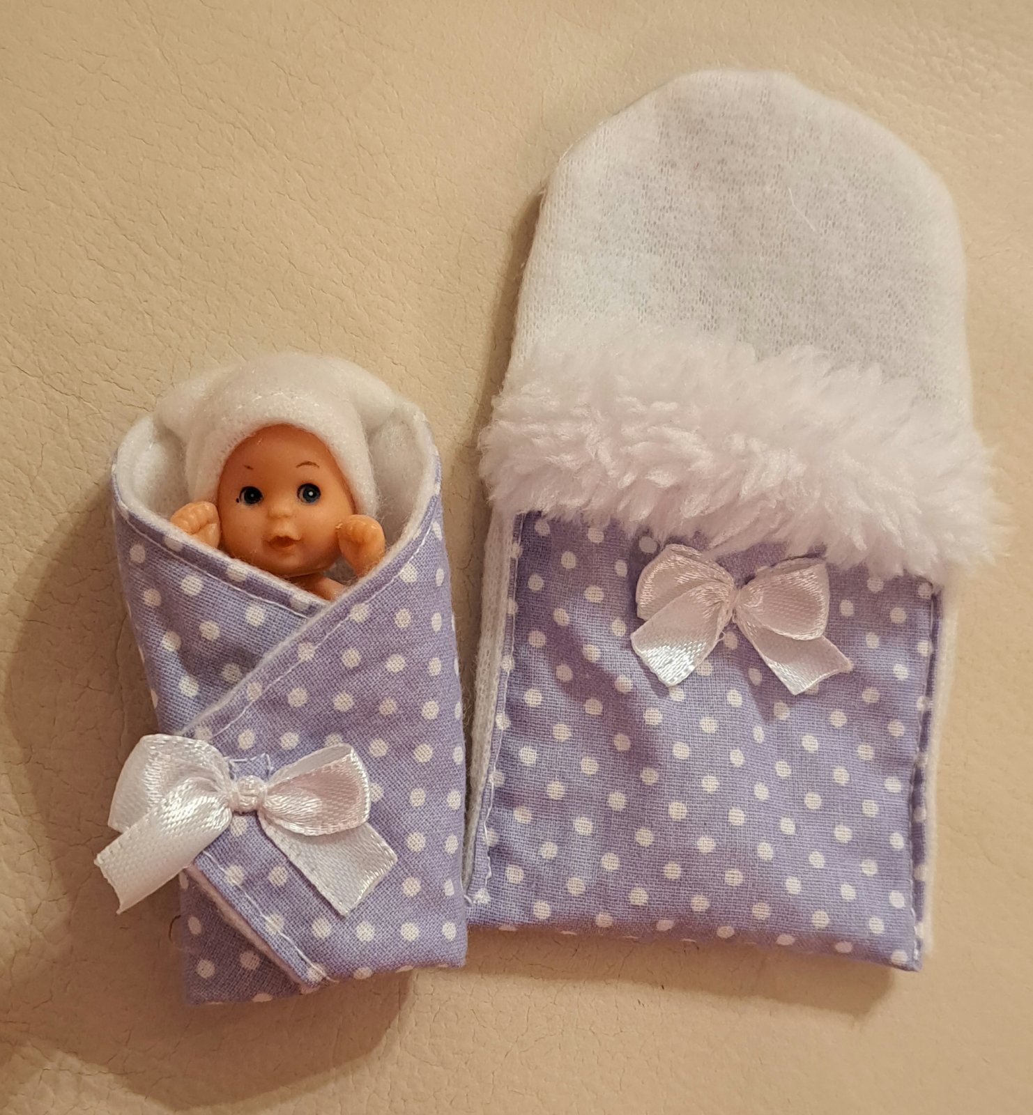 Doma šité, nehrané, zabalené fusaky a perinky pre 7-8 cm bábiky ( bábätká Barbie, Sindy, Steffy a pod.).