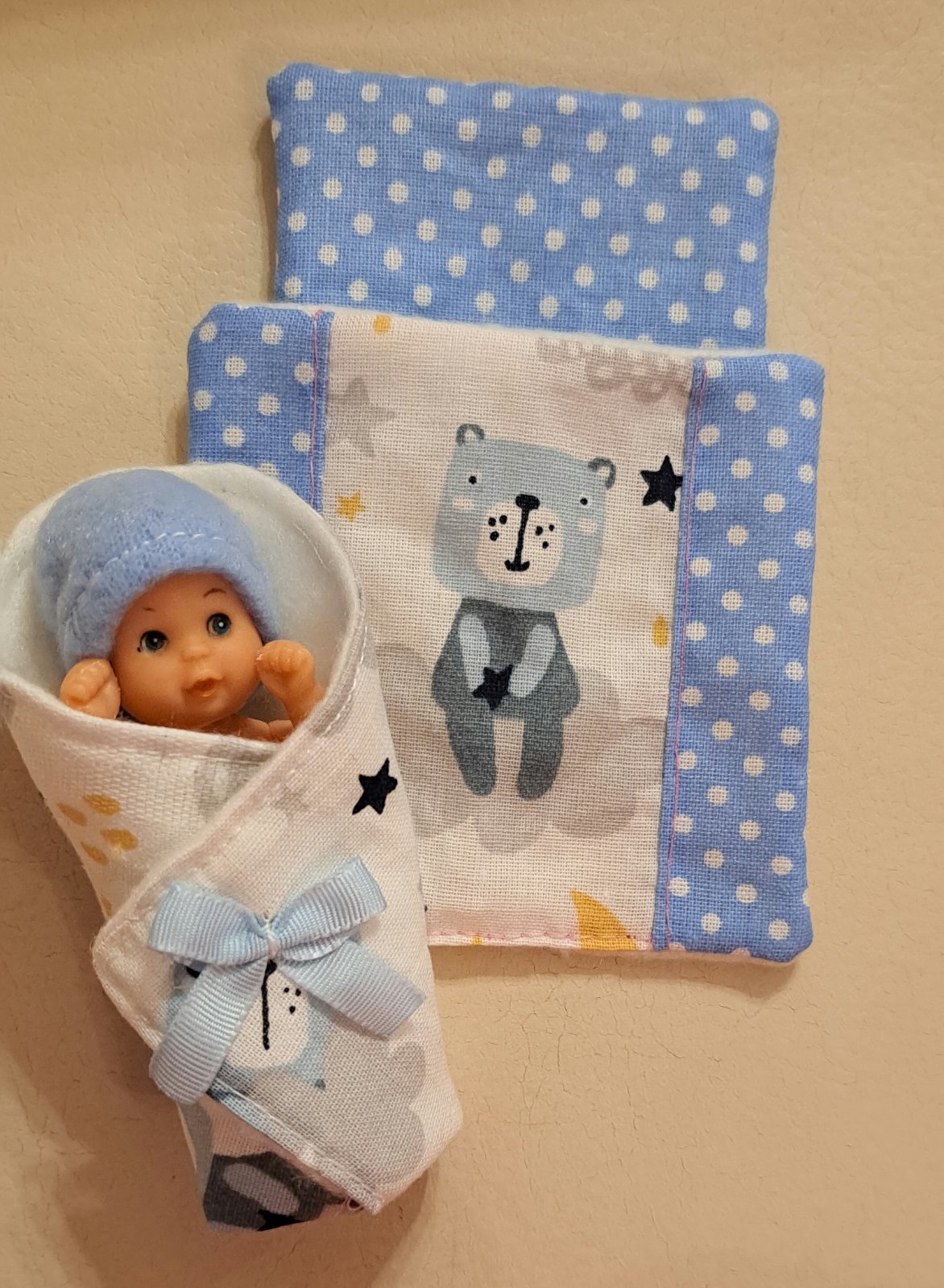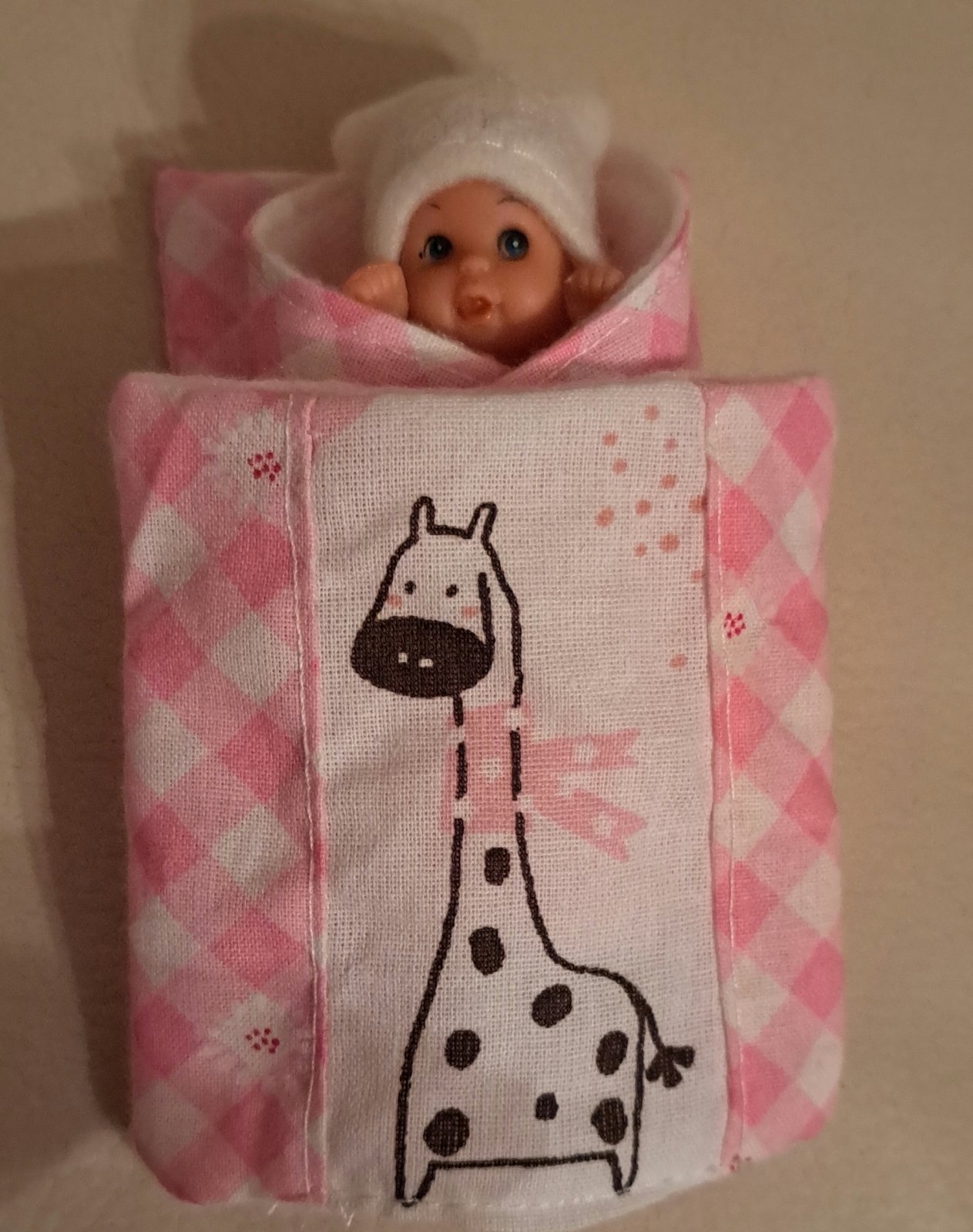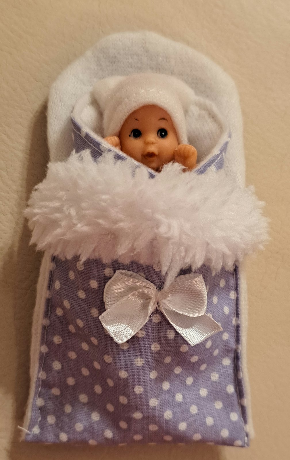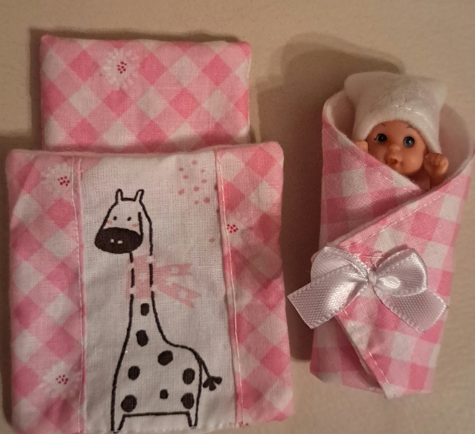 Doma šité, nehrané, zabalené fusaky a perinky pre 7-8 cm bábiky ( bábätká Barbie, Sindy, Steffy a pod.).