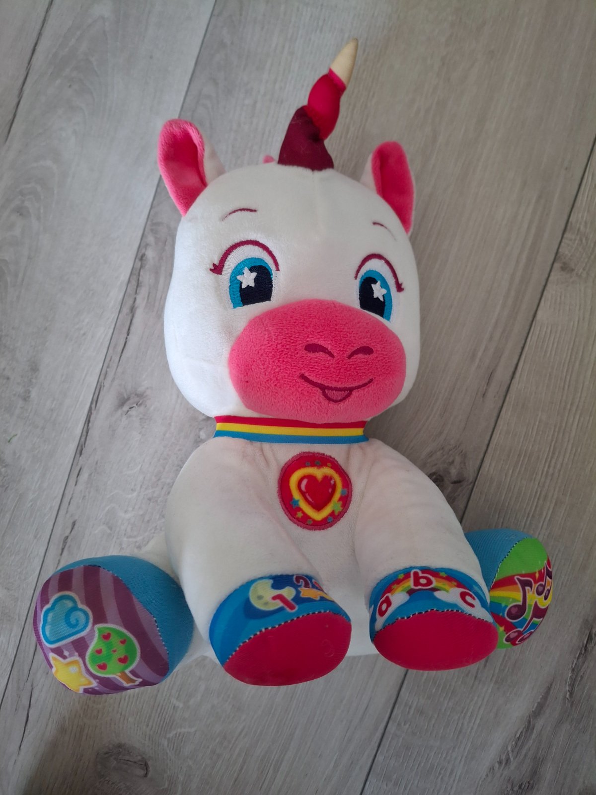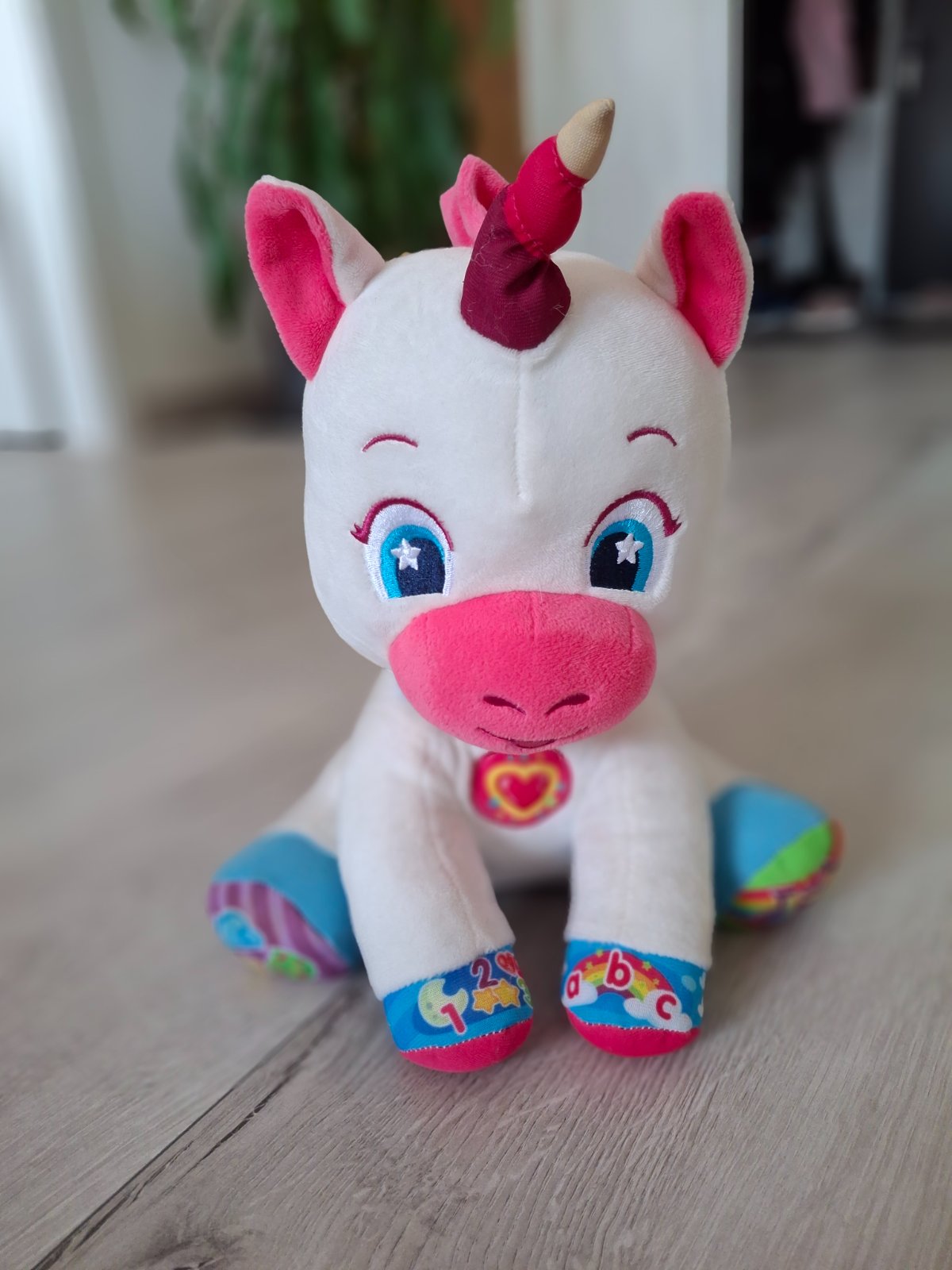 Roztomilý jednorožec od BABY CLEMENTONI prináša učenie hrou pre najmenších. Má 5 interaktívnych tlačidiel na výučbu čísiel, písmen, tvarov a farieb, hovorí po česky, slovensky a maďarsky, hrá pesničky a riekanky a jeho líčka a rožtek svietia. Mäkučký plyš podporuje hmatové a sluchové vnímanie a prvé logické asociácie.