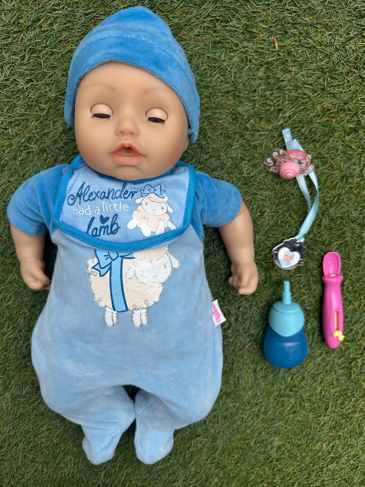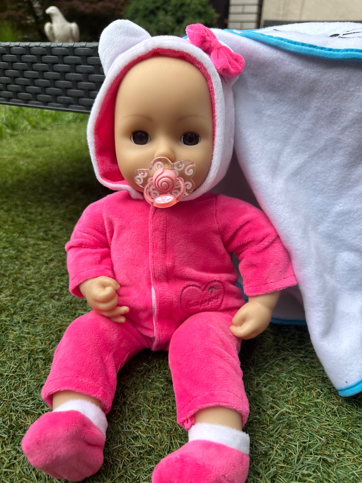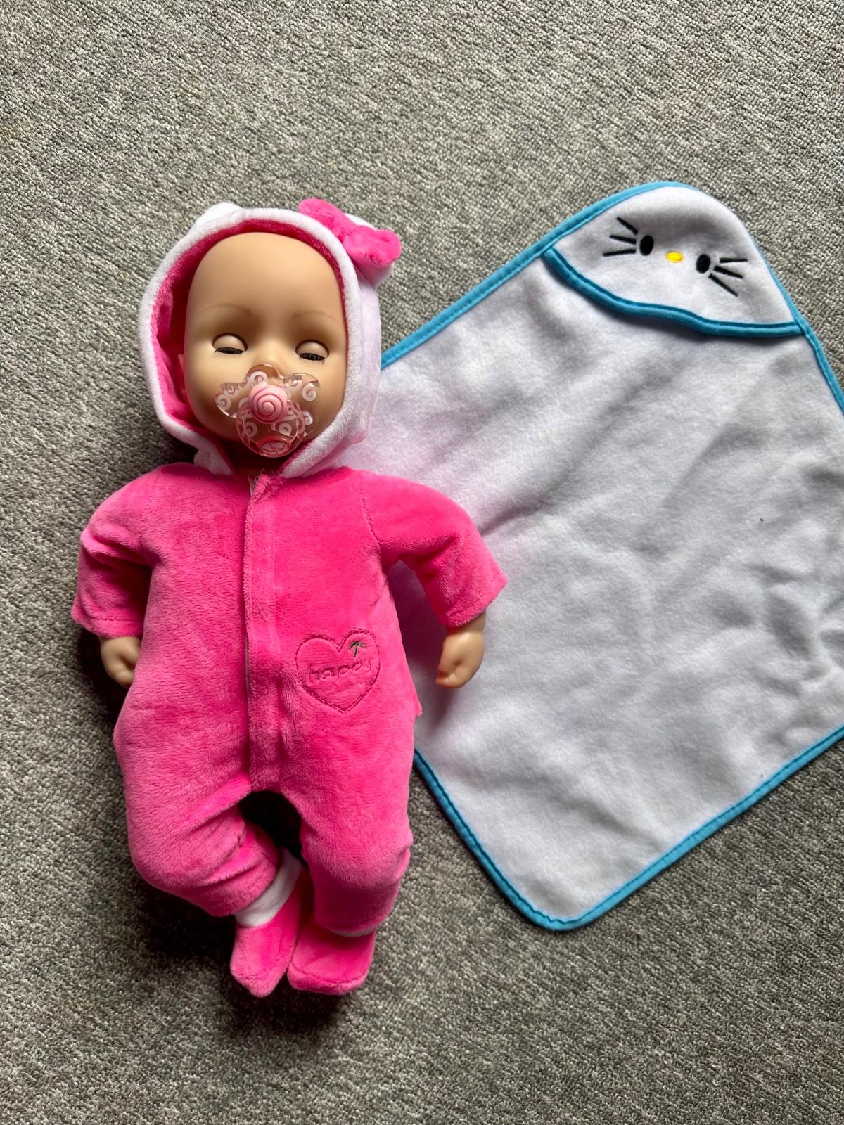 Málo hraný, plne funkčný, vymenila som aj baterky. Vydáva rôzne zvuky a hýbe pusinkou, keď cmúľa cumlík. Cumlík máme už iba tento ružový, tiež originál Baby Annabell. V prípade záujmu pribalím aj ružový Hello Kitty overal s podložkou a ChouChou overal (na posledných fotkách)