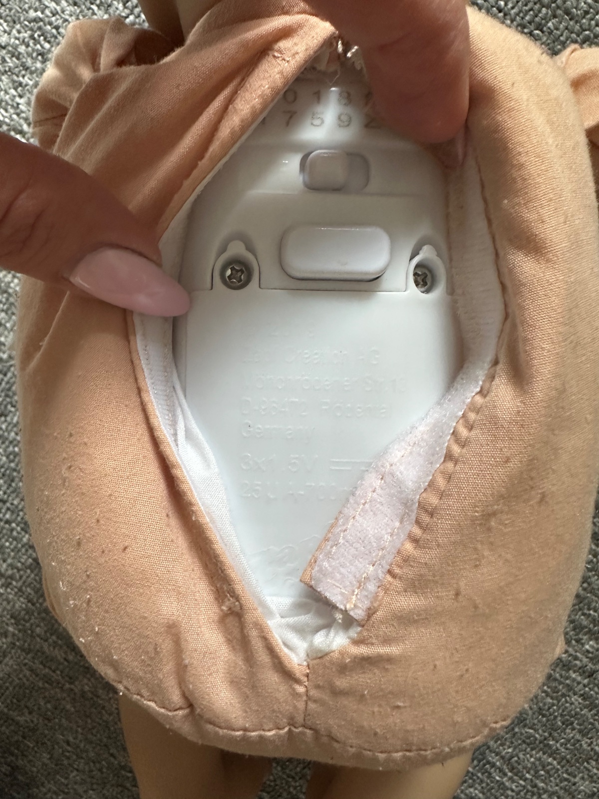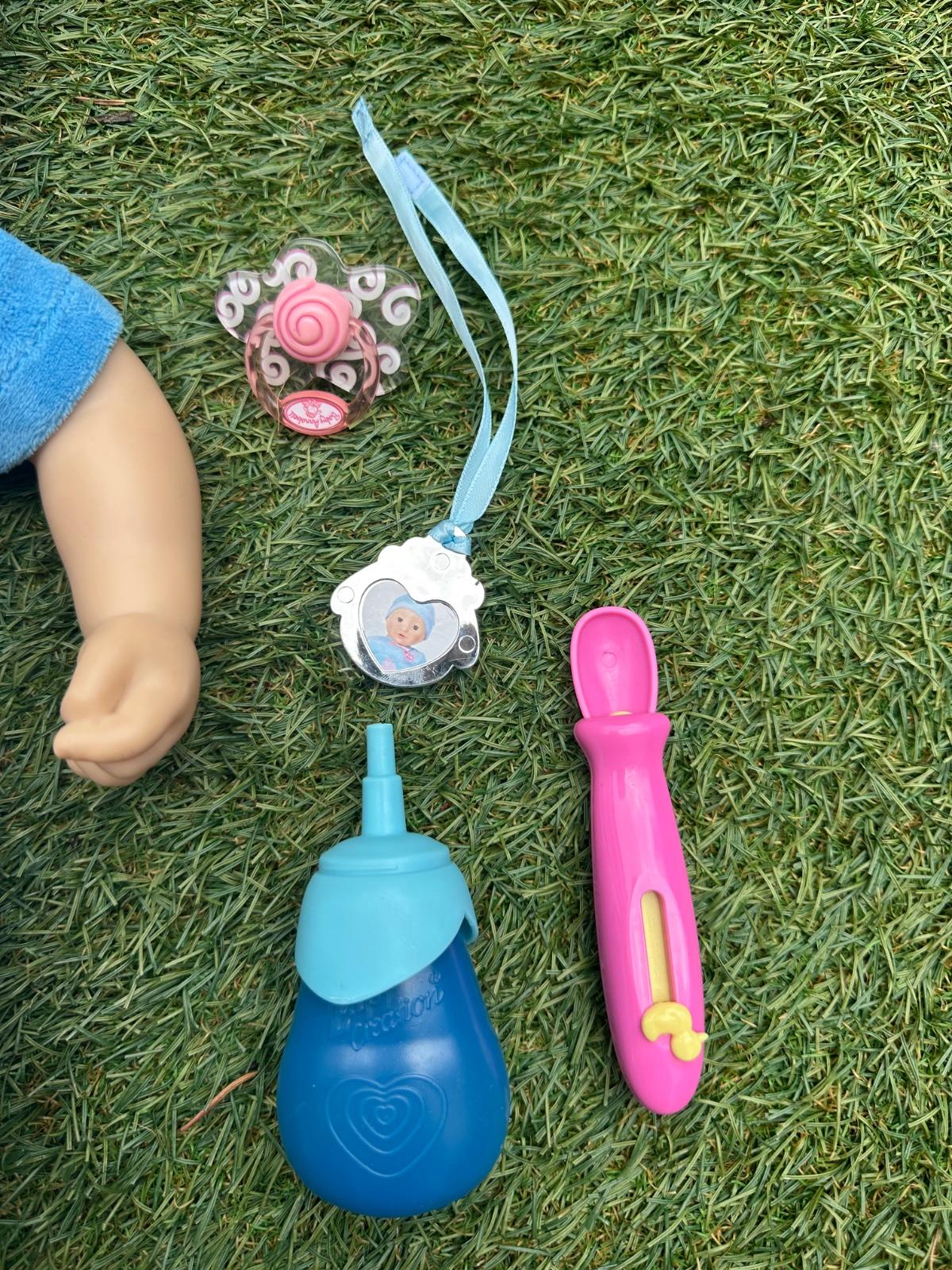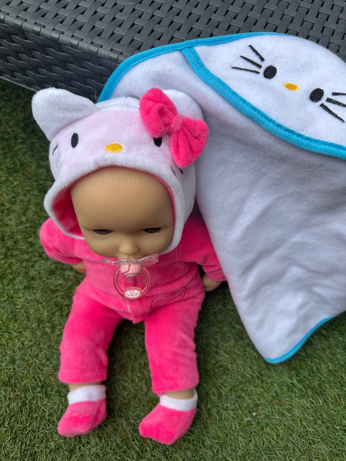 Málo hraný, plne funkčný, vymenila som aj baterky. Vydáva rôzne zvuky a hýbe pusinkou, keď cmúľa cumlík. Cumlík máme už iba tento ružový, tiež originál Baby Annabell. V prípade záujmu pribalím aj ružový Hello Kitty overal s podložkou a ChouChou overal (na posledných fotkách)